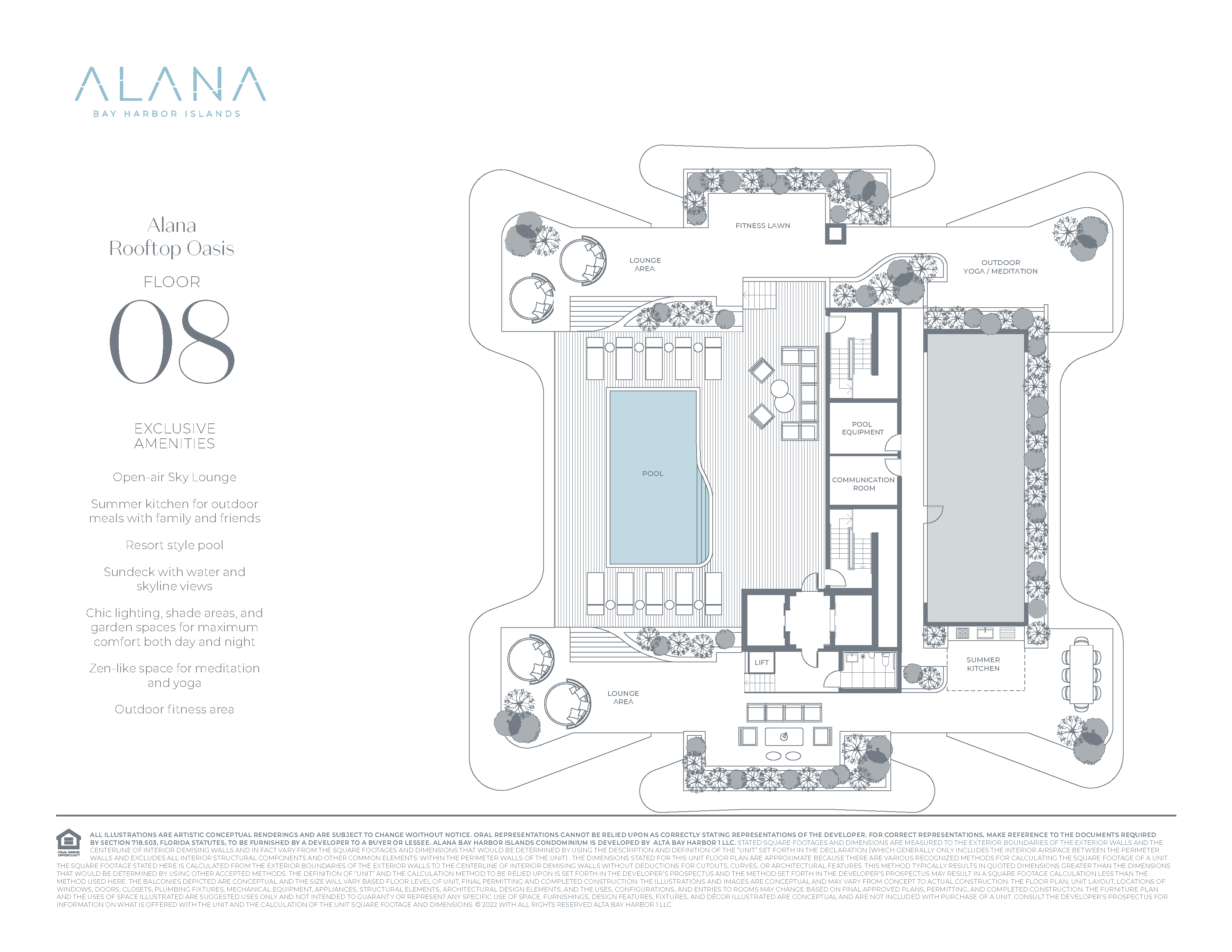 Complementing the luxurious residences are a host of world-class amenities that cater to residents' every need. The rooftop sky lounge offers a tranquil retreat where residents can unwind while enjoying panoramic views of the bay. The sundeck, adorned with lush landscaping, provides a serene setting for relaxation and rejuvenation, while the fully equipped fitness center allows residents to maintain an active lifestyle. Additionally, the resident's social room serves as a communal space where neighbors can gather and socialize, fostering a sense of community and belonging. Security cameras and staff encircle the premises and high-speed wi-fi is available throughout all common areas.Situated in the prestigious Bay Harbor Islands neighborhood, Alana offers residents unparalleled access to the best of South Florida living. From pristine beaches and upscale shopping destinations to fine dining establishments and cultural attractions, residents have an abundance of amenities and activities at their fingertips. With top-rated schools, parks, and family-friendly attractions nearby, Alana provides an idyllic setting for families to thrive and create lasting memories in a truly exceptional environment.