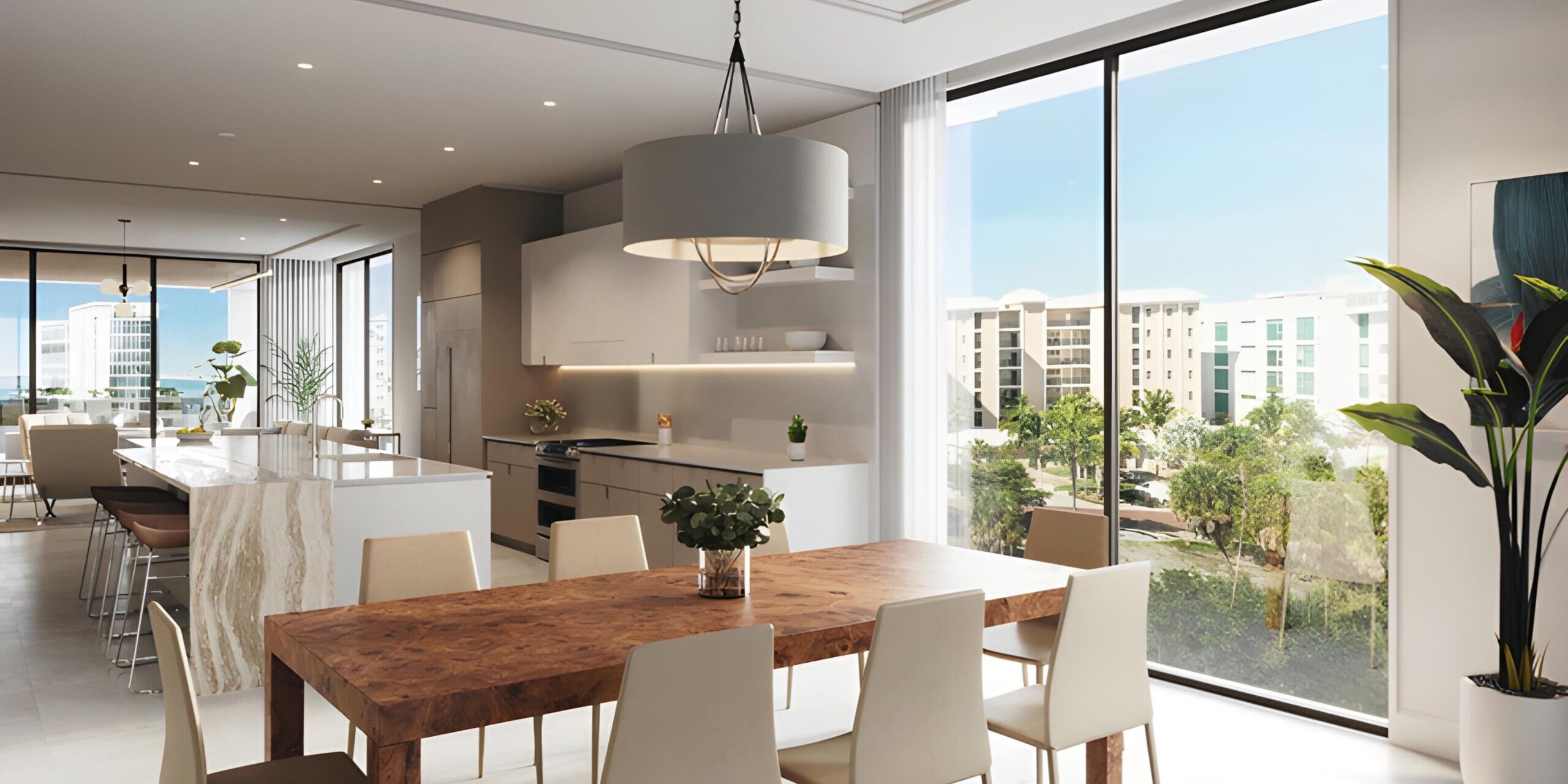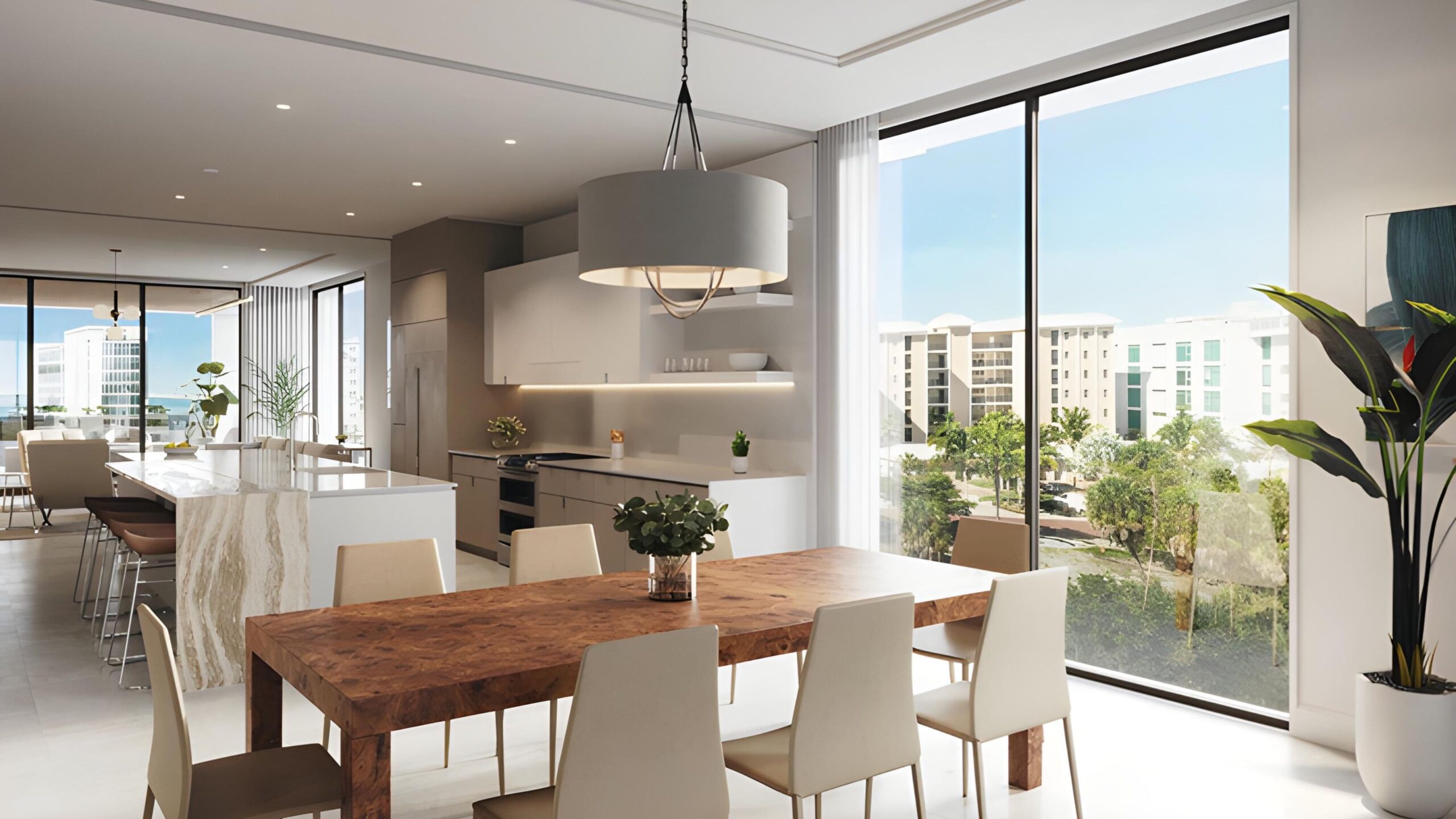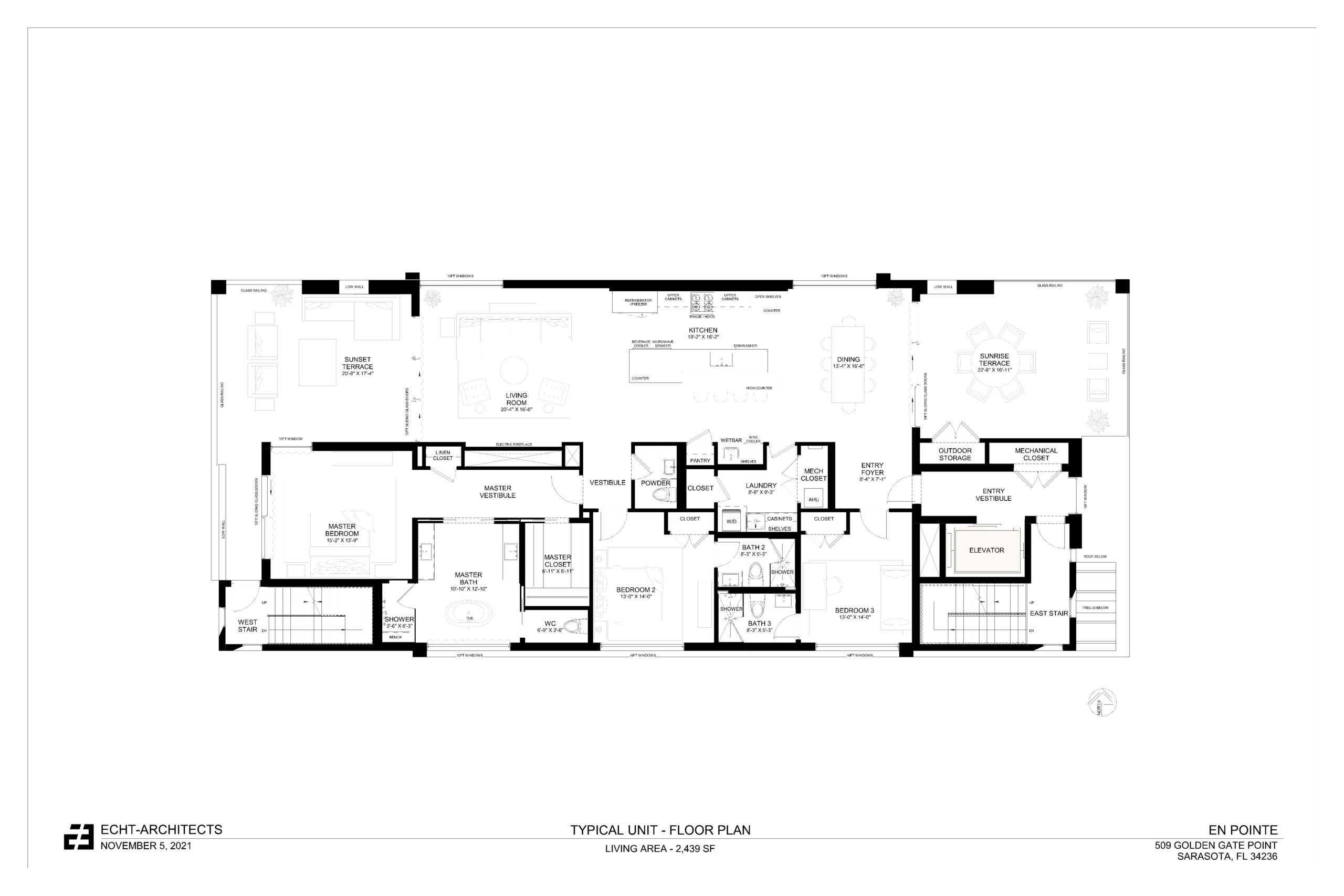 Set to redefine luxury urban living, En Pointe is a boutique condominium in Sarasota's burgeoning Rosemary District. Scheduled for completion in early 2024 by Nautilus Homes, this exclusive property features just four residences, each occupying a full floor with 2,439 square feet of interior space and a total of 3,115 square feet including terraces. These three-bedroom, three-and-a-half-bath units blend mid-century modern inspiration with cutting-edge design, boasting dual east and west terraces that frame stunning city and neighborhood views. Residents will benefit from private elevator access, adding an extra layer of privacy and luxury to the already impressive offerings.Inside each residence, the open concept floor plan emphasizes spaciousness and light, with floor-to-ceiling windows and 10-foot ceilings enhancing the sense of openness. The heart of the home is a chef-inspired kitchen featuring top-of-the-line Scavolini cabinets, Quartz countertops, and a suite of integrated Sub-Zero and Wolf appliances. The living areas, designed for both relaxation and entertainment, include sleek white oak and stone feature walls, a sophisticated 74-inch electric fireplace, and direct access to spacious private terraces equipped with built-in gas grills, perfect for indoor-outdoor living. Each master suite serves as a luxurious retreat, complete with expansive walk-in closets, spa-like bathrooms featuring twin vanities, freestanding tubs, and frameless glass showers.