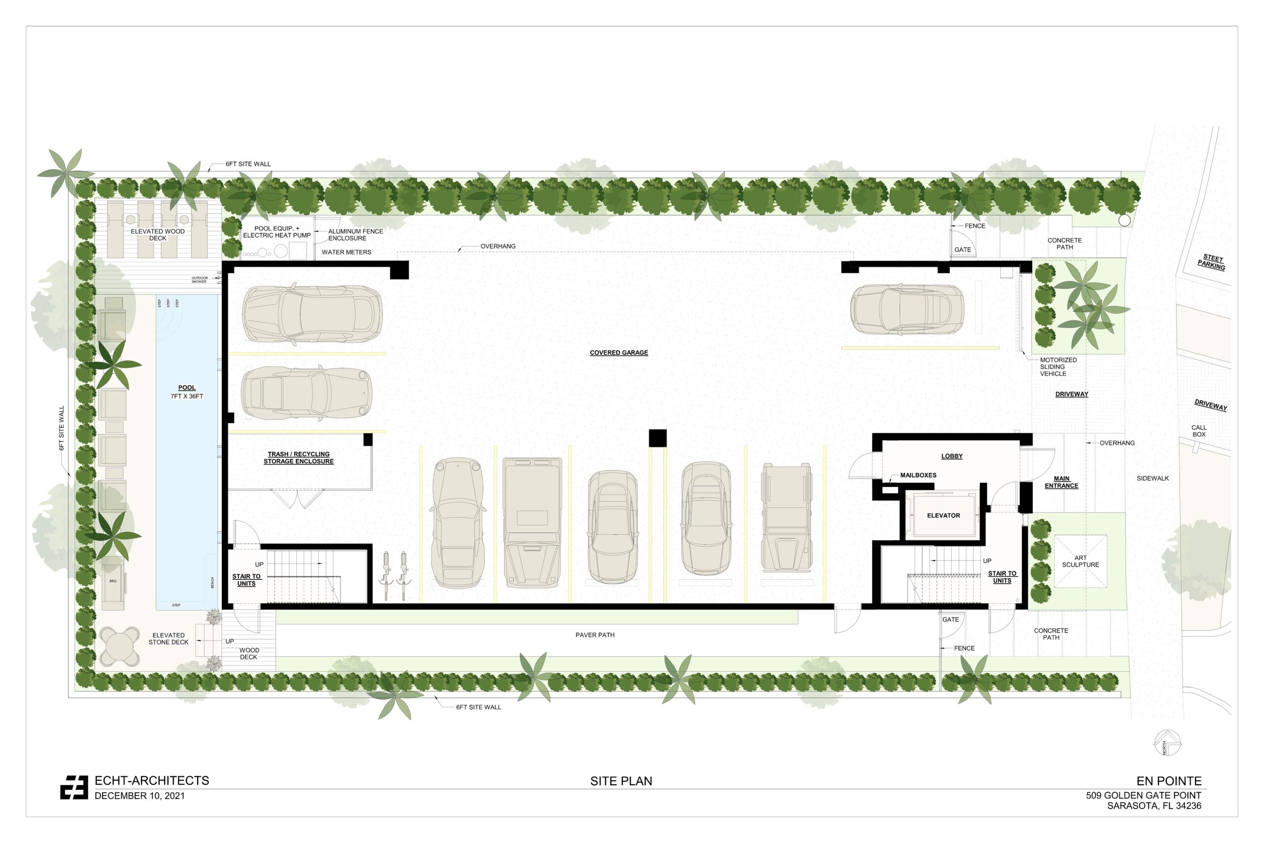 En Pointe doesn't just offer luxurious private residences but also boasts an array of thoughtfully designed building amenities. These include a dual-entry heated salt-water pool on a raised terrace, a state-of-the-art fitness studio, secure bike parking, and two covered parking spaces per unit with electric car charging stations. The property also features advanced security systems including CCTV, fob and keypad entry, ensuring a safe and private environment for all residents. A stylish shared lobby and mail room enhance the community feel, while the dedicated outdoor shower and BBQ deck offer additional comfort and convenience.The neighborhood surrounding En Pointe is as dynamic as it is serene, located on Golden Gate Point, a prime area just east of the Ringling Causeway and steps from the heart of downtown Sarasota. Residents can enjoy easy access to the cultural and recreational activities that the area is renowned for, including Marina Jack, Hart’s Landing, and the scenic Island Park. Fine dining, lively bars, and boutique shopping along Main Street and Palm Avenue are just a stroll away, while the proximity to St. Armand’s Circle and Lido Beach offers endless opportunities for relaxation and entertainment. With its central location and luxurious amenities, En Pointe provides an ideal setting for those seeking a sophisticated yet vibrant lifestyle in Sarasota.