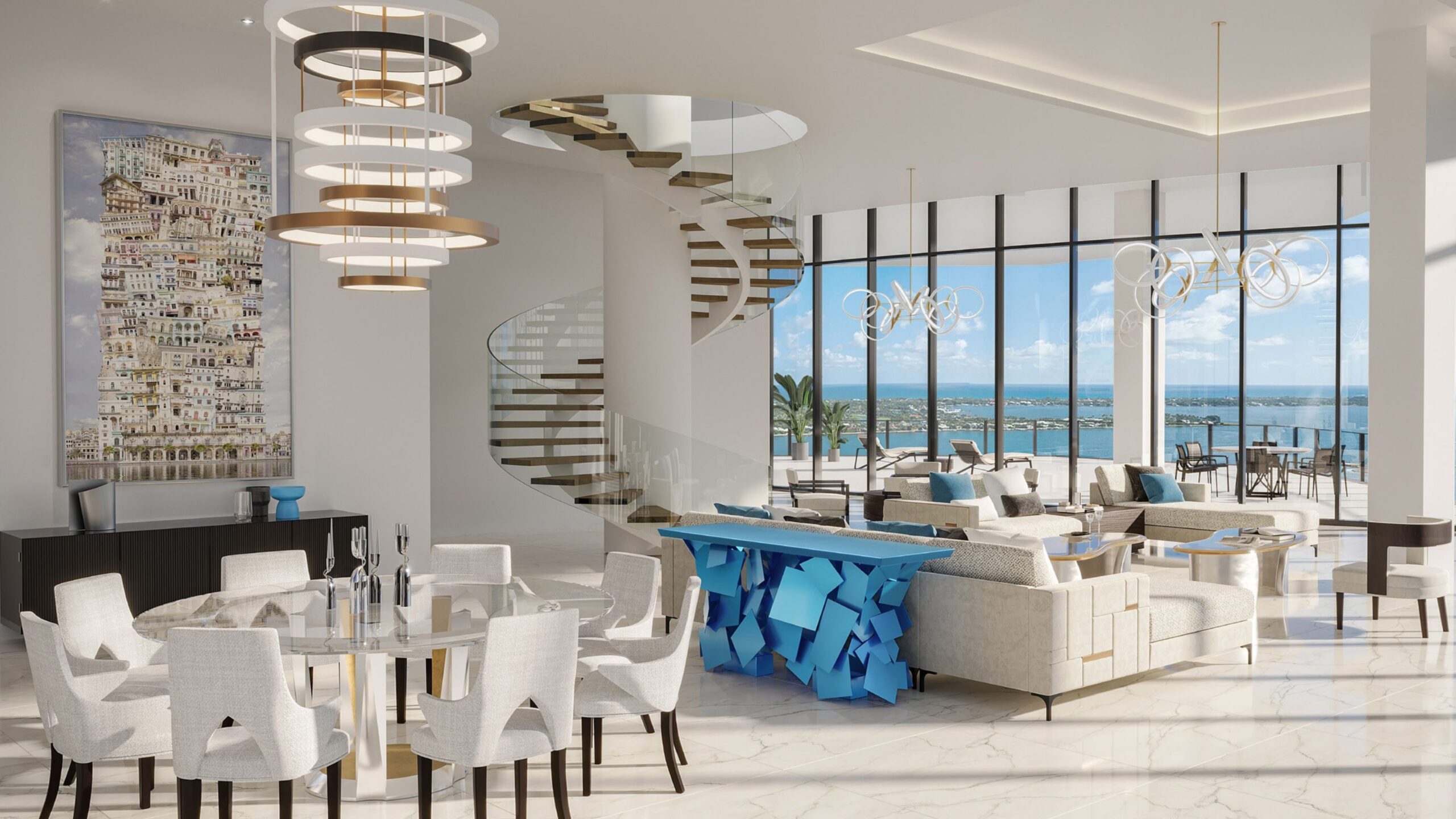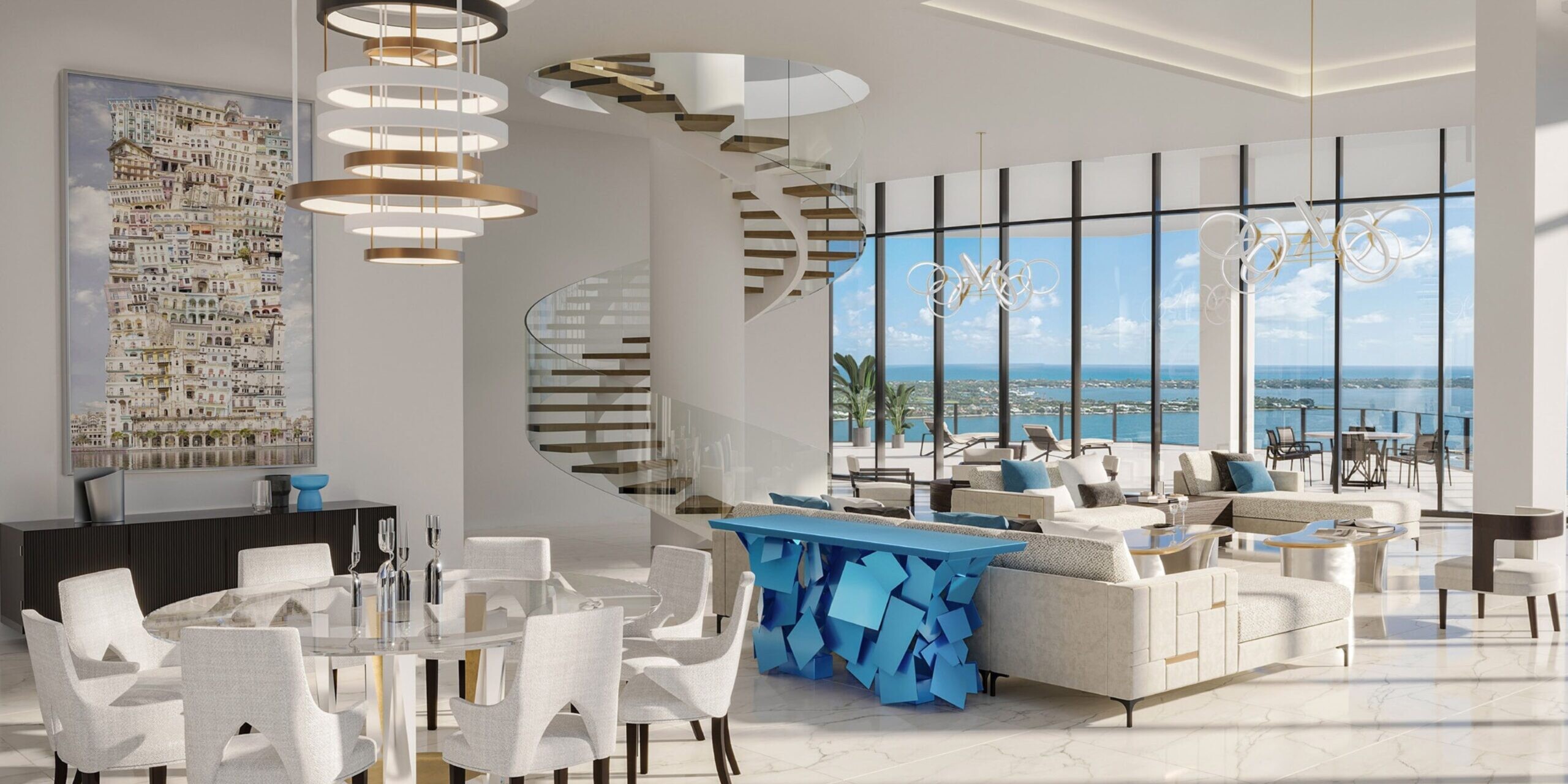 Perched majestically along the vibrant cityscape of West Palm Beach, Forte on Flagler stands as an epitome of modern luxury living, offering a curated collection of 41 meticulously designed residences. These sophisticated luxury residences, ranging from four to five bedrooms, span an impressive 4,200 to 8,400 square feet, featuring expansive walls of glass and lofty ceiling heights of 9-10 feet that showcase breathtaking vistas of both the city skyline and the azure ocean. Each residence boasts deep wraparound balconies, extending over 1,000 square feet, providing an unparalleled outdoor living experience amidst the scenic surroundings. Forte on Flagler encompasses two distinct buildings, north and south, each housing 4-bedroom, 4.5-bathroom residences spanning over 4,420 square feet of living space. These lavish properties offer residents access to expansive exterior balcony spaces, offering panoramic views of the city's captivating waterways.