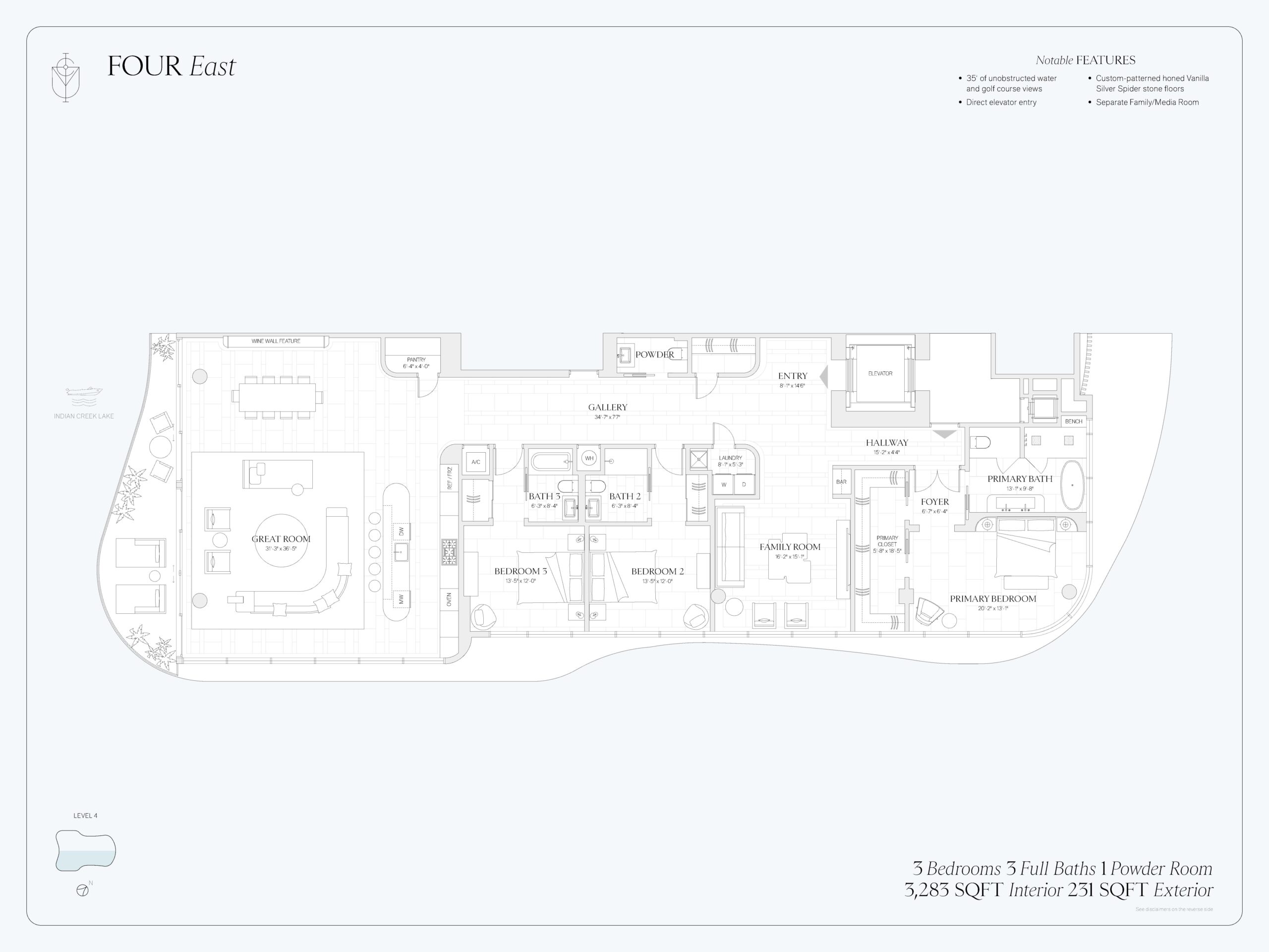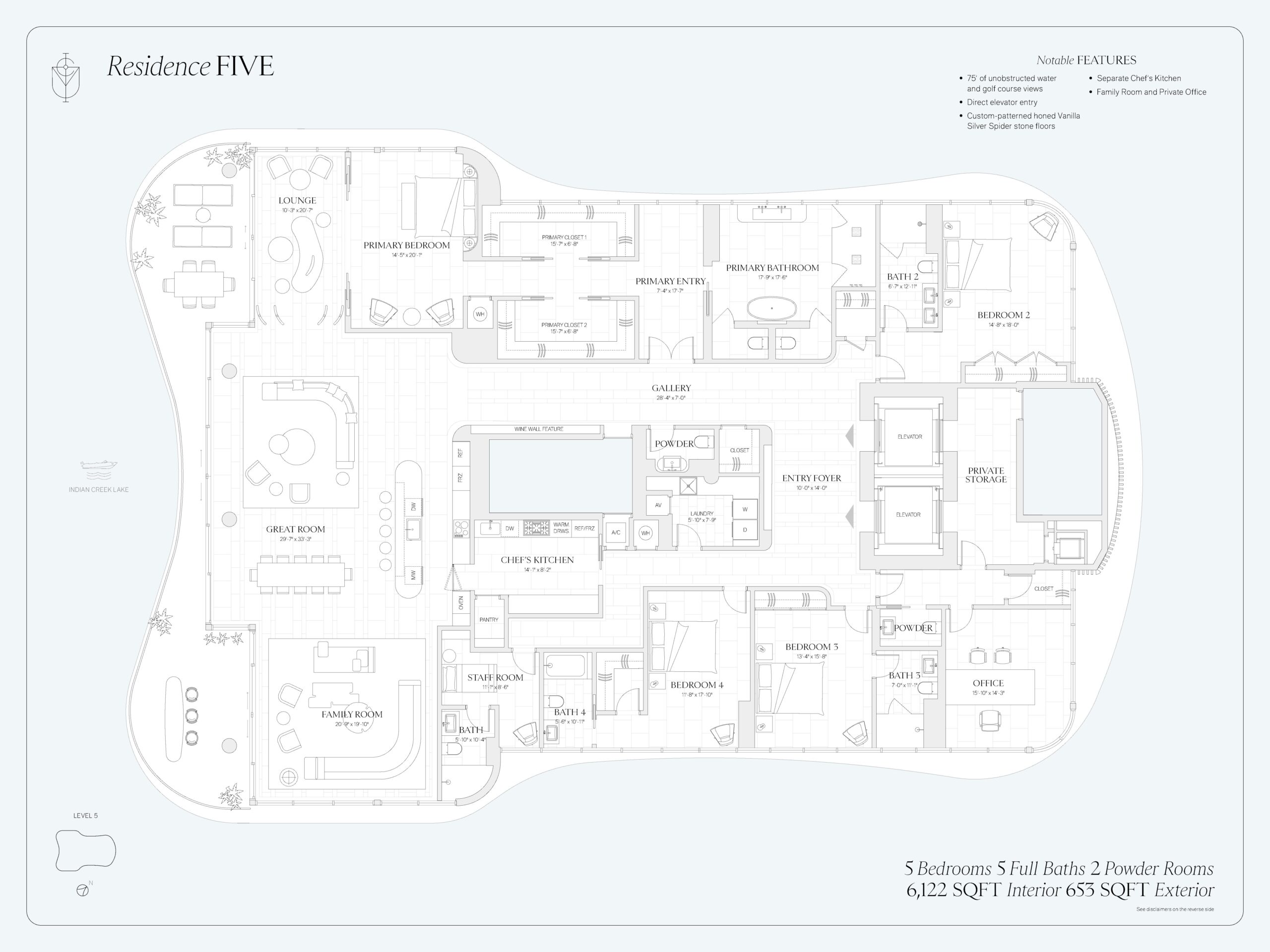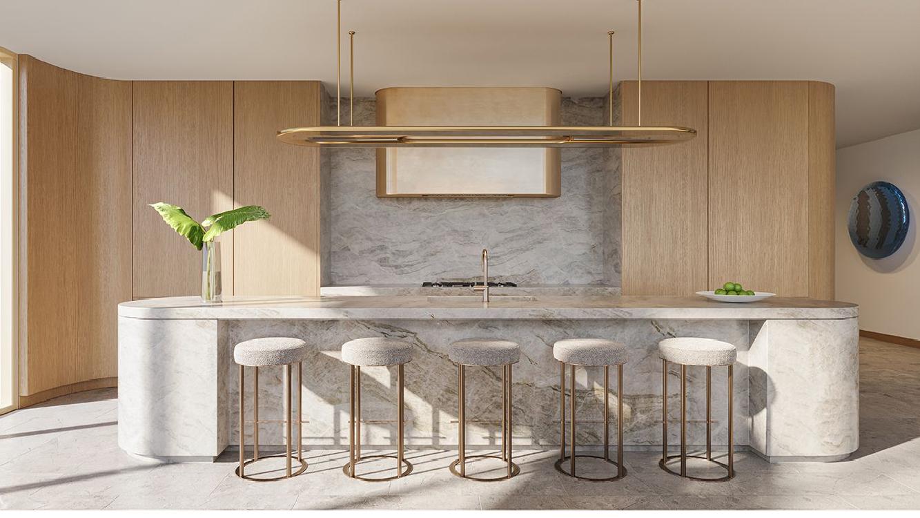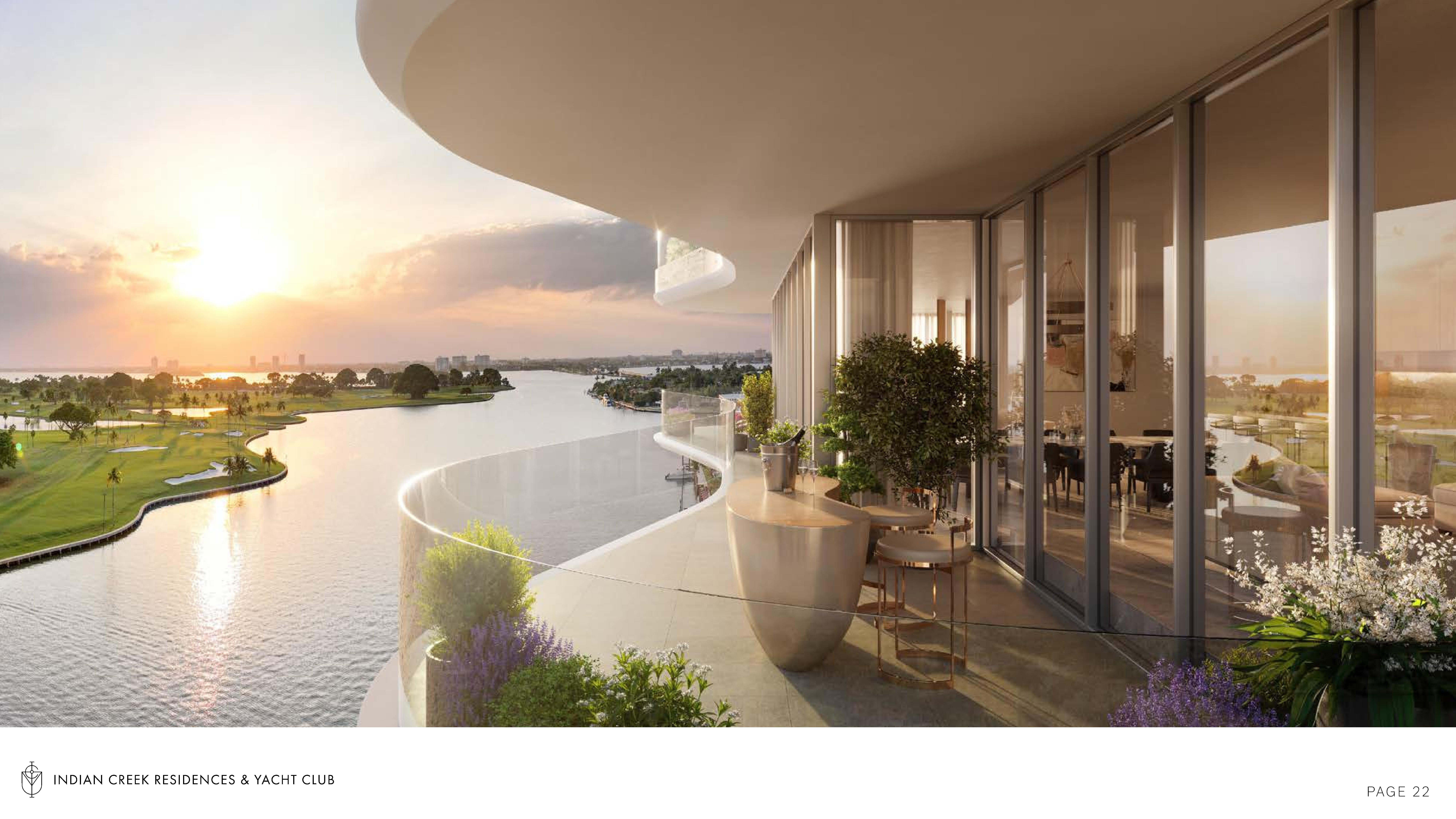 Indian Creek Residences offers a private retreat within the international hub of Bay Harbor Islands, located along a serene lakefront corner. This exclusive development features only nine residences, creating an intimate, waterfront home experience with the benefits of modern amenities. Developed by Landau Development and featuring designs by Zarifi Interior Design, Kobi Karp Architecture, Enea Landscape Design, and Ventresca Lighting Design, this property reimagines Miami's iconic “MIMO” architecture. The custom glass-wrapped facade, limestone exterior stone, and secluded landscaped private drive welcome residents to a sophisticated and tranquil environment, perfectly balancing the region’s historical charm with contemporary luxury. The homes at Indian Creek Residences are designed to offer expansive, unobstructed views of the water and sky. Living spaces are sun-soaked, featuring custom curved elements that enhance the architectural elegance. Kitchens are equipped with concealed Gaggenau appliances, Zenia white oak millwork, and Taj Mahal quartzite counters and islands, perfect for cooking and entertaining. Each primary bathroom boasts travertine floors, leather-finished walls, freestanding soaking tubs, and Fantini Nice Series fixtures, creating a spa-like retreat. The penthouses elevate luxury further with 75 feet of unobstructed water views, grand foyers, sun-filled living rooms, and chef’s kitchens. These penthouses also feature five bedrooms, five full baths, two powder rooms, and private outdoor terraces, inviting the sun and sky into expansive living areas.