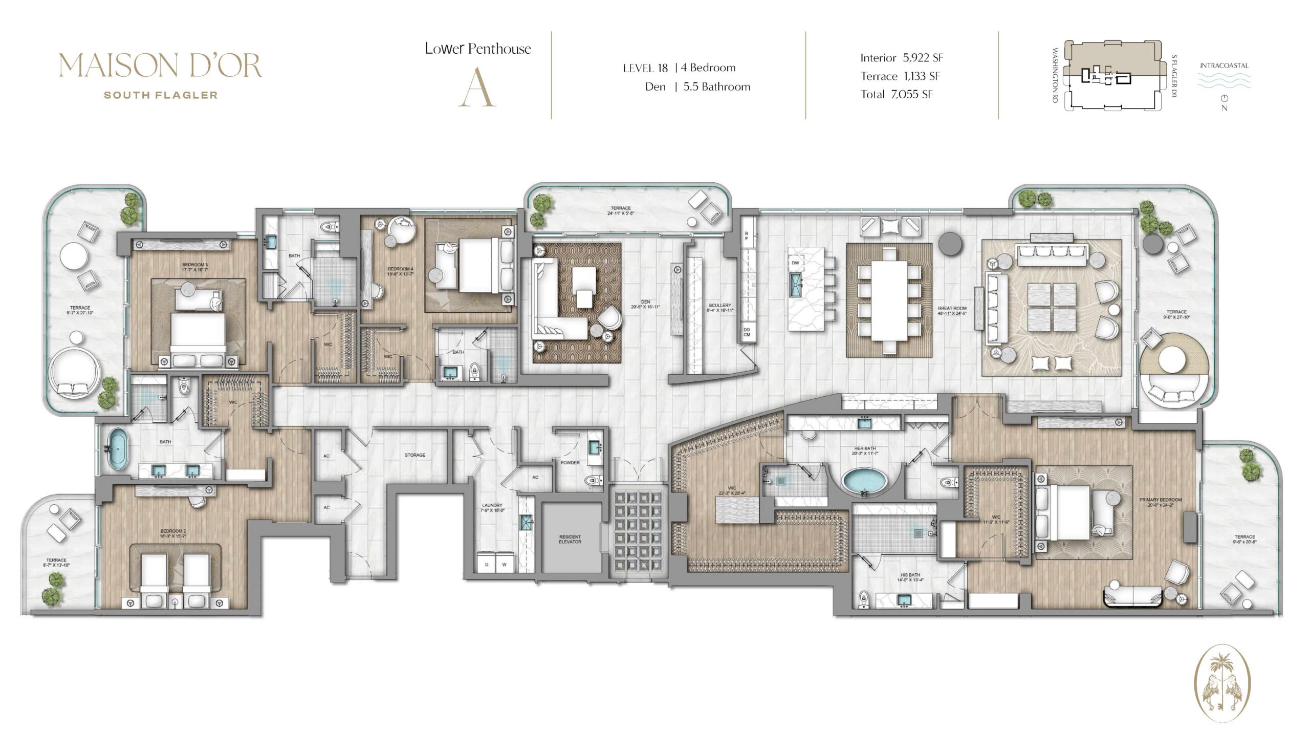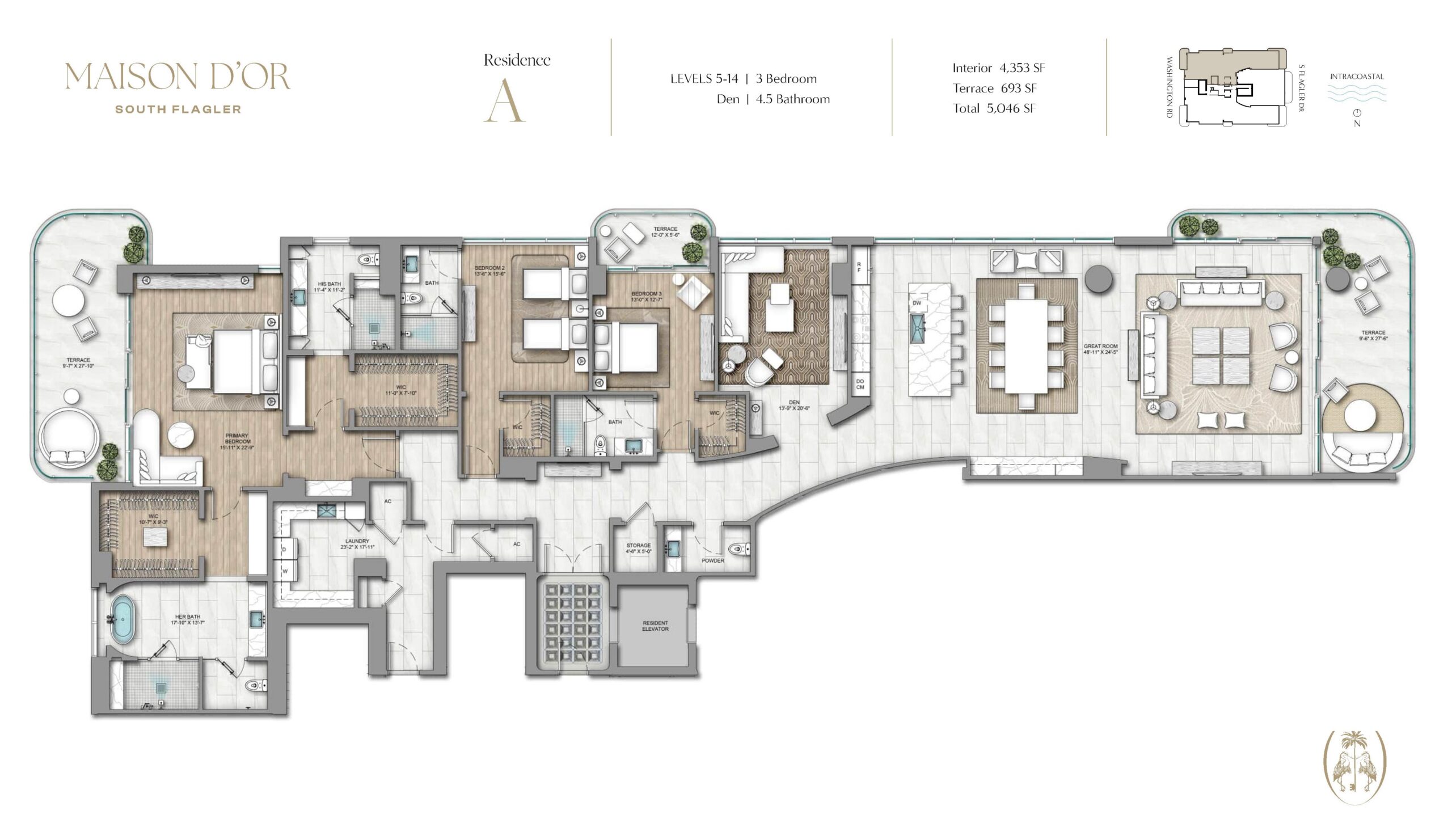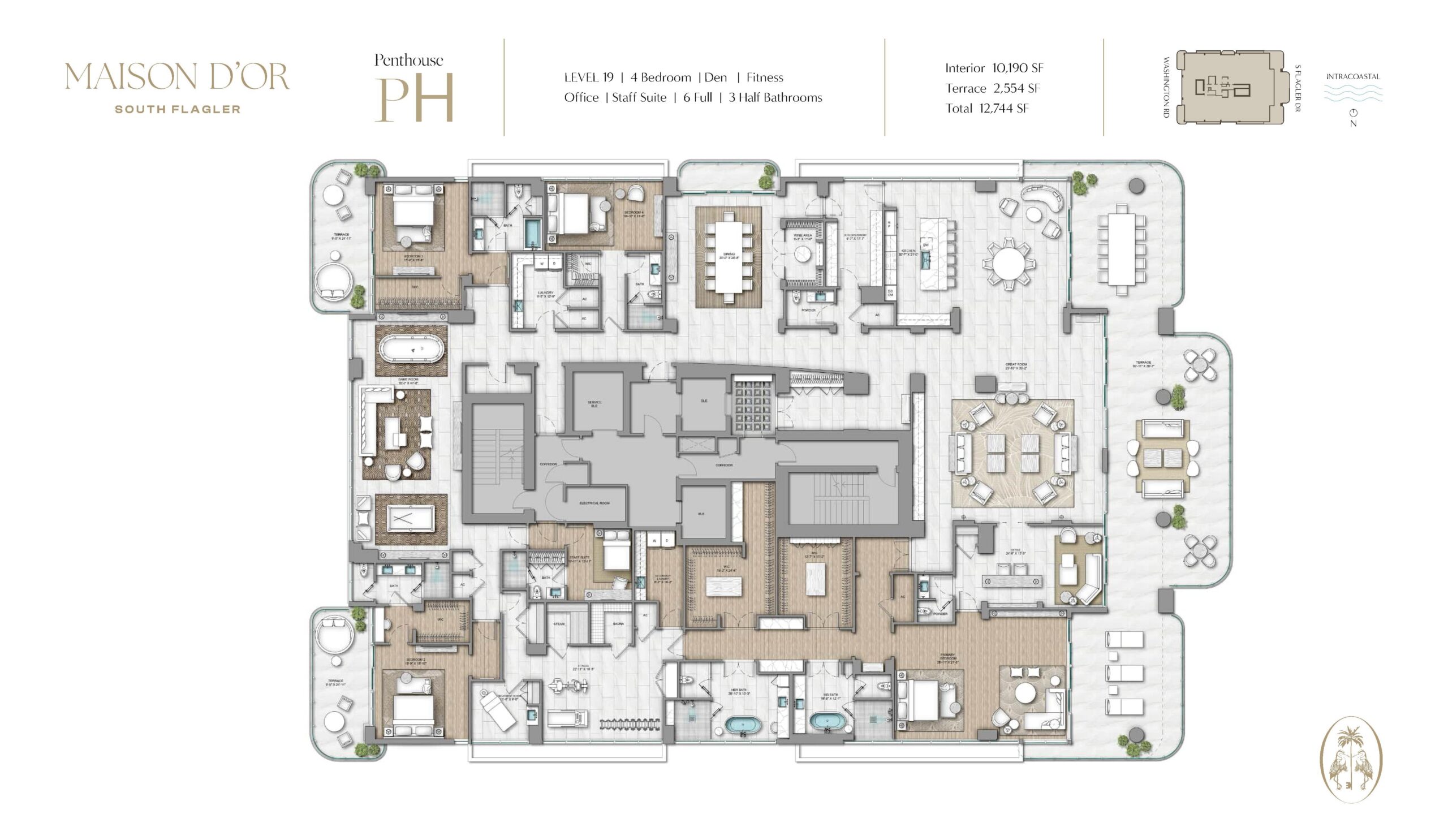 Maison d’Or South Flagler is an ultra luxury waterfront condominium rising directly along the Intracoastal Waterway in West Palm Beach’s prestigious South Flagler neighborhood. This 19 story boutique tower comprises just 39 private residences, offering a level of scale and exclusivity rarely found along the waterfront. Homes feature expansive flow through floor plans ranging from approximately 3,000 to 10,000 square feet, designed to capture sweeping views of the Intracoastal, the Atlantic Ocean, Palm Beach, and the West Palm Beach skyline. Each residence is paired with deep exterior terraces, some extending up to ten feet, creating seamless indoor outdoor living. With private access controlled arrivals, valet service, and two assigned parking spaces per home, Maison d’Or South Flagler establishes itself as a legacy property defined by discretion, architecture, and location.The residences at Maison d’Or South Flagler are designed as furniture ready waterfront estates with meticulous attention to proportion, materials, and craftsmanship. Full height glass walls and typical ceiling heights of 10 feet enhance light and volume throughout the main living areas, while select residences feature ceilings up to 10 feet 6 inches and penthouses rise to 11 feet. Large format porcelain and wood flooring options complement the refined interiors, while eight foot solid wood interior doors reinforce a sense of permanence. Chef inspired kitchens feature nine foot cabinetry, quartz countertops with full height backsplashes, under cabinet lighting, and a full Sub Zero and Wolf appliance package. Owner’s suites include dual walk-in closets and spa like his and hers bathrooms, with select layouts offering butler pantries and dedicated laundry rooms with cabinetry and premium appliances.