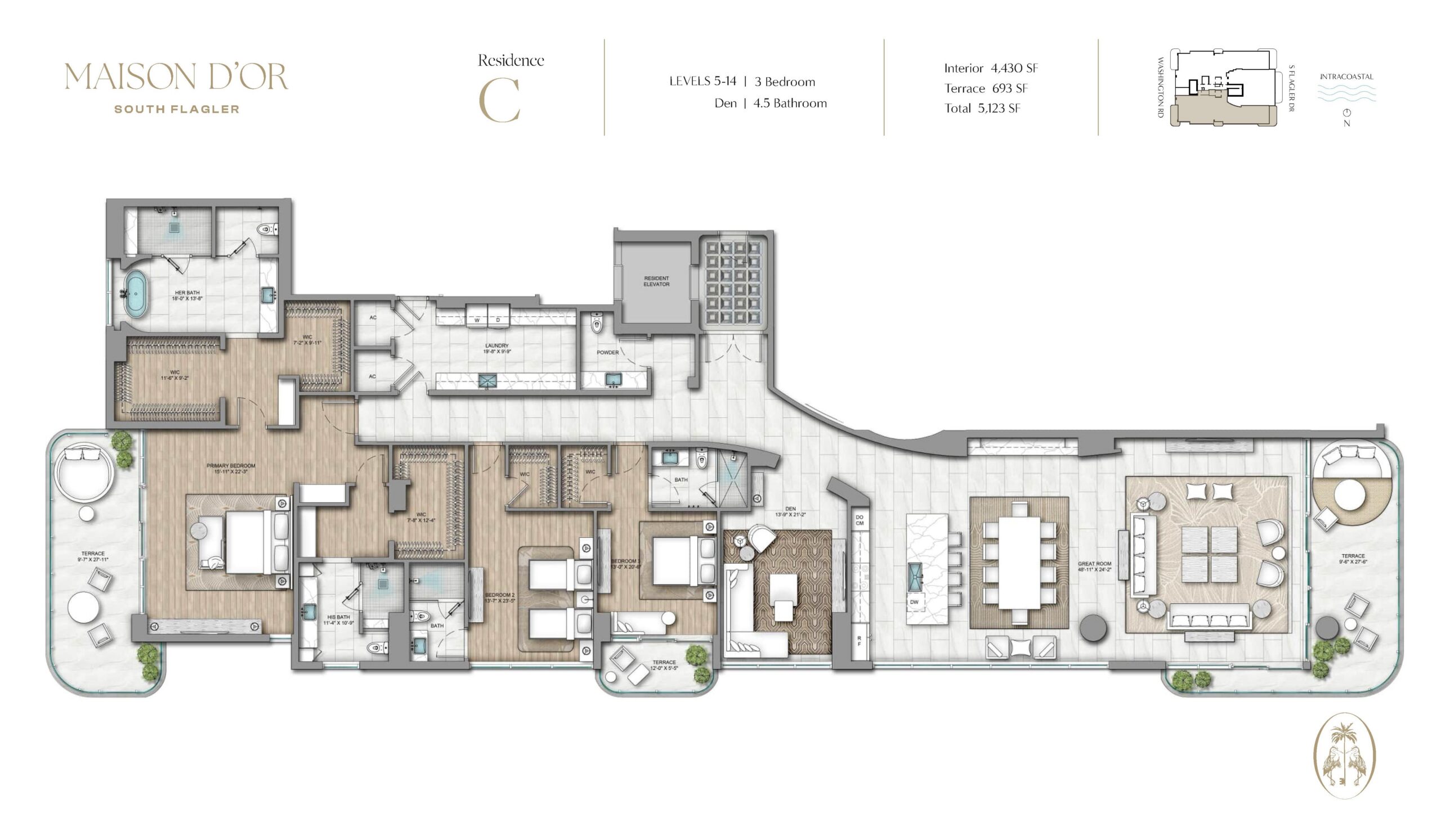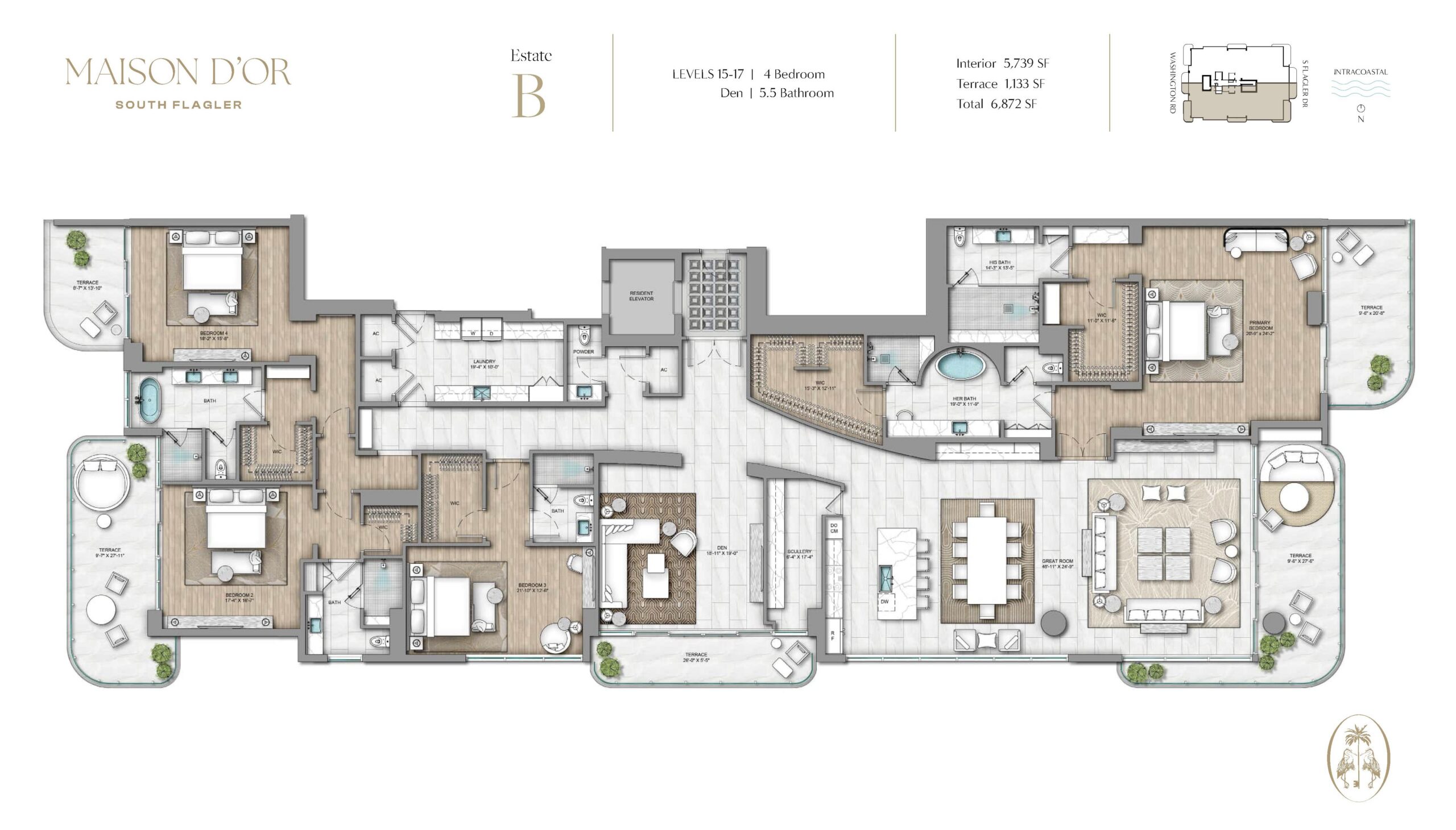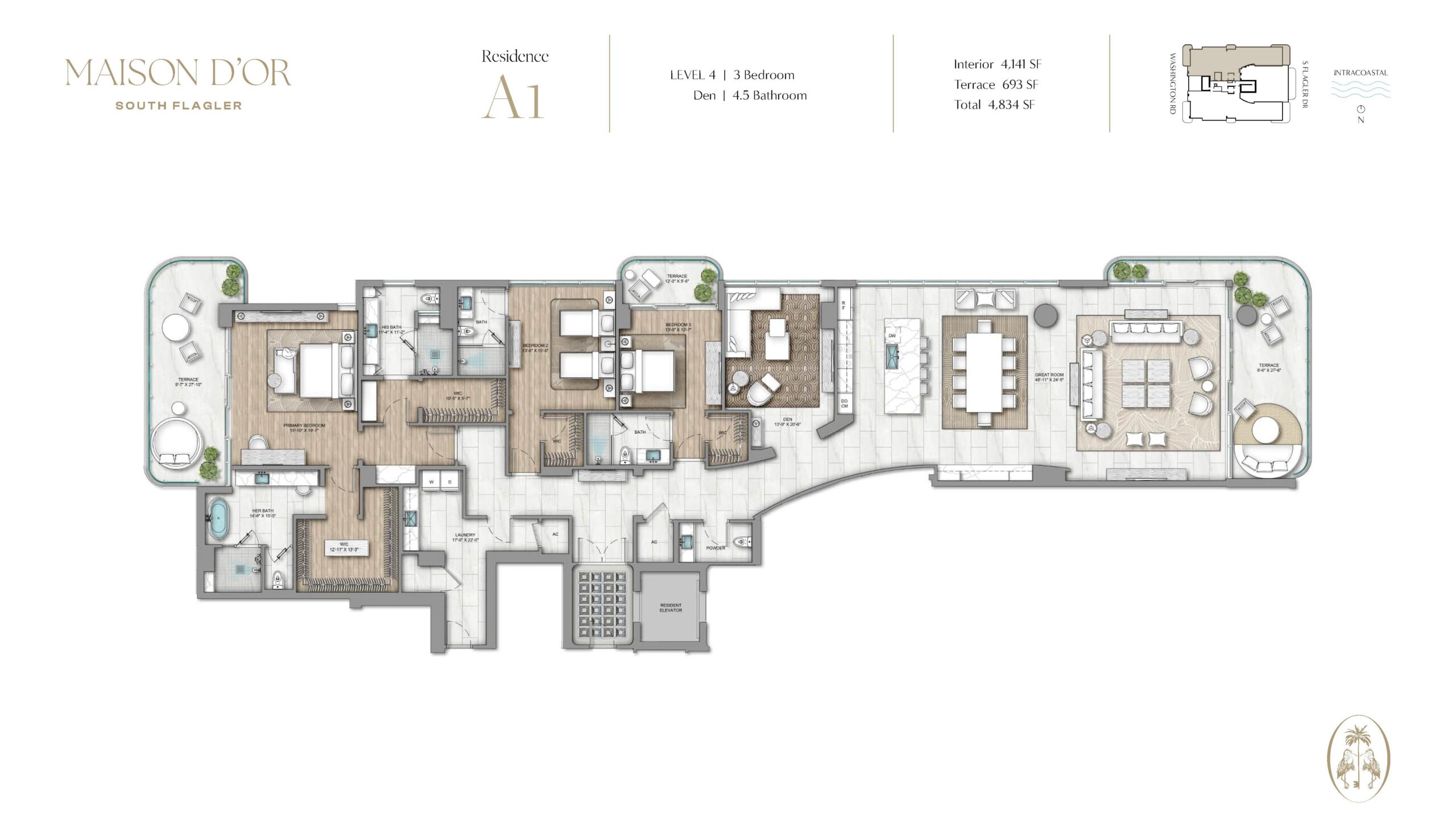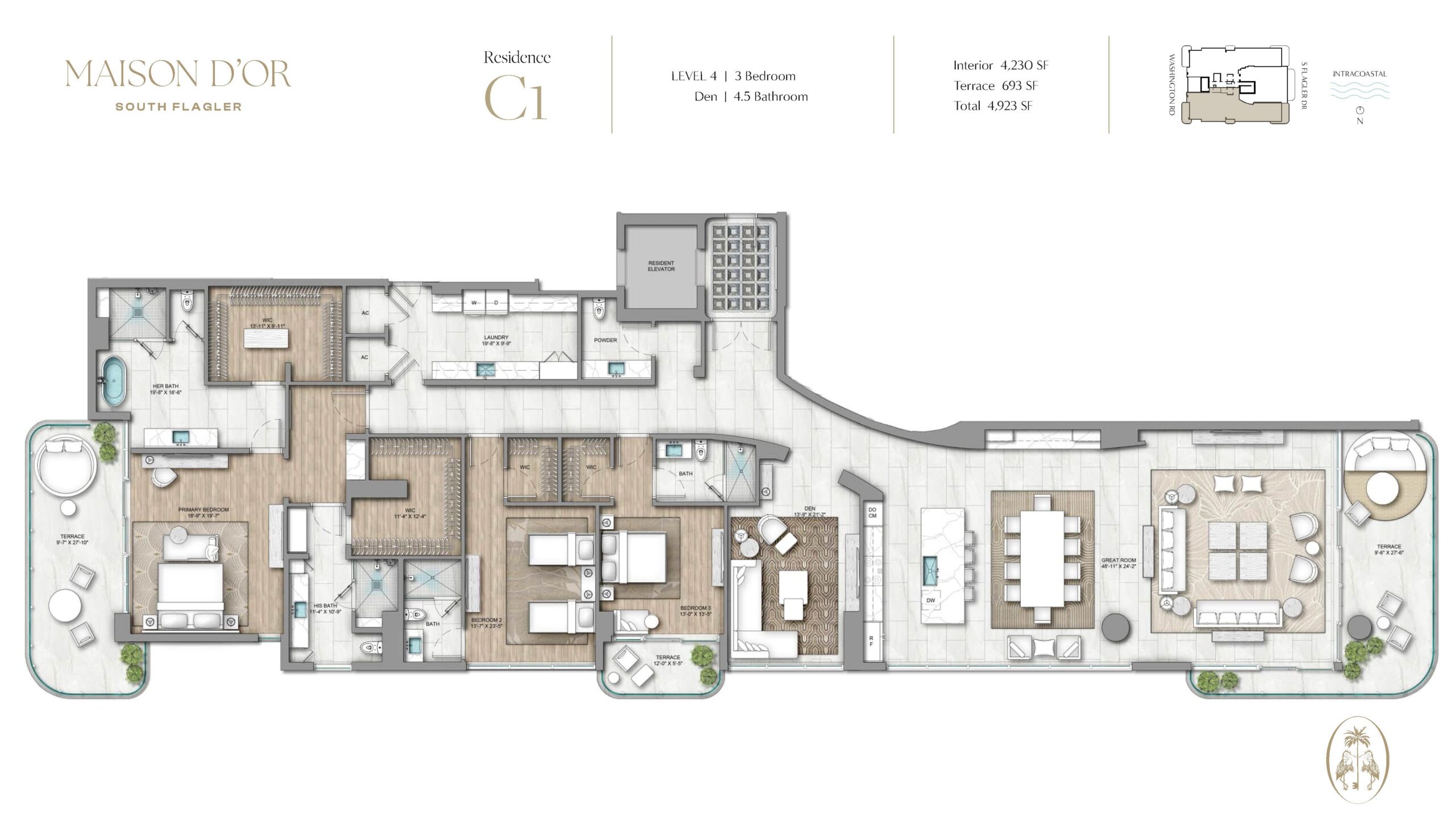 Maison d’Or South Flagler is an ultra luxury waterfront condominium rising directly along the Intracoastal Waterway in West Palm Beach’s prestigious South Flagler neighborhood. This 19 story boutique tower comprises just 39 private residences, offering a level of scale and exclusivity rarely found along the waterfront. Homes feature expansive flow through floor plans ranging from approximately 3,000 to 10,000 square feet, designed to capture sweeping views of the Intracoastal, the Atlantic Ocean, Palm Beach, and the West Palm Beach skyline. Each residence is paired with deep exterior terraces, some extending up to ten feet, creating seamless indoor outdoor living. With private access controlled arrivals, valet service, and two assigned parking spaces per home, Maison d’Or South Flagler establishes itself as a legacy property defined by discretion, architecture, and location.The residences at Maison d’Or South Flagler are designed as furniture ready waterfront estates with meticulous attention to proportion, materials, and craftsmanship. Full height glass walls and typical ceiling heights of 10 feet enhance light and volume throughout the main living areas, while select residences feature ceilings up to 10 feet 6 inches and penthouses rise to 11 feet. Large format porcelain and wood flooring options complement the refined interiors, while eight foot solid wood interior doors reinforce a sense of permanence. Chef inspired kitchens feature nine foot cabinetry, quartz countertops with full height backsplashes, under cabinet lighting, and a full Sub Zero and Wolf appliance package. Owner’s suites include dual walk-in closets and spa like his and hers bathrooms, with select layouts offering butler pantries and dedicated laundry rooms with cabinetry and premium appliances.