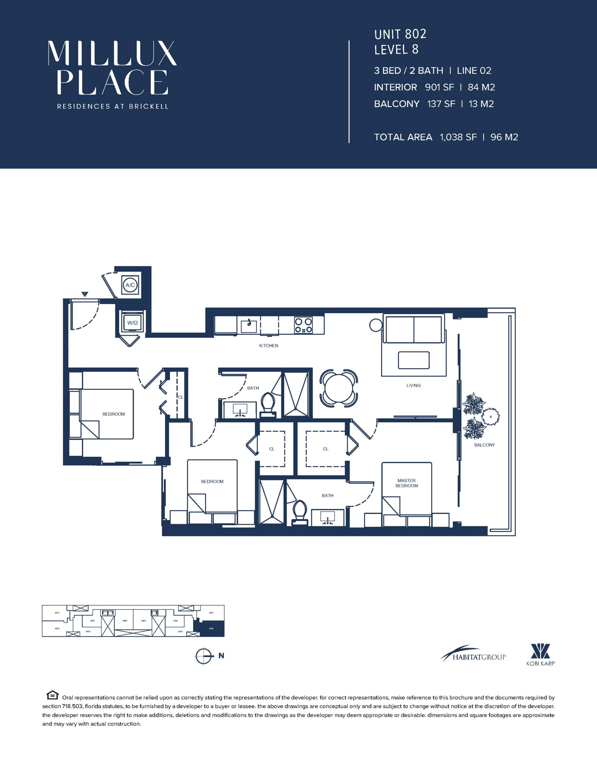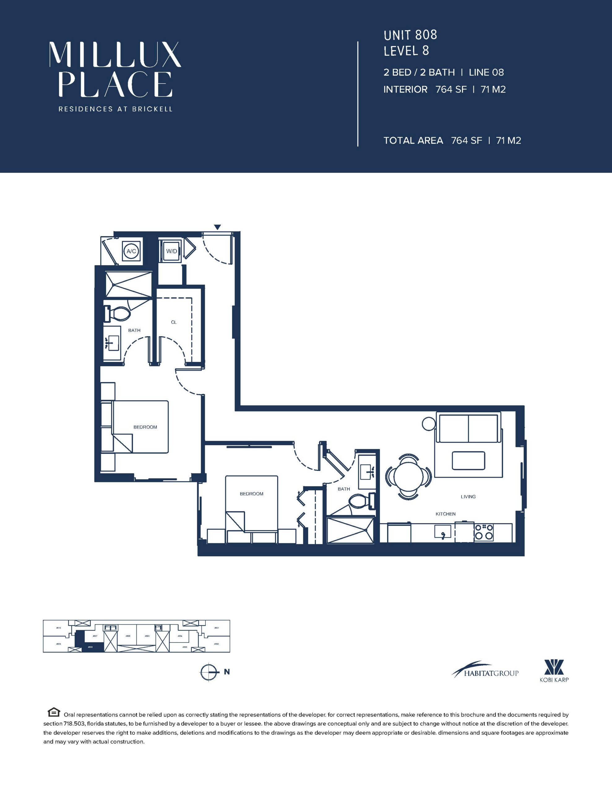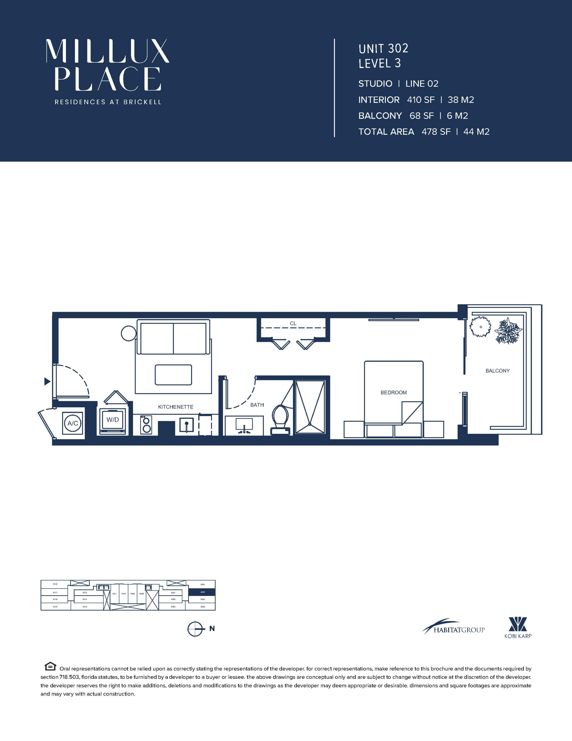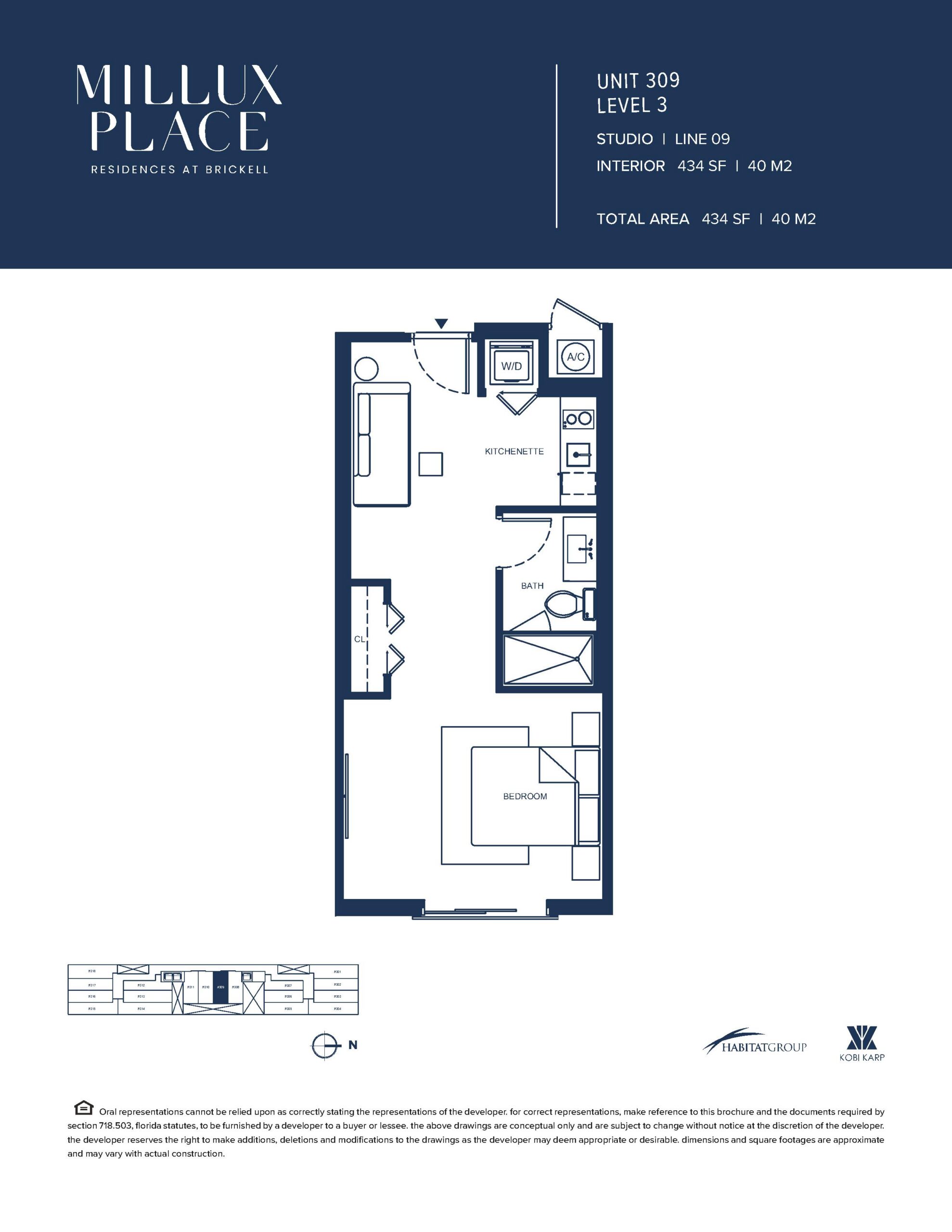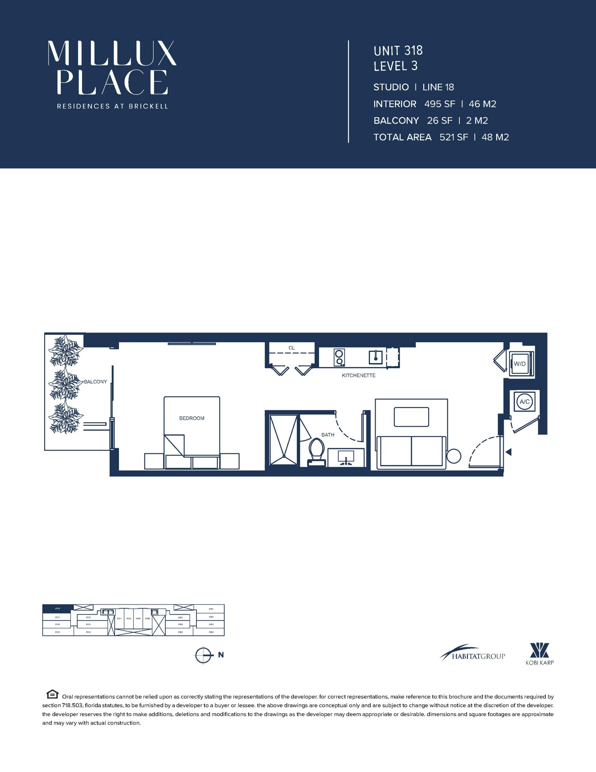 Millux Place introduces a refined boutique presence in the heart of Brickell, rising eight stories with 99 luxury residences designed for contemporary urban living. Conceived as a mixed use condo lodging property, the building is fully finished and furnished, offering turnkey residences that blend residential comfort with hospitality level convenience. Short term rentals are permitted and supported by on site hospitality management, creating flexibility for owners while maintaining a cohesive residential experience. Designed by Kobi Karp and developed by Habitat Group in collaboration with BI Group USA, Millux Place reflects a modern architectural aesthetic tailored to Brickell’s dynamic skyline. Its prime location within the neighborhood places residents at the center of Miami’s financial and cultural energy while maintaining the scale and intimacy of a boutique address.Residences feature open concept floor plans that range from studios to one, two, and three bedroom layouts. Each home is delivered fully furnished and thoughtfully appointed with marble countertops, stainless steel appliances, and custom Italian cabinetry that brings a clean, contemporary finish to the kitchens. Floor to ceiling impact resistant windows fill the interiors with natural light, while private balconies enclosed with glass railings extend the living space outdoors. Bathrooms are designed with frameless glass showers and Italian cabinetry, reinforcing a cohesive modern aesthetic. Every residence includes a washer and dryer along with a high efficiency central air conditioning and heating system, ensuring comfort and functionality throughout the year. The result is a collection of homes that feel polished, efficient, and move in ready from day one.