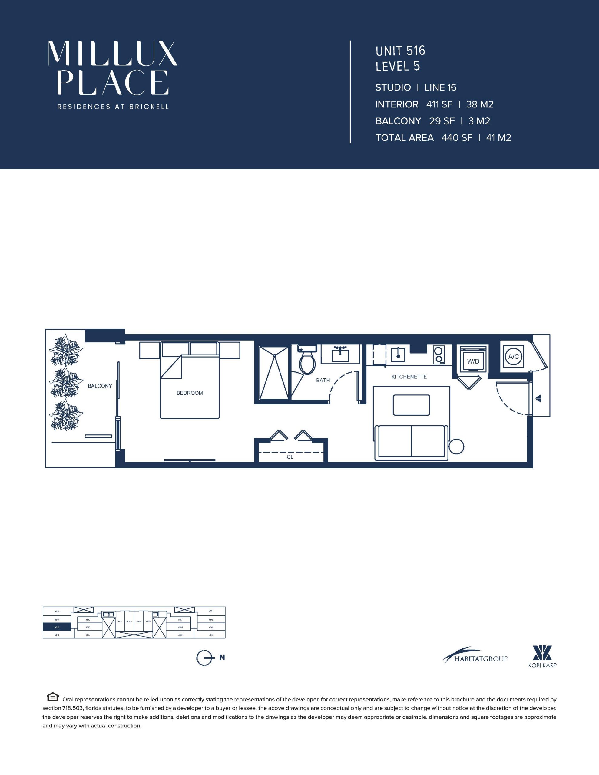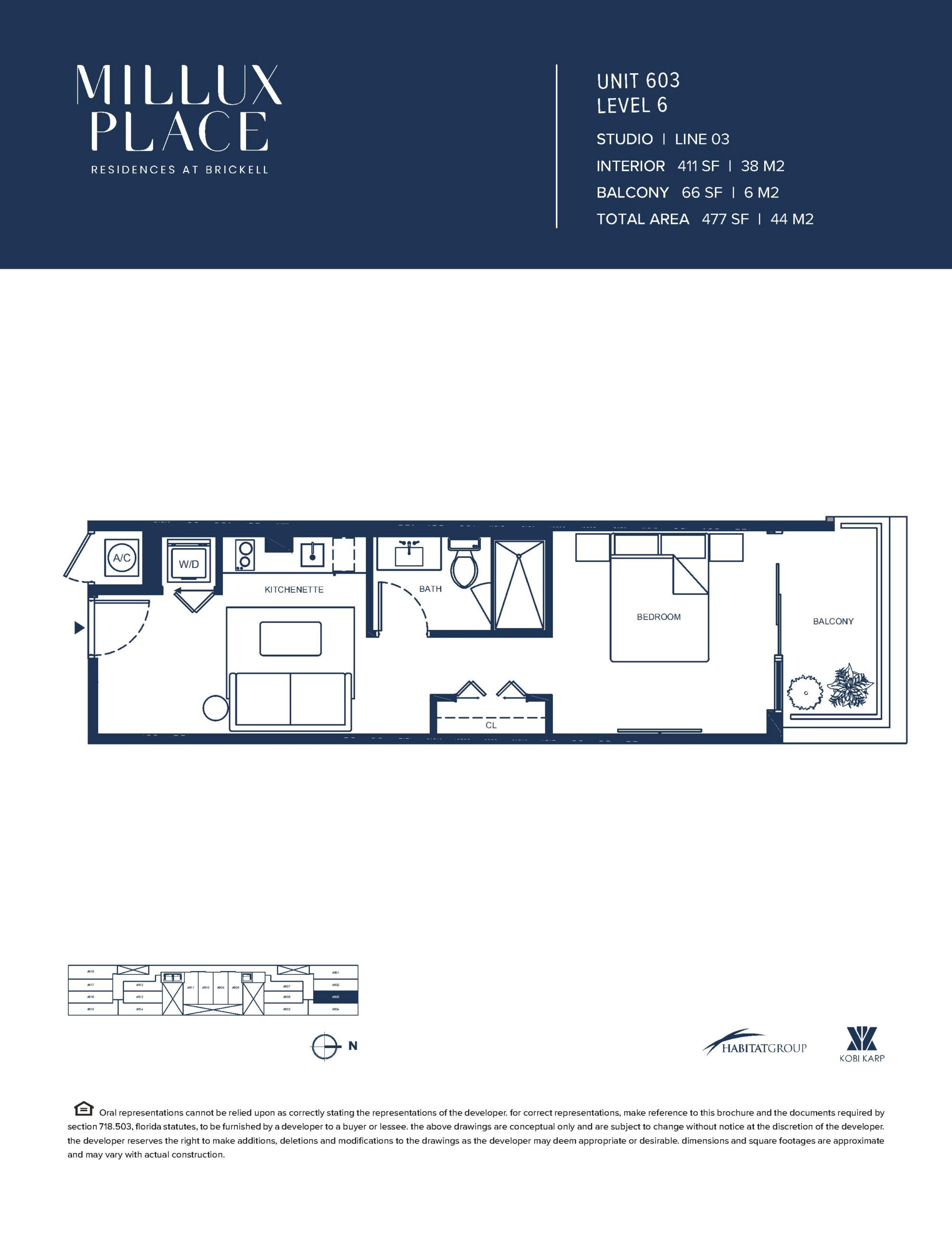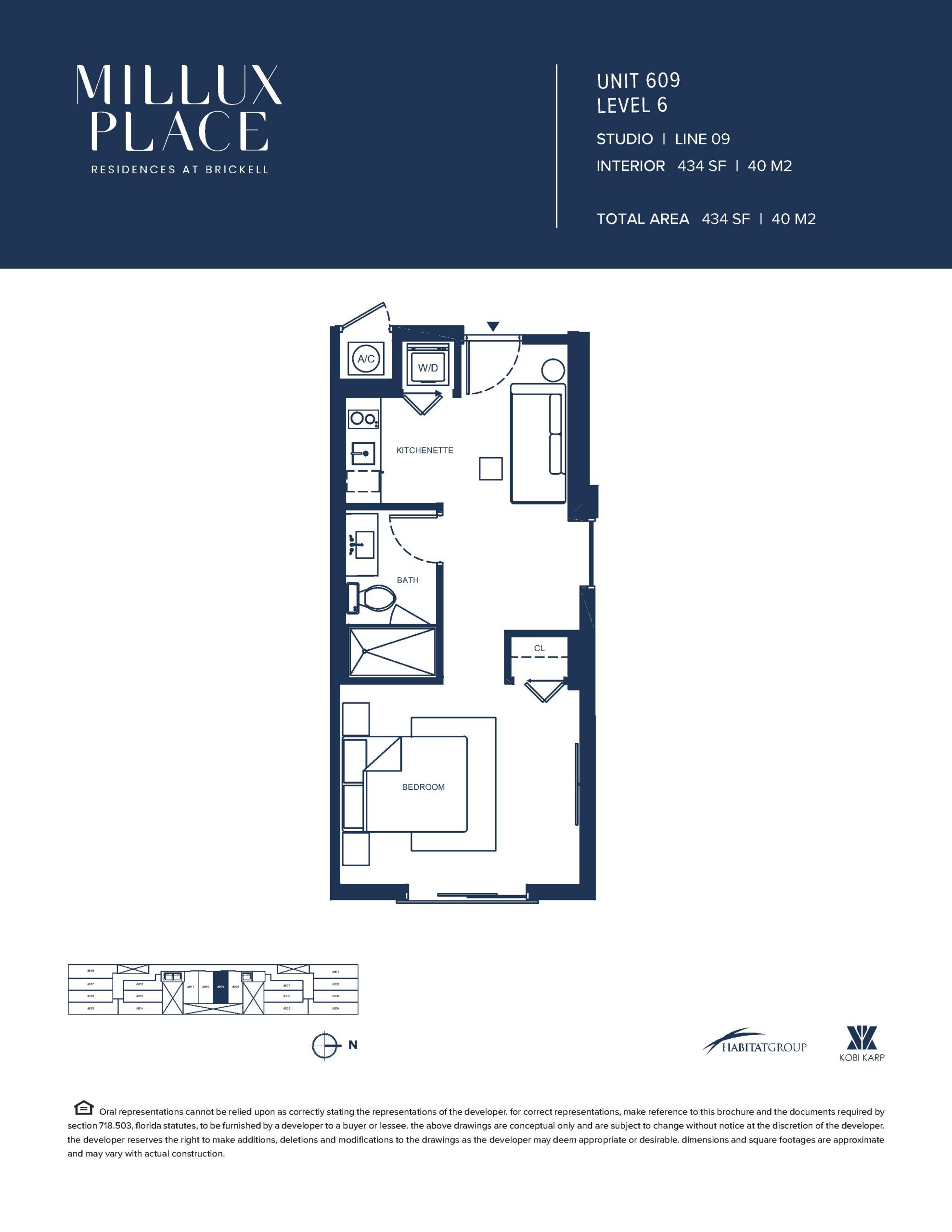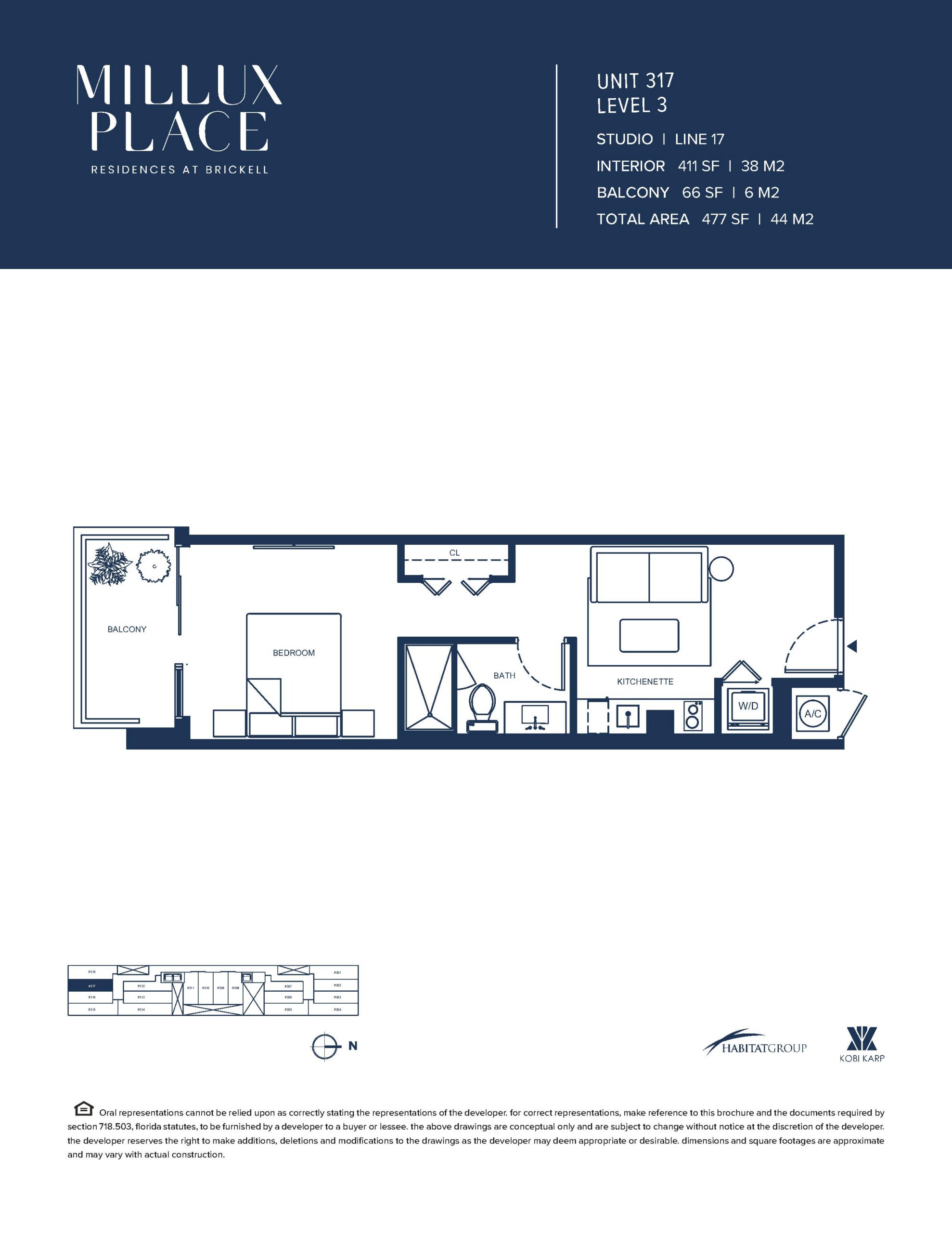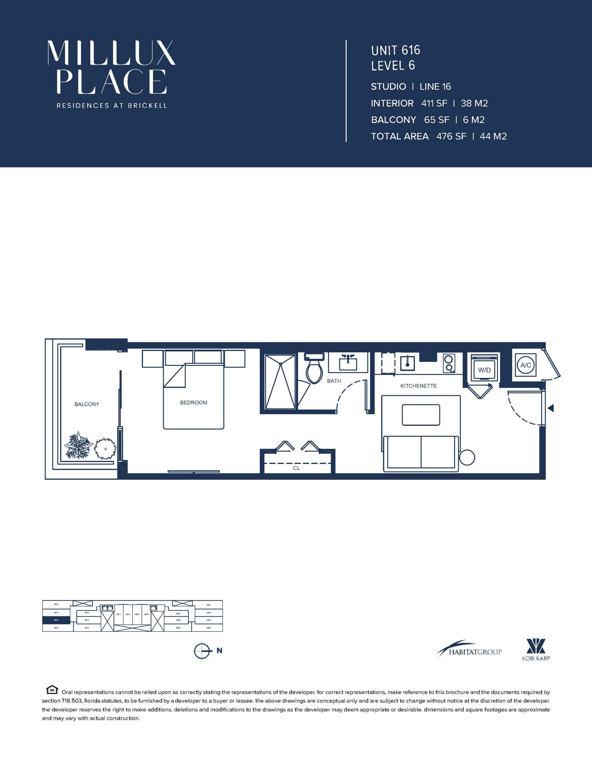 Millux Place introduces a refined boutique presence in the heart of Brickell, rising eight stories with 99 luxury residences designed for contemporary urban living. Conceived as a mixed use condo lodging property, the building is fully finished and furnished, offering turnkey residences that blend residential comfort with hospitality level convenience. Short term rentals are permitted and supported by on site hospitality management, creating flexibility for owners while maintaining a cohesive residential experience. Designed by Kobi Karp and developed by Habitat Group in collaboration with BI Group USA, Millux Place reflects a modern architectural aesthetic tailored to Brickell’s dynamic skyline. Its prime location within the neighborhood places residents at the center of Miami’s financial and cultural energy while maintaining the scale and intimacy of a boutique address.Residences feature open concept floor plans that range from studios to one, two, and three bedroom layouts. Each home is delivered fully furnished and thoughtfully appointed with marble countertops, stainless steel appliances, and custom Italian cabinetry that brings a clean, contemporary finish to the kitchens. Floor to ceiling impact resistant windows fill the interiors with natural light, while private balconies enclosed with glass railings extend the living space outdoors. Bathrooms are designed with frameless glass showers and Italian cabinetry, reinforcing a cohesive modern aesthetic. Every residence includes a washer and dryer along with a high efficiency central air conditioning and heating system, ensuring comfort and functionality throughout the year. The result is a collection of homes that feel polished, efficient, and move in ready from day one.