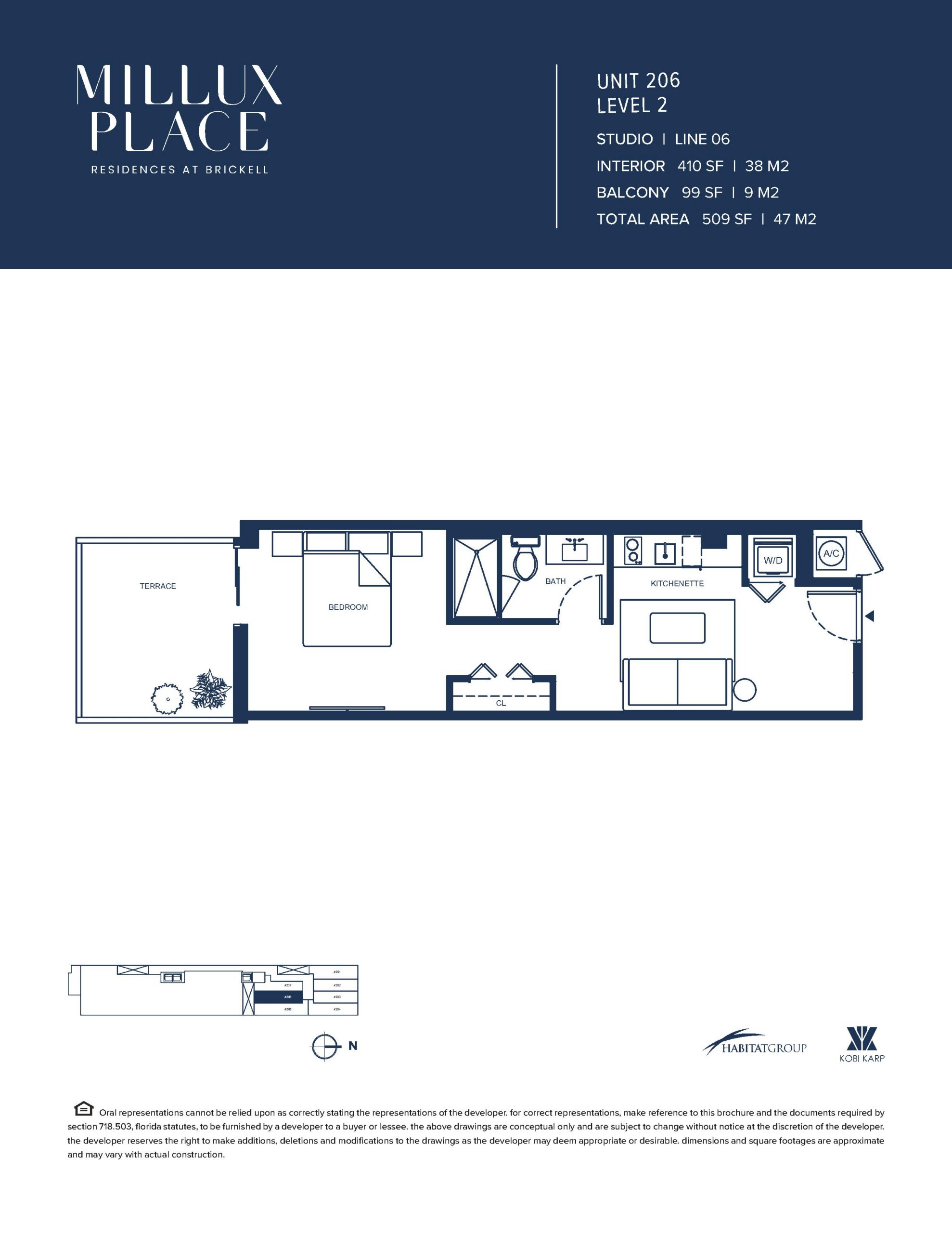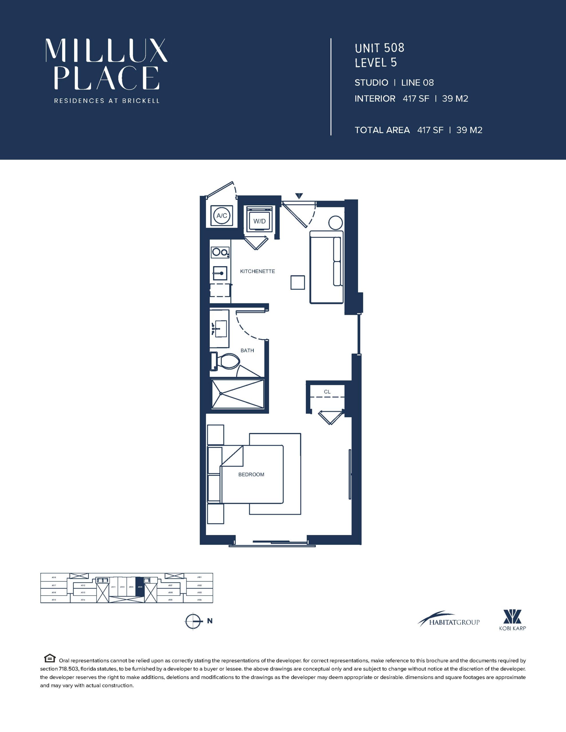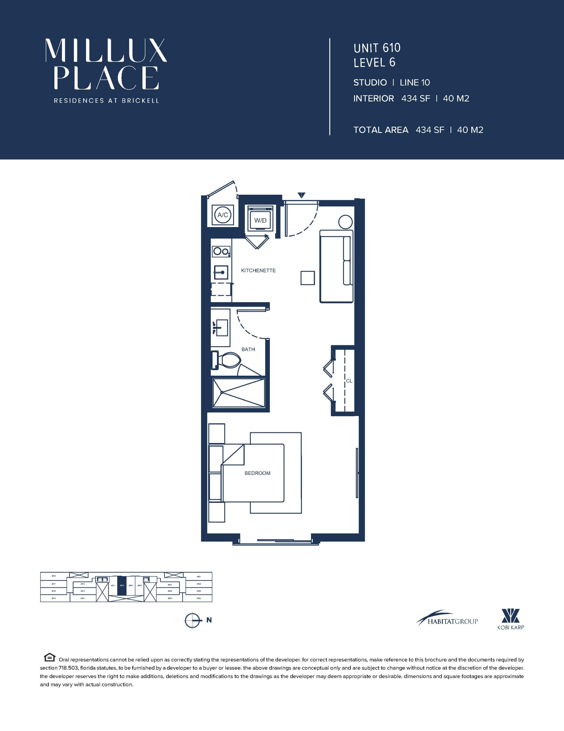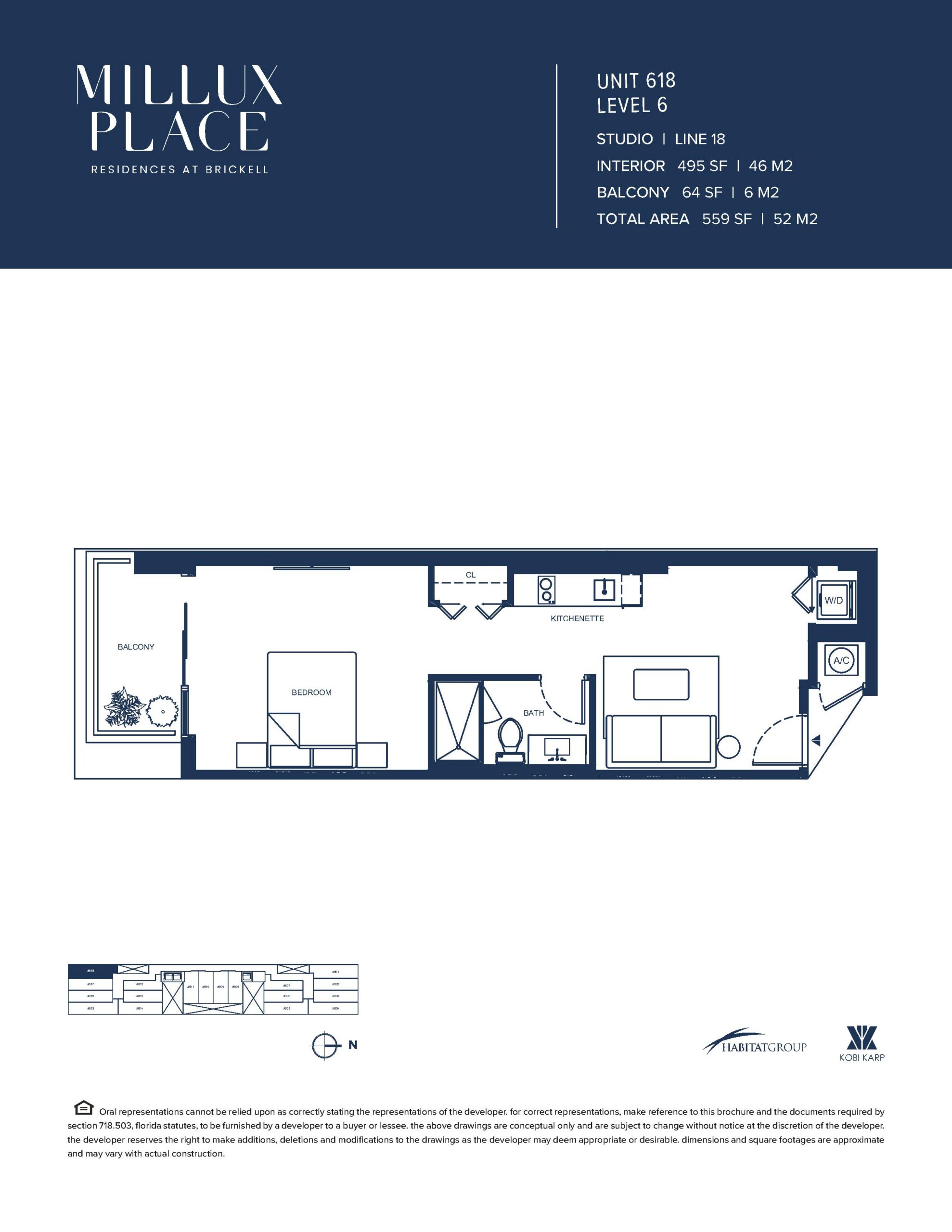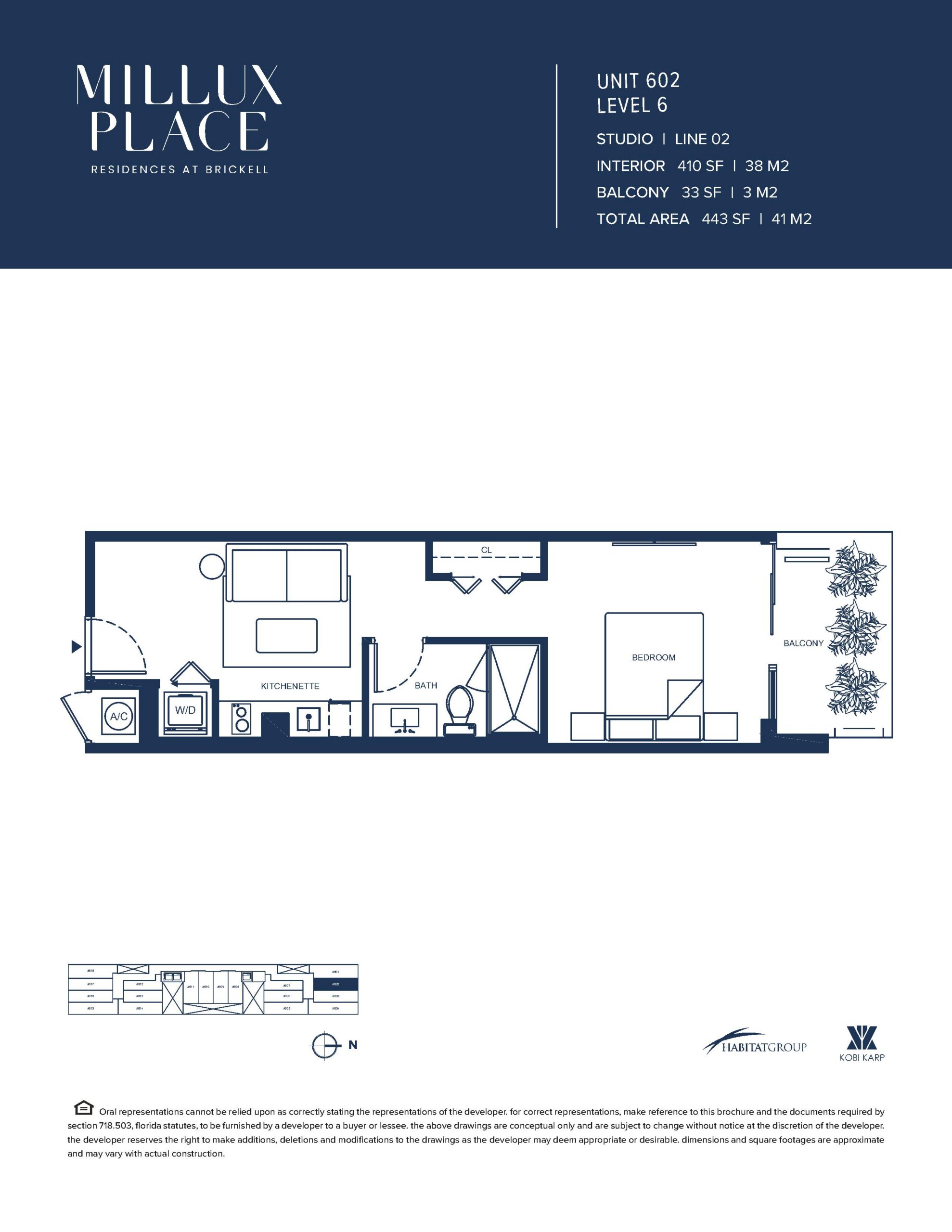 Millux Place introduces a refined boutique presence in the heart of Brickell, rising eight stories with 99 luxury residences designed for contemporary urban living. Conceived as a mixed use condo lodging property, the building is fully finished and furnished, offering turnkey residences that blend residential comfort with hospitality level convenience. Short term rentals are permitted and supported by on site hospitality management, creating flexibility for owners while maintaining a cohesive residential experience. Designed by Kobi Karp and developed by Habitat Group in collaboration with BI Group USA, Millux Place reflects a modern architectural aesthetic tailored to Brickell’s dynamic skyline. Its prime location within the neighborhood places residents at the center of Miami’s financial and cultural energy while maintaining the scale and intimacy of a boutique address.Residences feature open concept floor plans that range from studios to one, two, and three bedroom layouts. Each home is delivered fully furnished and thoughtfully appointed with marble countertops, stainless steel appliances, and custom Italian cabinetry that brings a clean, contemporary finish to the kitchens. Floor to ceiling impact resistant windows fill the interiors with natural light, while private balconies enclosed with glass railings extend the living space outdoors. Bathrooms are designed with frameless glass showers and Italian cabinetry, reinforcing a cohesive modern aesthetic. Every residence includes a washer and dryer along with a high efficiency central air conditioning and heating system, ensuring comfort and functionality throughout the year. The result is a collection of homes that feel polished, efficient, and move in ready from day one.