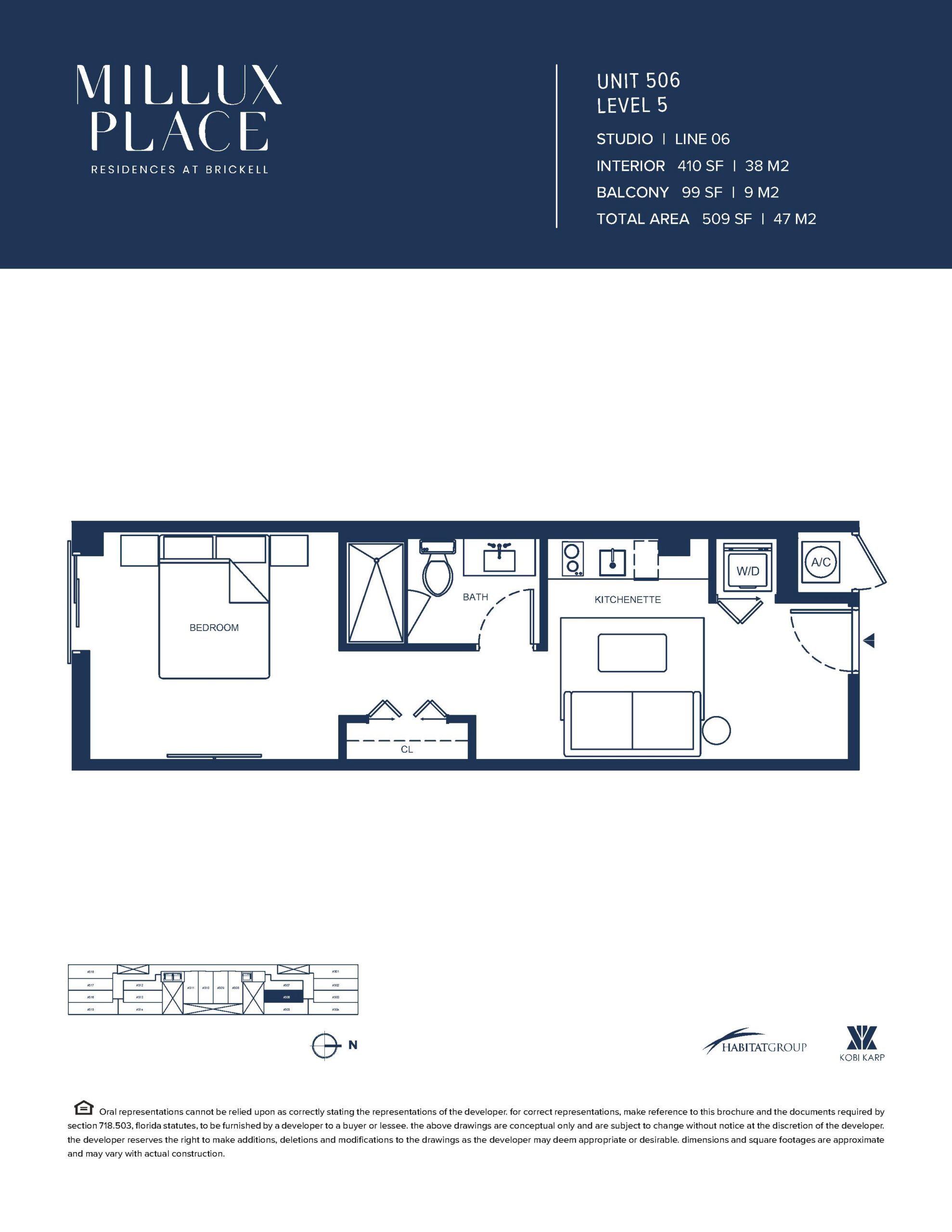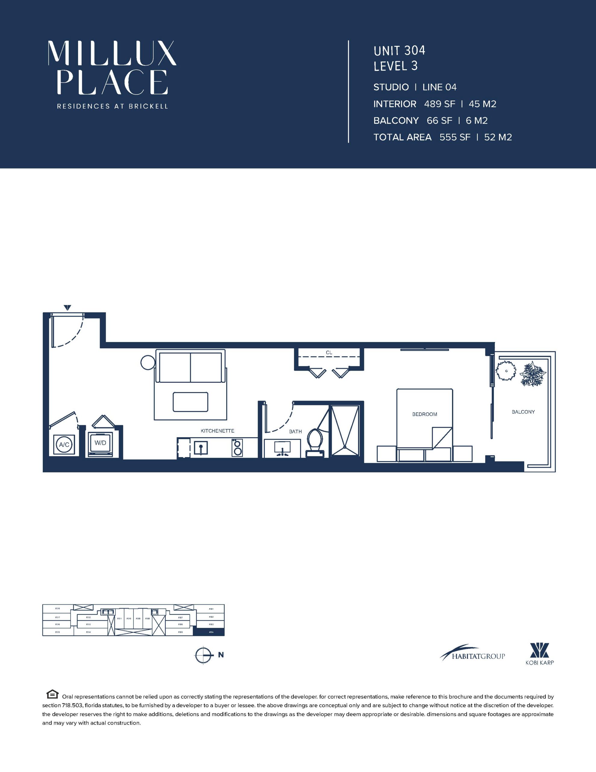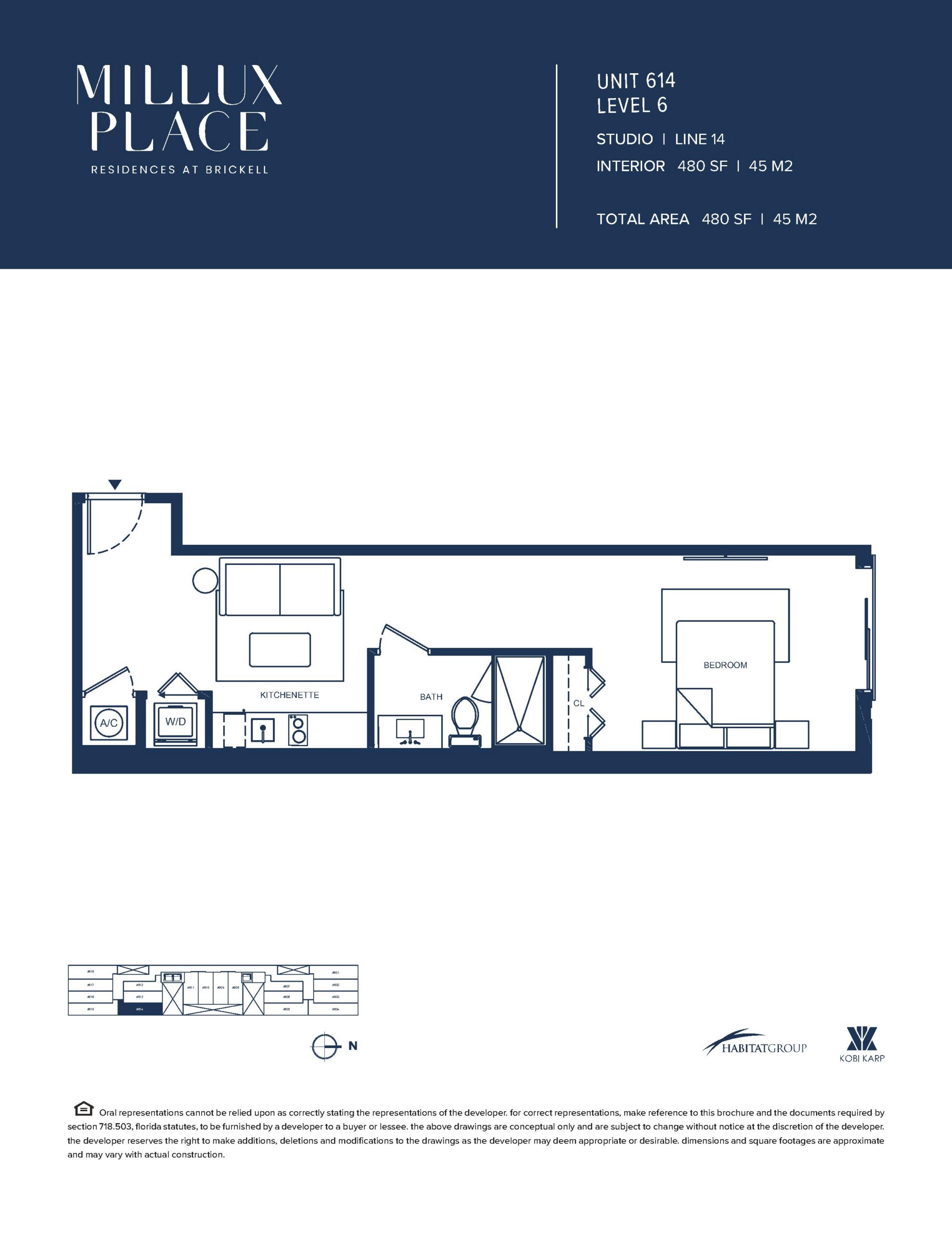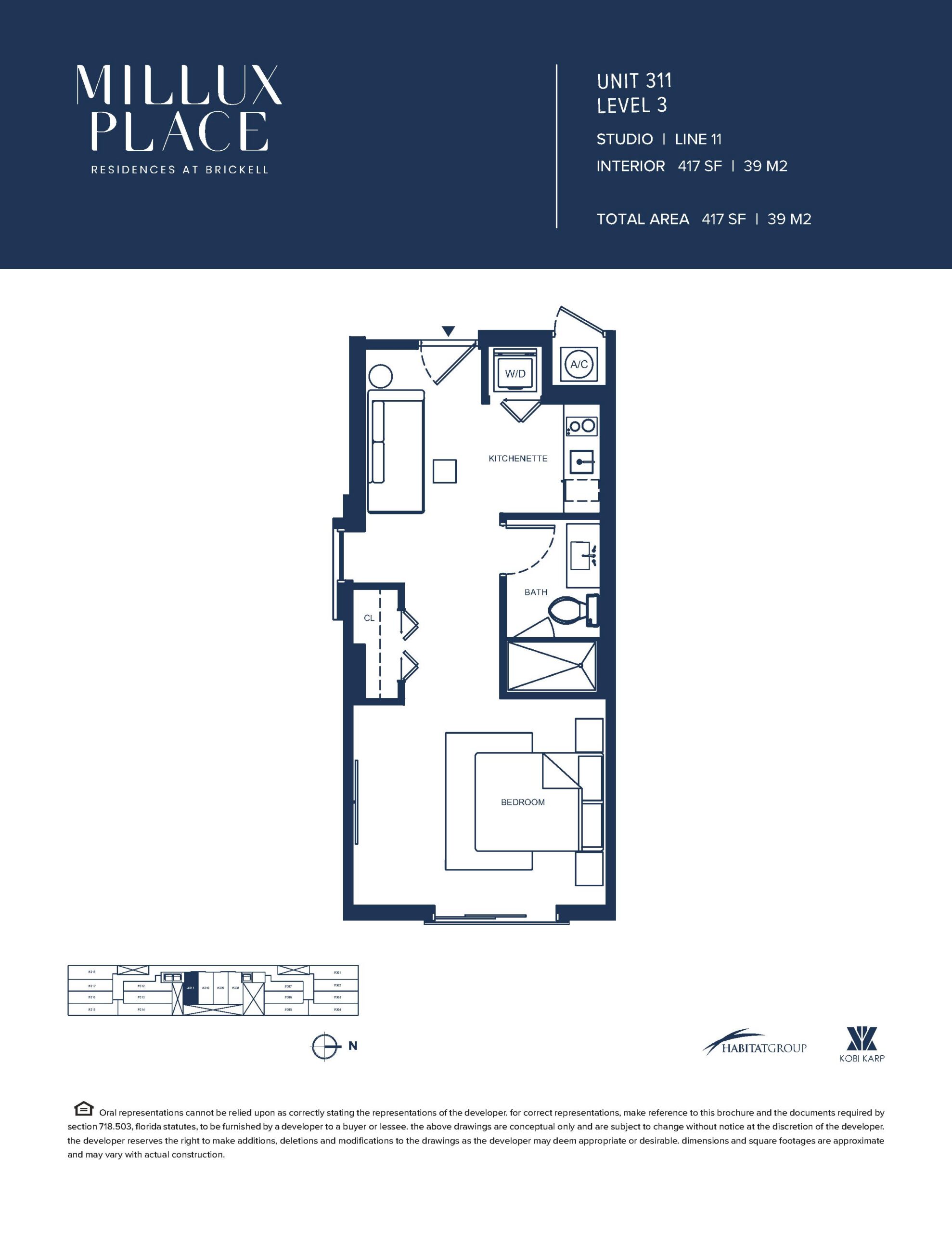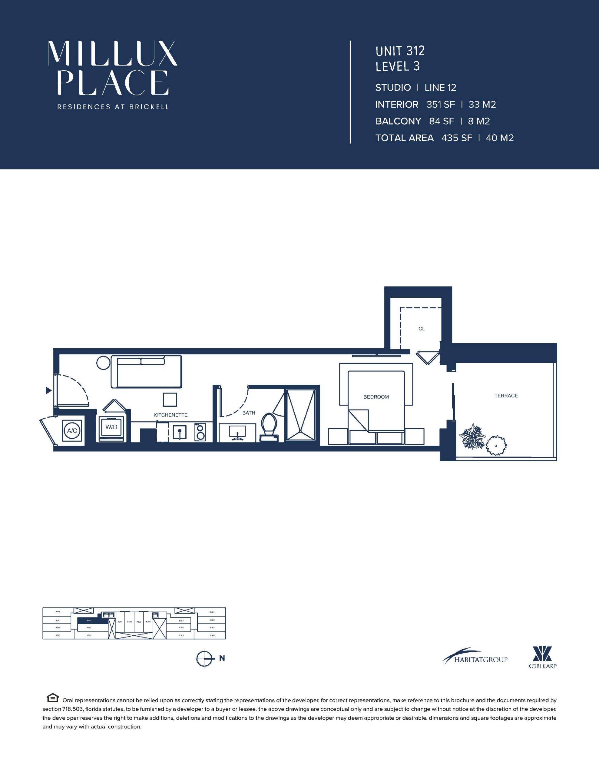 Millux Place introduces a refined boutique presence in the heart of Brickell, rising eight stories with 99 luxury residences designed for contemporary urban living. Conceived as a mixed use condo lodging property, the building is fully finished and furnished, offering turnkey residences that blend residential comfort with hospitality level convenience. Short term rentals are permitted and supported by on site hospitality management, creating flexibility for owners while maintaining a cohesive residential experience. Designed by Kobi Karp and developed by Habitat Group in collaboration with BI Group USA, Millux Place reflects a modern architectural aesthetic tailored to Brickell’s dynamic skyline. Its prime location within the neighborhood places residents at the center of Miami’s financial and cultural energy while maintaining the scale and intimacy of a boutique address.Residences feature open concept floor plans that range from studios to one, two, and three bedroom layouts. Each home is delivered fully furnished and thoughtfully appointed with marble countertops, stainless steel appliances, and custom Italian cabinetry that brings a clean, contemporary finish to the kitchens. Floor to ceiling impact resistant windows fill the interiors with natural light, while private balconies enclosed with glass railings extend the living space outdoors. Bathrooms are designed with frameless glass showers and Italian cabinetry, reinforcing a cohesive modern aesthetic. Every residence includes a washer and dryer along with a high efficiency central air conditioning and heating system, ensuring comfort and functionality throughout the year. The result is a collection of homes that feel polished, efficient, and move in ready from day one.