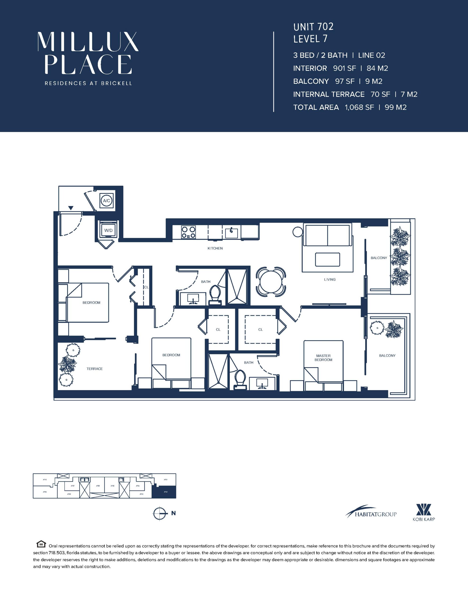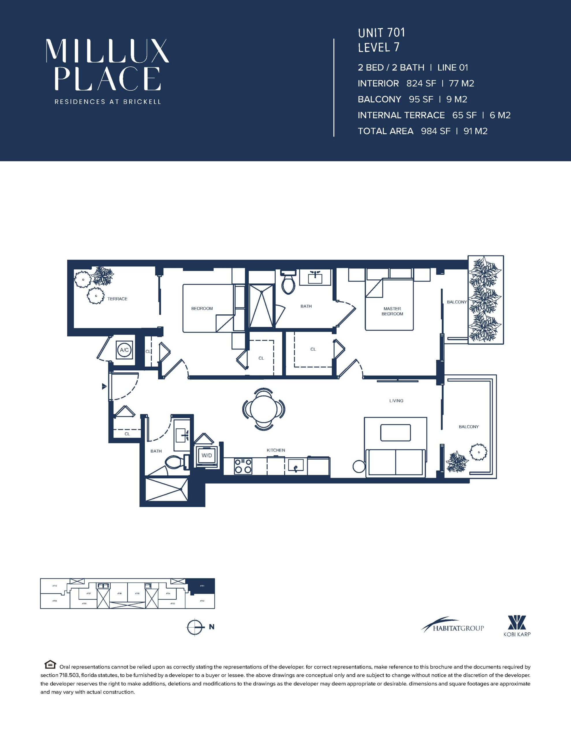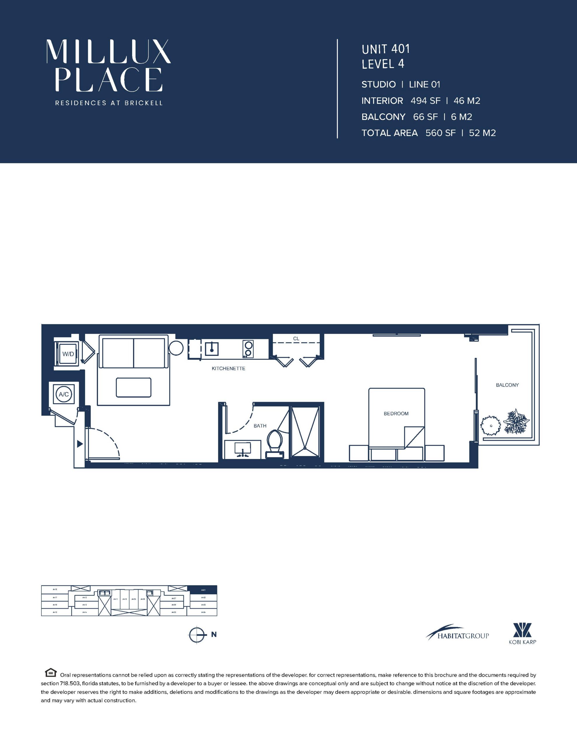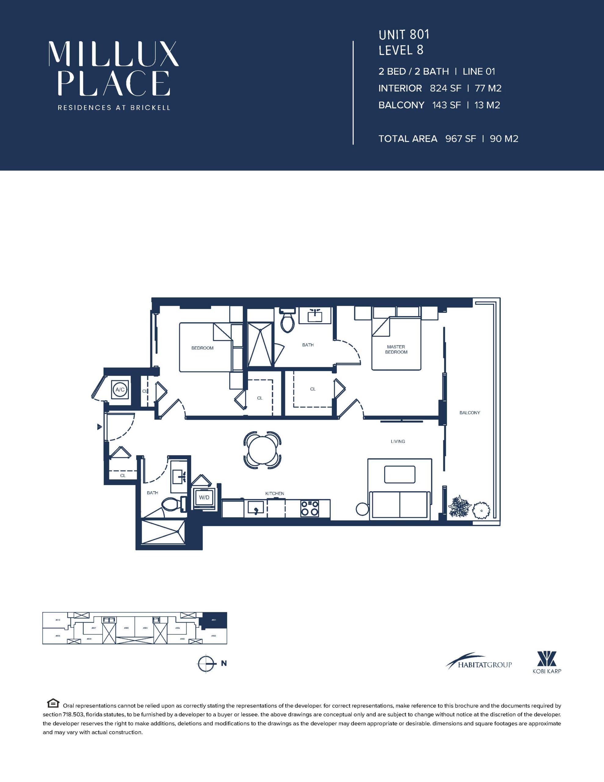 Millux Place introduces a refined boutique presence in the heart of Brickell, rising eight stories with 99 luxury residences designed for contemporary urban living. Conceived as a mixed use condo lodging property, the building is fully finished and furnished, offering turnkey residences that blend residential comfort with hospitality level convenience. Short term rentals are permitted and supported by on site hospitality management, creating flexibility for owners while maintaining a cohesive residential experience. Designed by Kobi Karp and developed by Habitat Group in collaboration with BI Group USA, Millux Place reflects a modern architectural aesthetic tailored to Brickell’s dynamic skyline. Its prime location within the neighborhood places residents at the center of Miami’s financial and cultural energy while maintaining the scale and intimacy of a boutique address.Residences feature open concept floor plans that range from studios to one, two, and three bedroom layouts. Each home is delivered fully furnished and thoughtfully appointed with marble countertops, stainless steel appliances, and custom Italian cabinetry that brings a clean, contemporary finish to the kitchens. Floor to ceiling impact resistant windows fill the interiors with natural light, while private balconies enclosed with glass railings extend the living space outdoors. Bathrooms are designed with frameless glass showers and Italian cabinetry, reinforcing a cohesive modern aesthetic. Every residence includes a washer and dryer along with a high efficiency central air conditioning and heating system, ensuring comfort and functionality throughout the year. The result is a collection of homes that feel polished, efficient, and move in ready from day one.