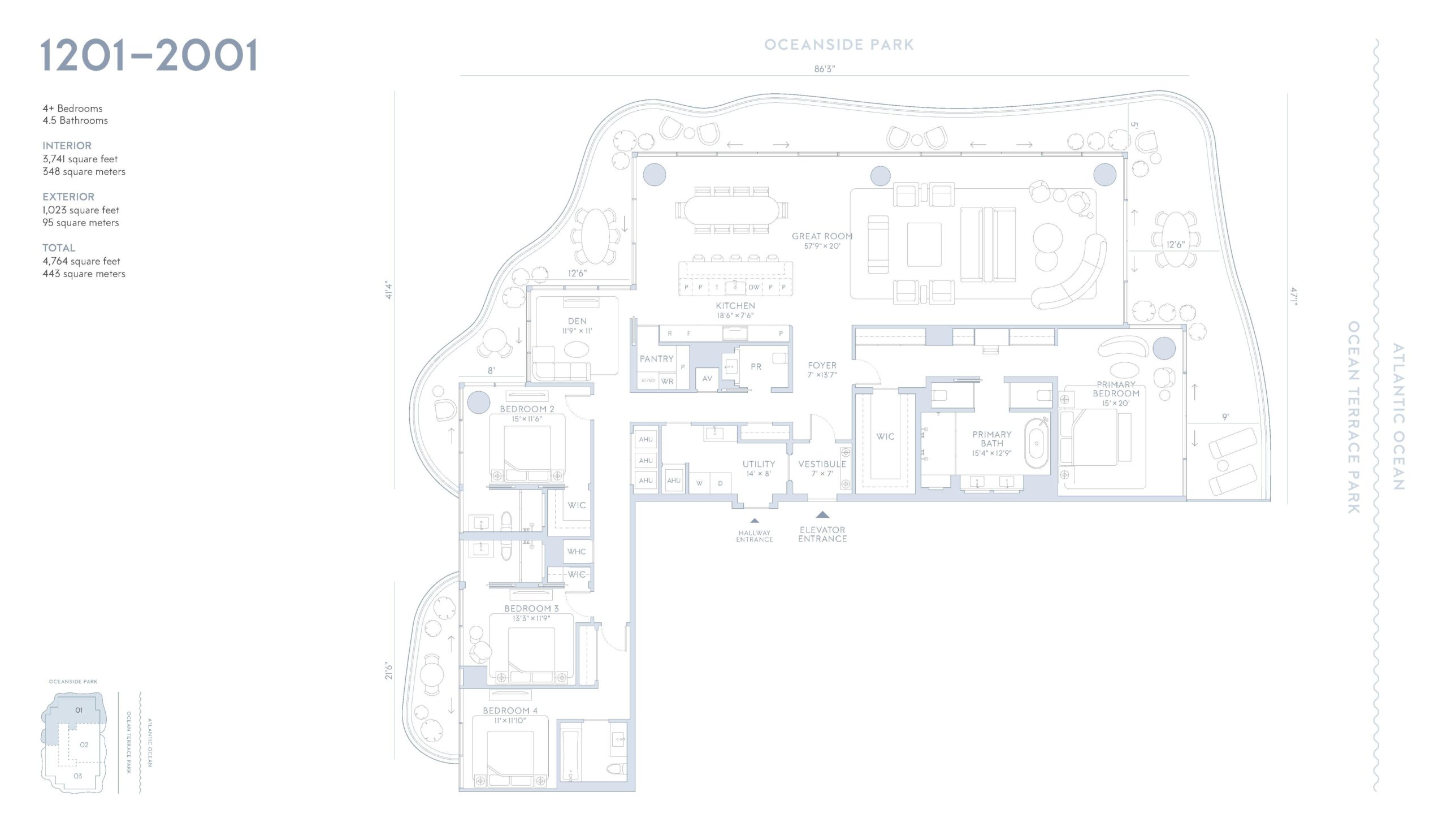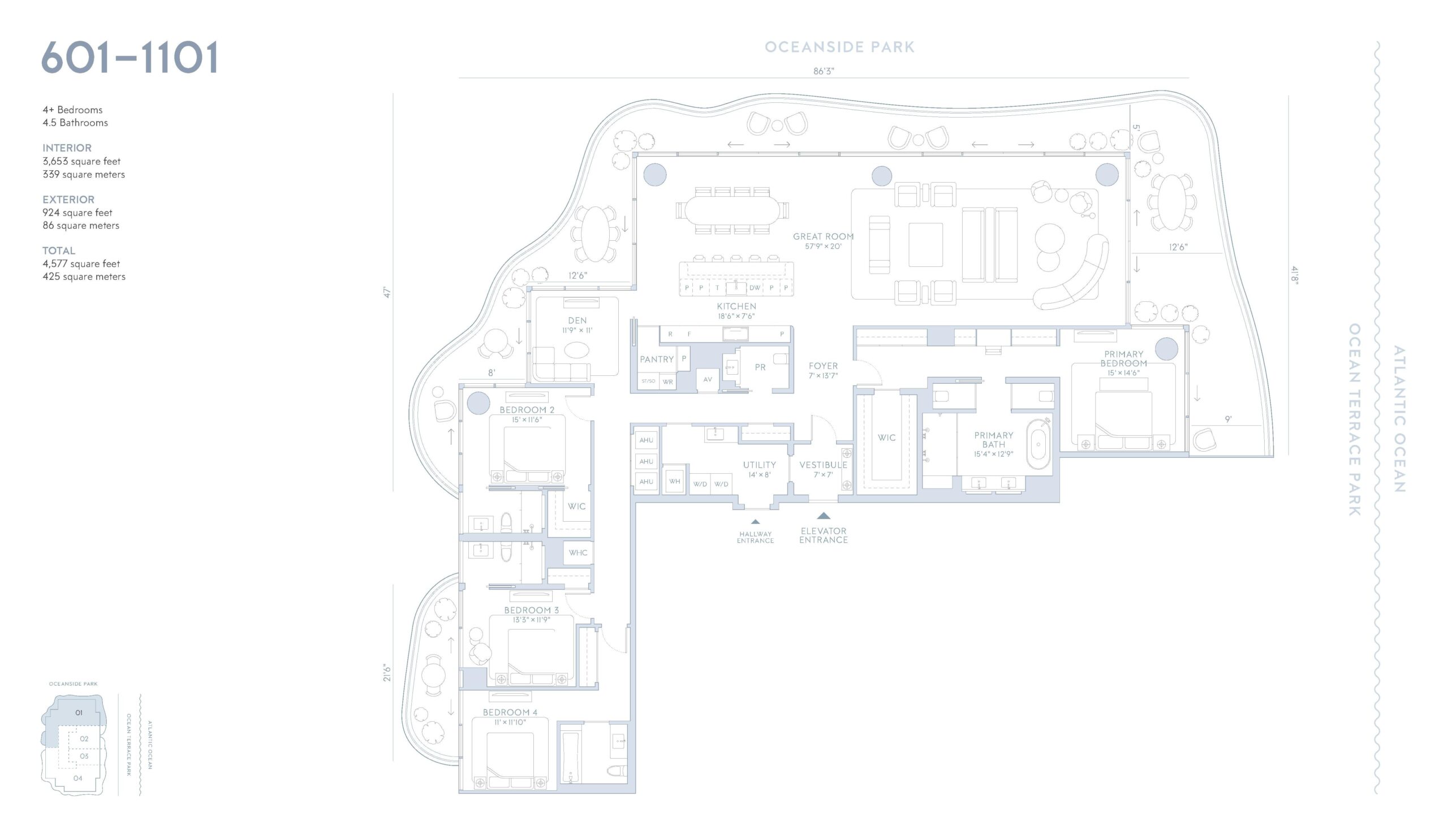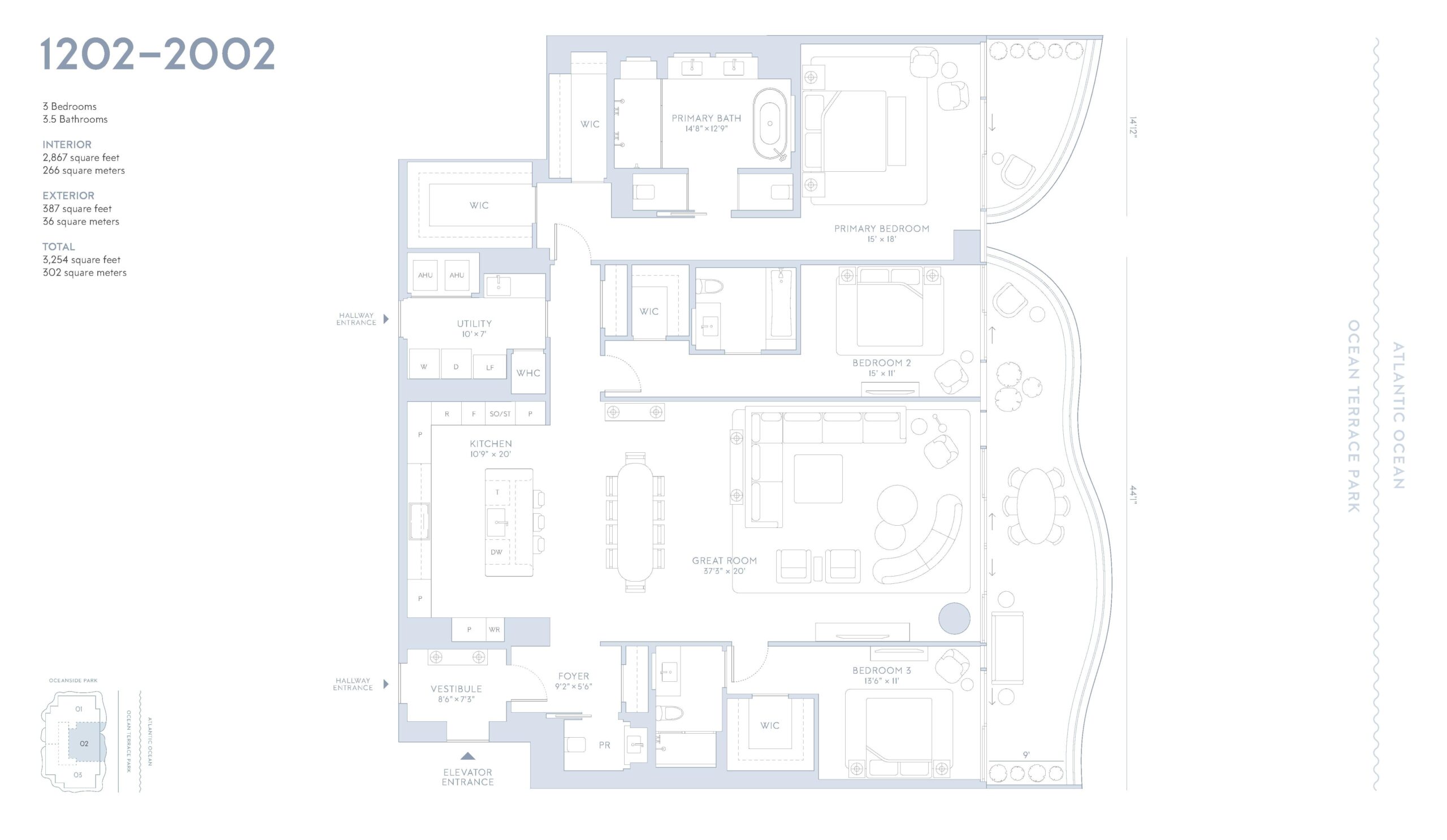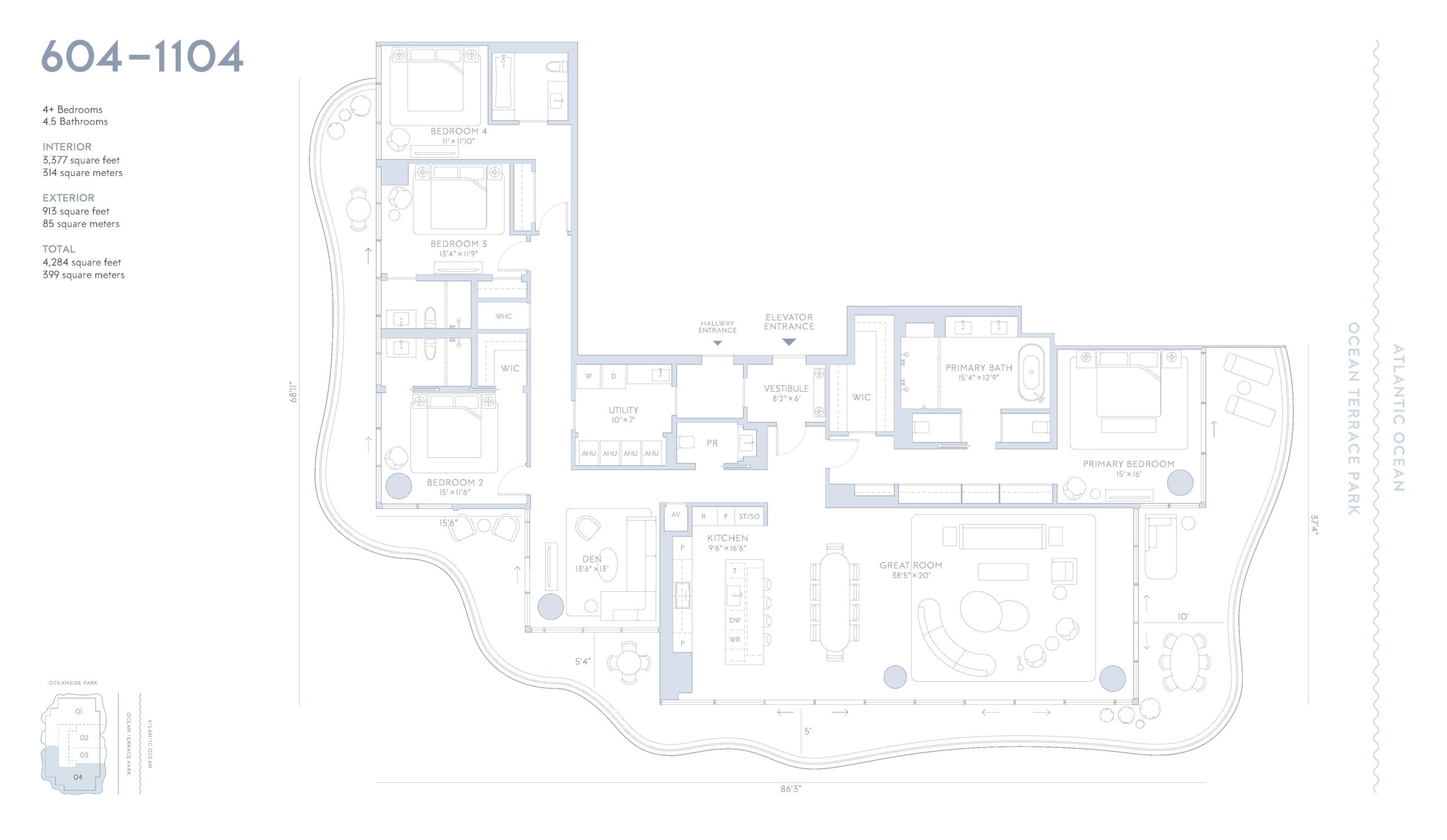 Ocean Terrace Residences is a landmark oceanfront development rising from five acres of lush tropical parkland in Miami Beach, delivering a rare blend of architecture, landscape, and lifestyle at an unprecedented scale. Developed by Witkoff in partnership with Ocean Terrace Holdings, the project spans two sculptural glass towers positioned along 350 feet of continuous Atlantic frontage. Ocean Terrace comprises a total of 76 residences, including 52 boutique residences occupying a dedicated 20 story tower and 24 resort residences located within the adjacent hotel tower. Each home is designed to capture cinematic views of the ocean, protected dunes, verdant parkland, and Biscayne Bay, while maintaining a strong sense of privacy. The setting is further elevated by the creation of Ocean Terrace Park, a new five acre botanical landscape designed by Raymond Jungles that forms a dramatic gateway from city to sea.The residences at Ocean Terrace are designed by Robert A.M. Stern Architects, blending classical elegance with relaxed coastal sophistication. Boutique residences feature interiors defined by Parquet de Versailles white oak flooring, natural stone finishes, subtle Art Deco references, and gracious indoor outdoor layouts that flow seamlessly onto expansive terraces. Floor to ceiling glass maximizes natural light and frames sweeping shoreline views, while private elevator landings create discreet, estate-like arrivals. The 24 resort residences are offered fully furnished with custom RAMSA designed interiors that reference refined nautical cues through curated materials, furnishings, and detailing. Kitchens are conceived as finely crafted furniture pieces with sculptural marble islands, custom cabinetry, and select homes offering walk in butler pantries. Primary bathrooms are finished in honed and vein cut stone with freestanding tubs, ribbed glass enclosures, and bespoke vanities, reinforcing the residential scale and craftsmanship throughout.