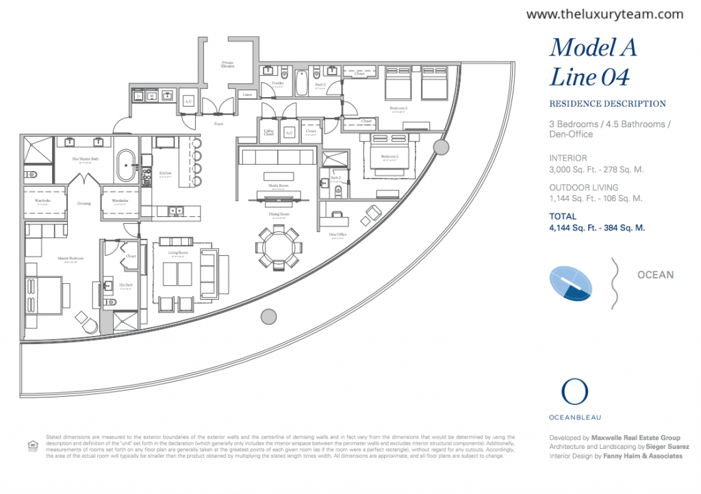 Each master bathroom is designed European style with a separate spa tub and shower area. The community at Oceanbleau in Hollywood is rich with amenities, entertainment, lifestyle and shopping options. All residents can enjoy towel and umbrella service on the beach, or lounge in the beautifully landscaped outdoor pool area. Fully-equipped poolside cabanas are available for use in this resort style spa environment. His and her’s steam and massage lounges, aerobics studios, and community fitness classes are available for those looking to live a healthy lifestyle. A state of the art fitness center is available to all residents, as well as a social room, outdoor garden and BBQ, and 24-hour security, valet, and front desk assistance. The Oceanbleau is pet friendly and residents have 24-hour access to free garage parking.As if there wasn’t enough to do on the premises at The Oceanbleau, it is conveniently located within walking distance to dozens of dining and shopping establishments. Just a short drive from The Mall at Aventura, Bal Harbour Shops, and downtown Fort Lauderdale, Oceanbleau is close enough to most major attractions in South Florida. Historic Gulf Stream Park, Fort Lauderdale Art Museum, South Beach are all just a short ride away. Situated close to the A1A and I-95 highways, The Oceanbleau offers easy access to both Fort Lauderdale and Miami International airports. Don’t miss out on this opportunity to own a luxury residence in the heart of fast-growing Hollywood. Construction is scheduled for completion in December 2016 with fully-furnished move-in-ready units available.