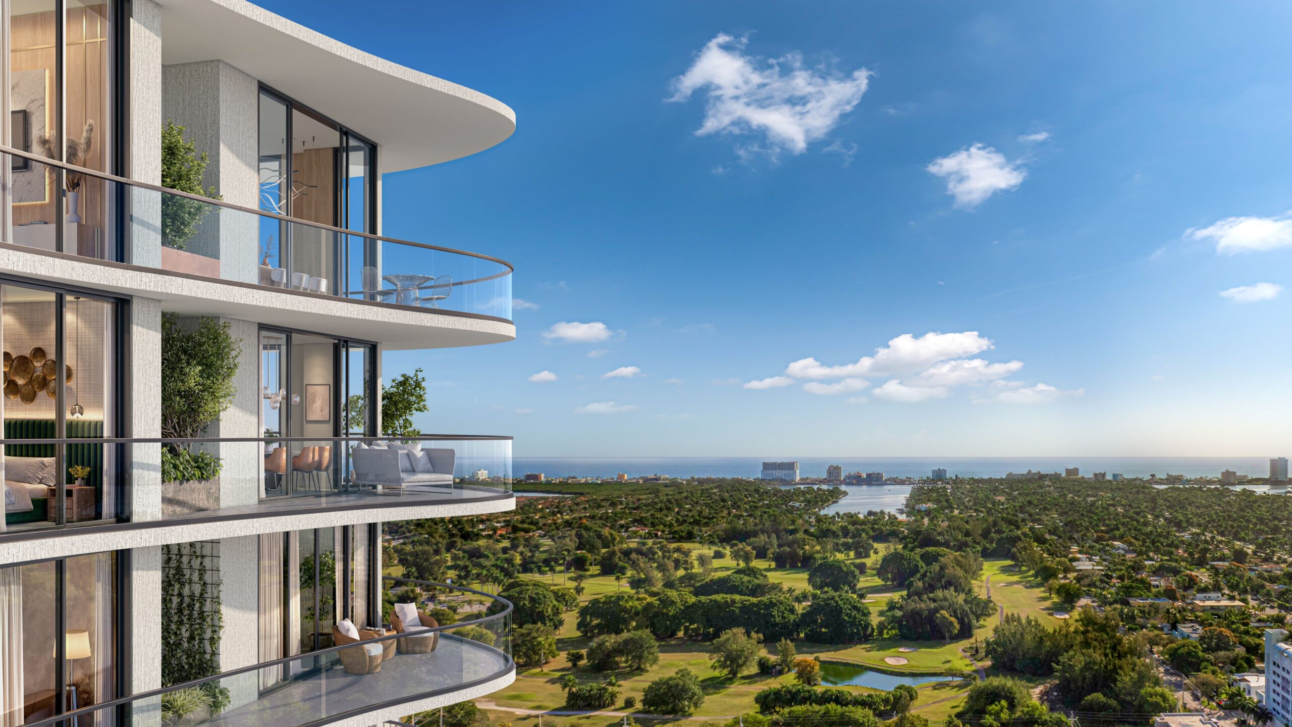 One Hollywood Residences stands as a beacon of luxury and convenience in Hollywood, Florida, boasting 248 residences within its 23-story structure, designed by BC Architects with interiors by Domus Aurea Interiors and landscaping by Keith Engineering Landscape. This premier building offers a range of units from efficiently designed studios to expansive three-bedroom plus den residences, with sizes ranging from 571 square feet to an impressive 1,745 square feet. Perfectly situated, residents are just a stone’s throw from pristine beaches and an array of excellent dining and shopping options, as well as public golf courses.Each residence in One Hollywood is a masterpiece of design, fully finished with smart home technology and a choice of flooring options. The homes are crafted to maximize comfort and aesthetics, featuring floor-to-ceiling windows that frame stunning city views and open out onto private balconies with sleek glass railings. The kitchens are a culinary dream with European-style cabinetry, quartz countertops, and top-of-the-line appliances. Bathrooms match this high standard with modern cabinetry, imported porcelain flooring, and luxurious quartz countertops, making every moment spent at home an indulgence.