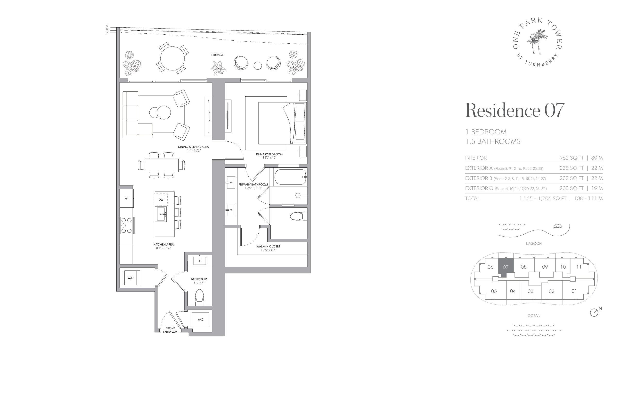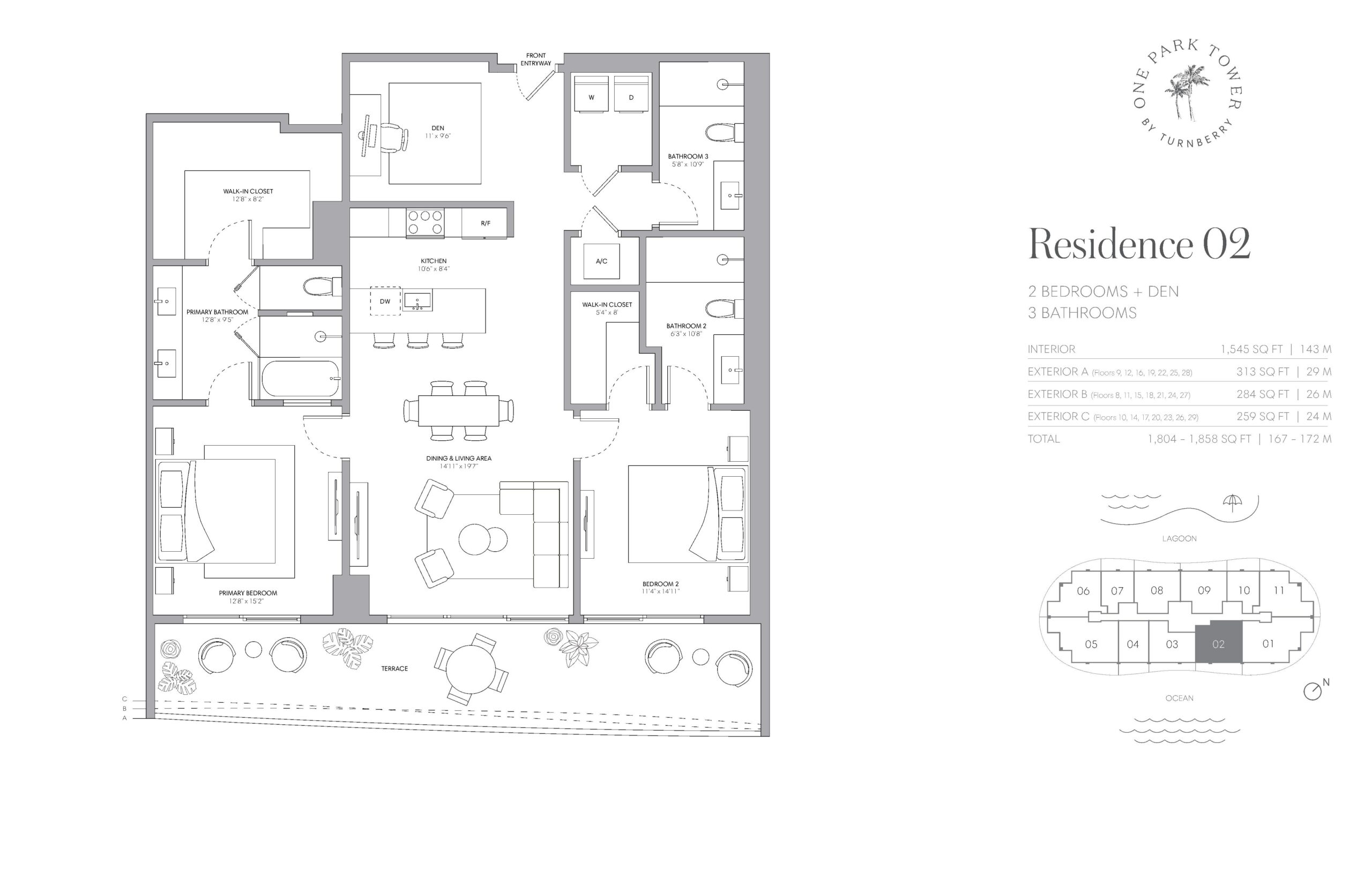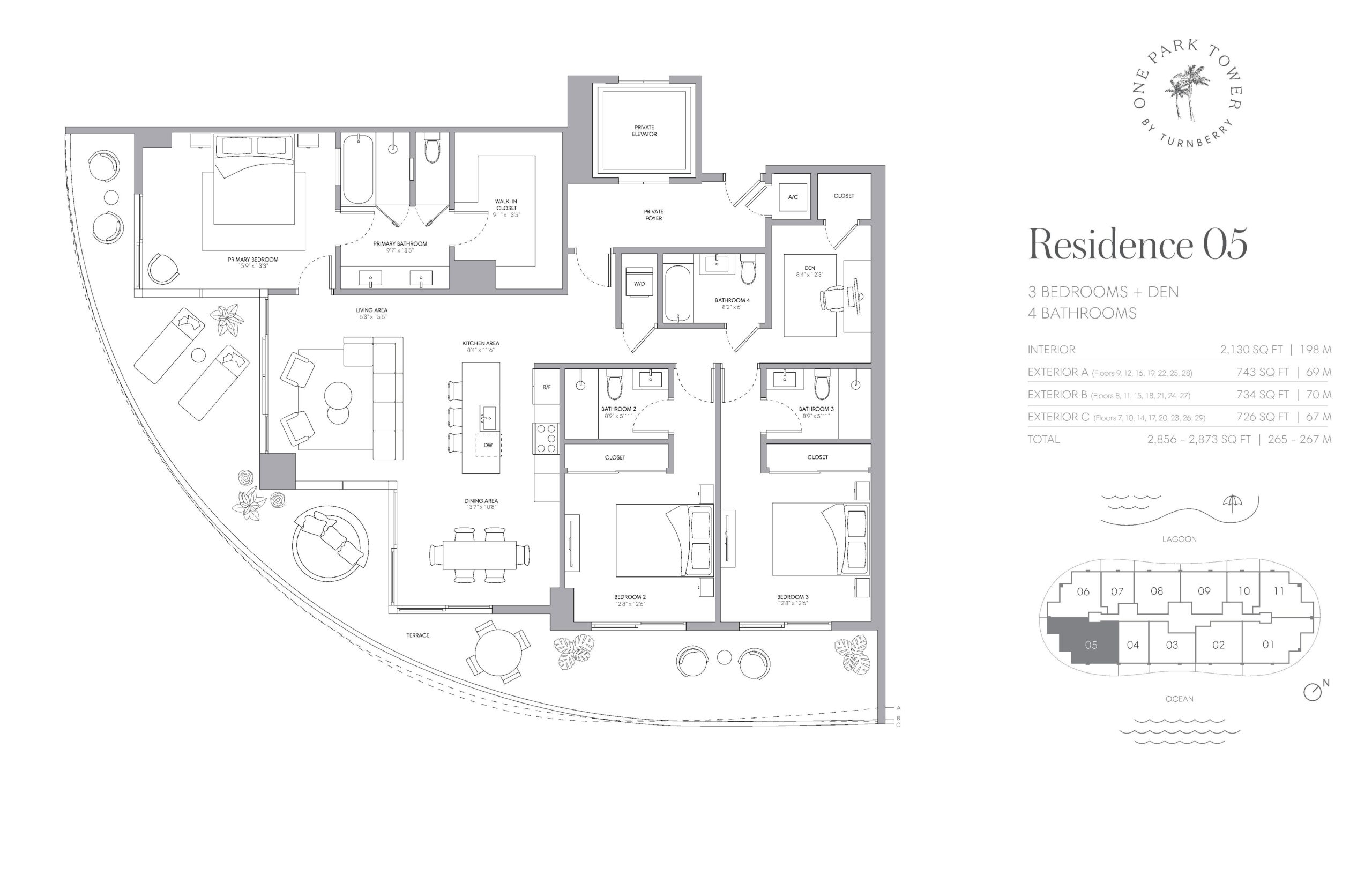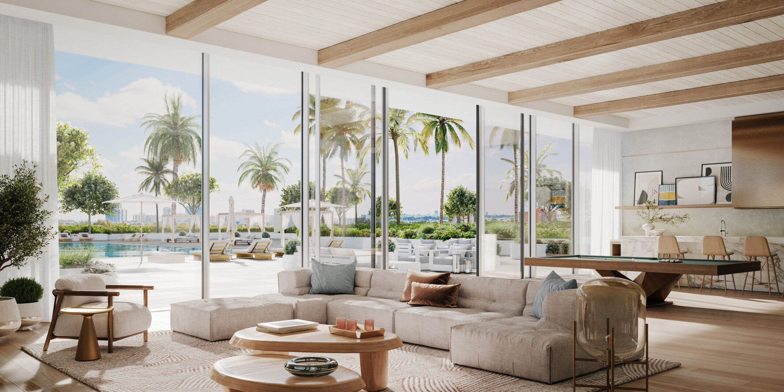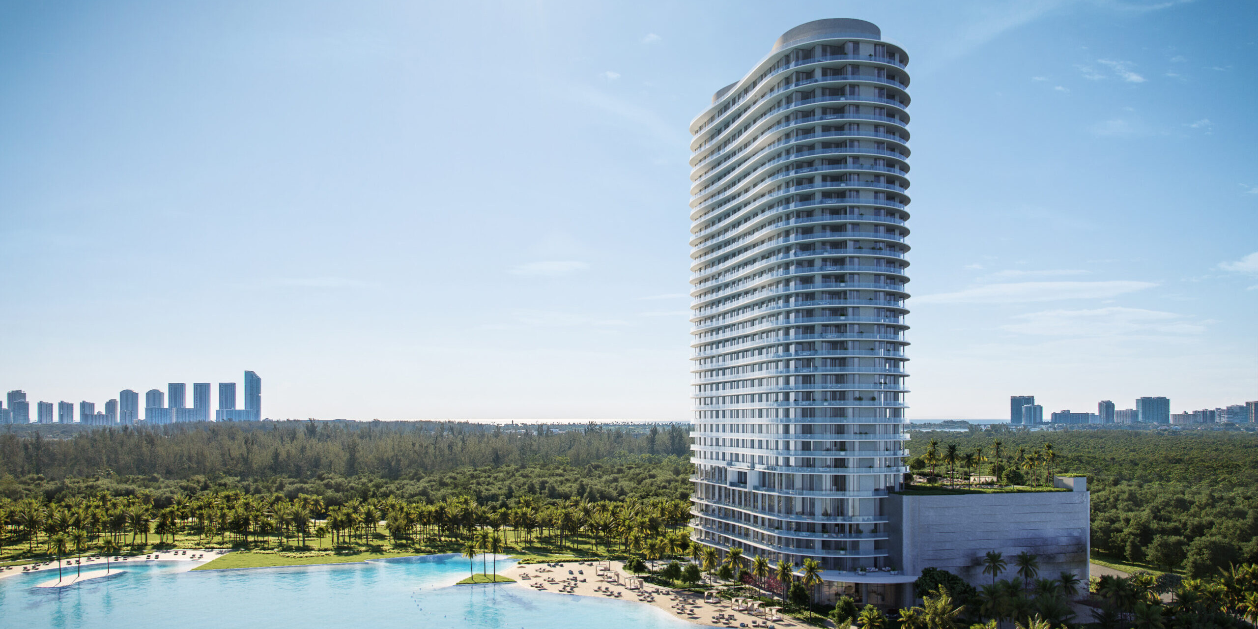 One Park Turnberry is a landmark residential tower rising within SoLé Mia, a visionary 184 acre master planned community set between Biscayne Bay and Oleta River State Park. Developed by Turnberry, the 33 story tower features 292 luxury one, two, and three bedroom residences along with a limited collection of penthouse homes. Residences range from approximately 962 square feet at the low end to nearly 3,000 square feet for the largest layouts, with expansive wraparound terraces that significantly extend total living areas in many homes. Positioned just minutes from Miami Beach, Bal Harbour, and Aventura, One Park Turnberry is defined by its seamless integration of resort living, nature, and urban access, all anchored by panoramic views of the Atlantic Ocean, the Miami skyline, Oleta River State Park, and the seven acre Crystal Lagoon.Interiors at One Park Turnberry are designed by Meyer Davis Studio and emphasize space, flow, and refined detailing. Open floorplans feature nine foot plus ceiling heights, sound insulated walls, and floor to ceiling glass that connects interiors to oversized private terraces with seamless glass railings. Kitchens are outfitted with Italian cabinetry by Italkraft, porcelain stone countertops and backsplashes, and Sub Zero and Wolf appliance packages, blending performance with timeless design. Primary suites include generous walk in closets and spa inspired bathrooms with Italian vanities, frameless glass showers, and soaking tubs in select layouts. Smart technology readiness and solid core doors throughout reinforce a sense of privacy and quality across every residence.