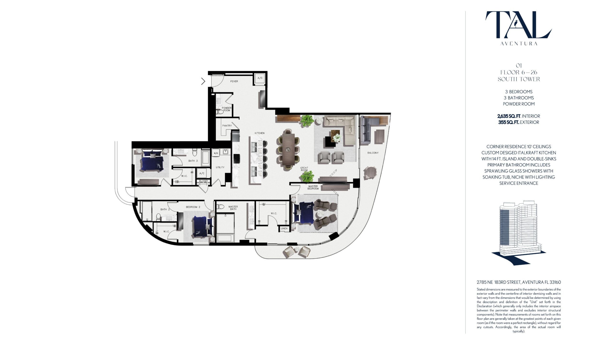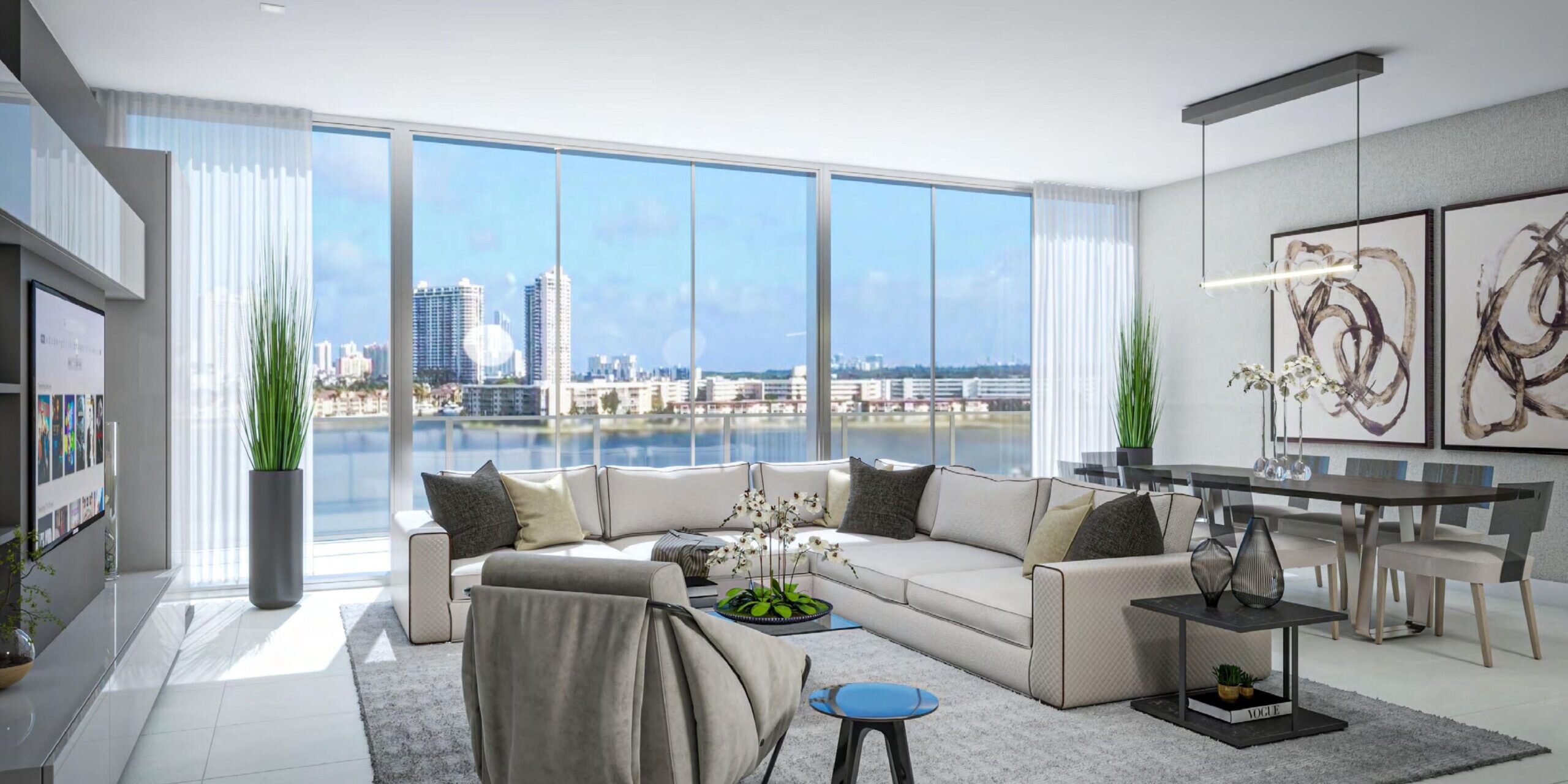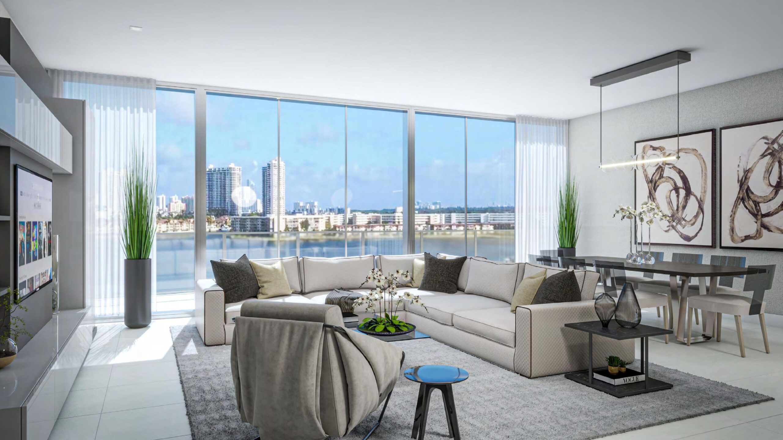 TAL Aventura is a visionary condominium development co-developed by New Jersey-based 2020 Acquisitions and Miami-based 2151 Development. Their aim is to create residences that offer a single-family home lifestyle at an accessible price point. Tal Aventura comprises 86 units across 27 floors, with delivery set for 2025. Prices start at $1,500,00, with units ranging from two to five bedrooms and sizes spanning 1,235 to 6,180 square feet. Designed by IDEA Architects with interiors by IDDI, this development promises a blend of luxury, comfort, and breathtaking views. The building features curvilinear elevations, floor-to-ceiling glass windows, and rounded balcony slabs, enhancing its modern appeal and integrating seamlessly into the Aventura skyline. Residences at TAL Aventura are designed to maximize comfort and style. The units feature expansive floor-to-ceiling glass windows that offer stunning views of the Atlantic Ocean, Maule Lake, Aventura, and Sunny Isles. The lofty 10-foot ceilings, which extend to 11 feet on higher floors, add to the airy ambiance of the living spaces. Kitchens are crafted by Italkraft, featuring oversized quartz islands and top-of-the-line Sub-Zero and Wolf appliance packages, including double sinks, wine coolers, dishwashers, and walk-in pantries. Each residence is equipped with AXOR-Hansgrohe fixtures, private elevators, and porcelain tile throughout. The spacious laundry rooms come with full-size washers and dryers, and most include utility sinks. Primary bedrooms boast walk-in closets and master bathrooms with custom double vanities, quartz countertops, glass showers, and freestanding soaking tubs. Refined powder rooms feature full-height porcelain walls and contemporary floating vanities.