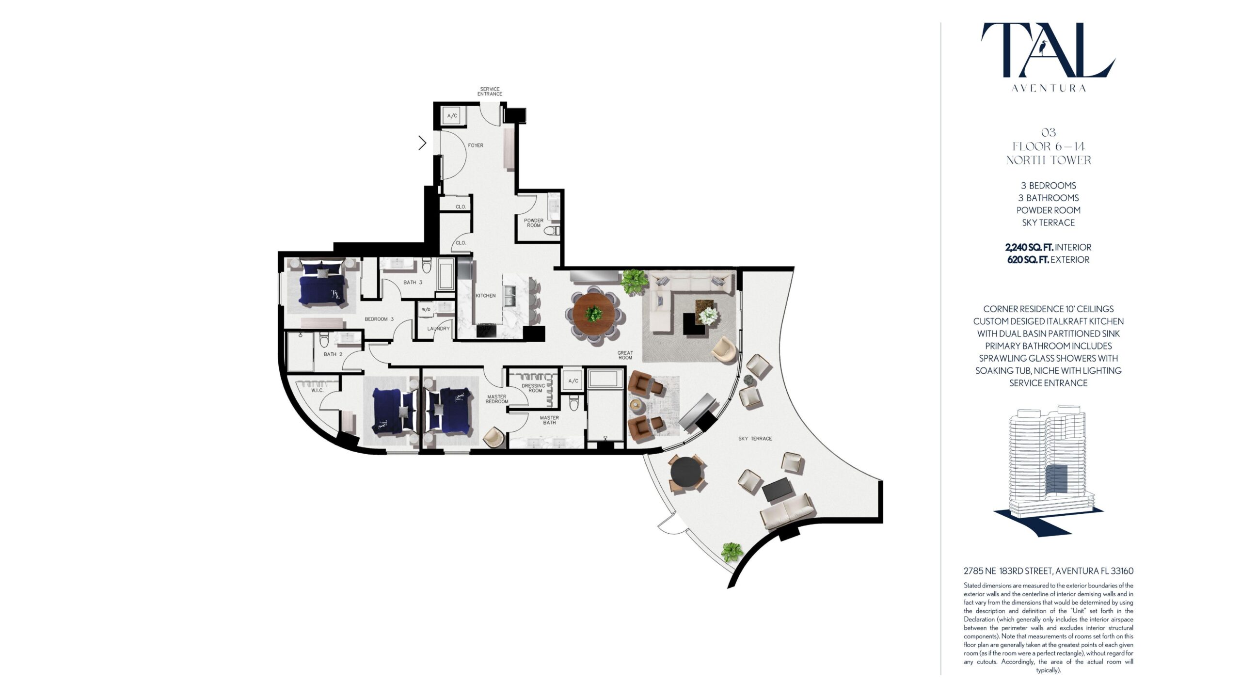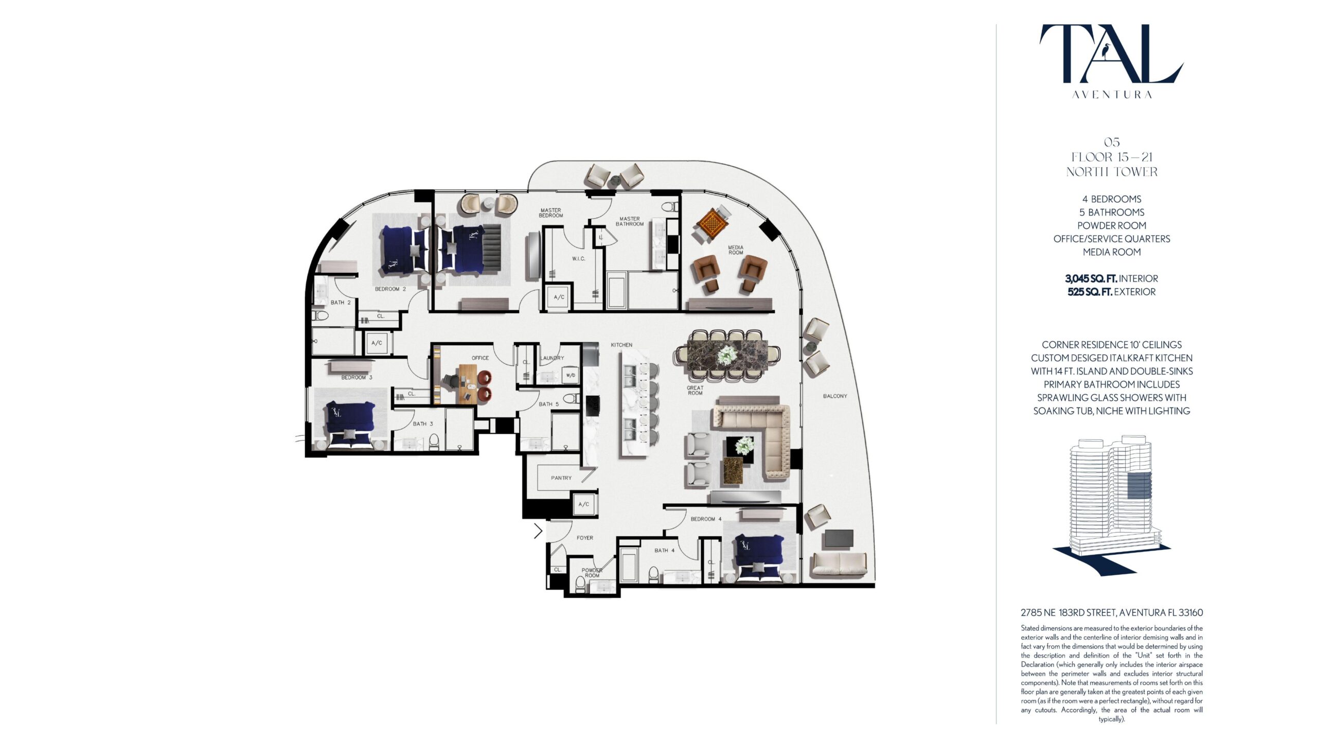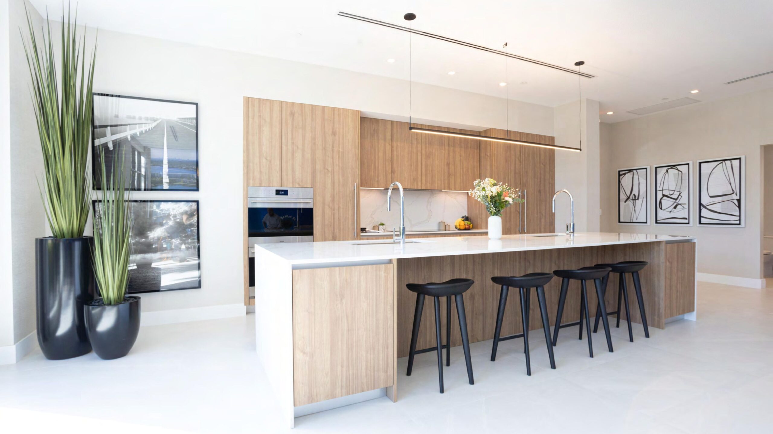 TAL Aventura is a visionary condominium development co-developed by New Jersey-based 2020 Acquisitions and Miami-based 2151 Development. Their aim is to create residences that offer a single-family home lifestyle at an accessible price point. Tal Aventura comprises 86 units across 27 floors, with delivery set for 2025. Prices start at $1,500,00, with units ranging from two to five bedrooms and sizes spanning 1,235 to 6,180 square feet. Designed by IDEA Architects with interiors by IDDI, this development promises a blend of luxury, comfort, and breathtaking views. The building features curvilinear elevations, floor-to-ceiling glass windows, and rounded balcony slabs, enhancing its modern appeal and integrating seamlessly into the Aventura skyline. Residences at TAL Aventura are designed to maximize comfort and style. The units feature expansive floor-to-ceiling glass windows that offer stunning views of the Atlantic Ocean, Maule Lake, Aventura, and Sunny Isles. The lofty 10-foot ceilings, which extend to 11 feet on higher floors, add to the airy ambiance of the living spaces. Kitchens are crafted by Italkraft, featuring oversized quartz islands and top-of-the-line Sub-Zero and Wolf appliance packages, including double sinks, wine coolers, dishwashers, and walk-in pantries. Each residence is equipped with AXOR-Hansgrohe fixtures, private elevators, and porcelain tile throughout. The spacious laundry rooms come with full-size washers and dryers, and most include utility sinks. Primary bedrooms boast walk-in closets and master bathrooms with custom double vanities, quartz countertops, glass showers, and freestanding soaking tubs. Refined powder rooms feature full-height porcelain walls and contemporary floating vanities.