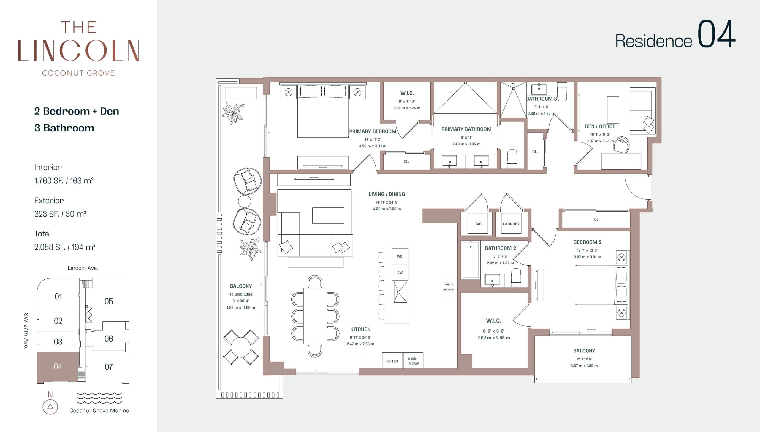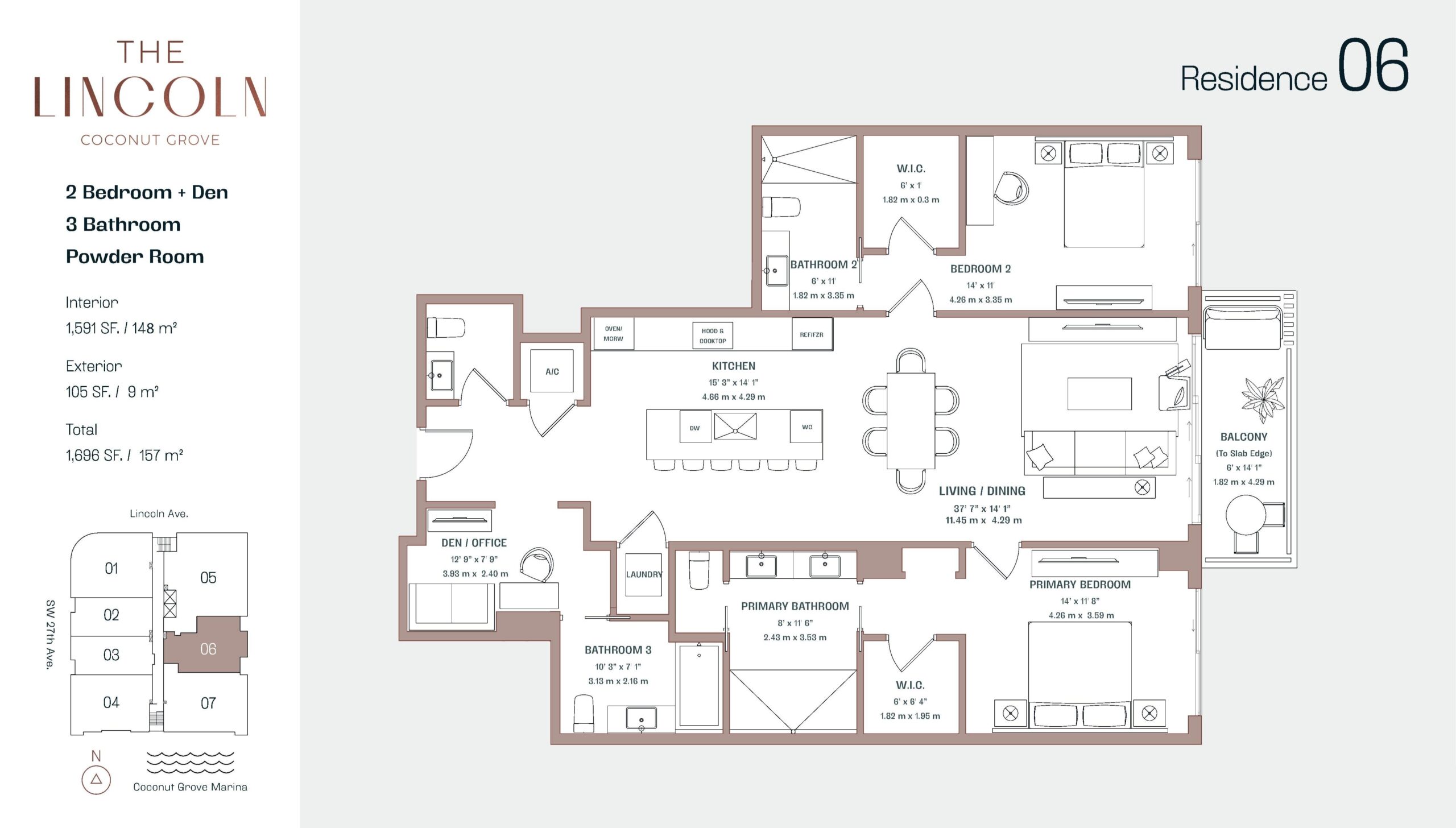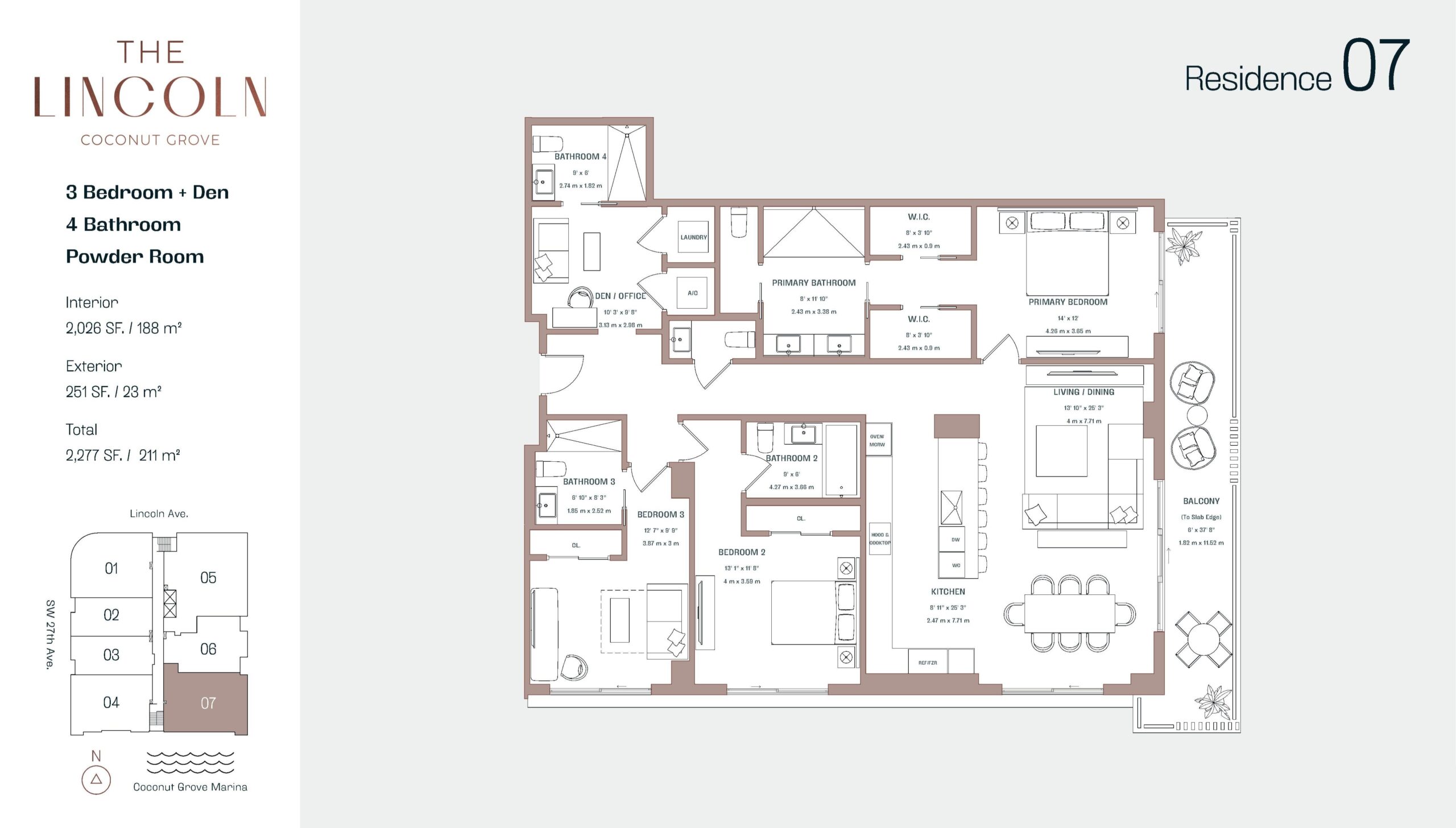 The Lincoln Coconut Grove introduces an exclusive boutique residential experience in one of Miami’s most walkable and desirable neighborhoods. Limited to just 48 luxury residences, the building offers one to four bedroom layouts plus den options, thoughtfully designed to support living, working, and entertaining with ease. Ceiling heights reach up to eleven feet, enhancing the sense of volume throughout oversized floor plans that emphasize light and flow. Located just a three minute walk from Coconut Grove’s restaurants, parks, marinas, and shops, The Lincoln balances privacy and accessibility while remaining within fifteen minutes of Coral Gables, Brickell, Downtown Miami, Miami Beach, and Miami International Airport.Residences at The Lincoln are finished with a refined, modern palette and a focus on everyday livability. Interiors feature porcelain flooring throughout, expansive walk-in closets, eight foot doors with concealed hinges, recessed LED lighting, and in-unit washer and dryer. Spacious private balconies with glass railings and power outlets extend living spaces outdoors. Kitchens are chef inspired and designed by Snaidero, featuring Italian crafted cabinetry, quartz stone countertops, islands up to ten feet long, integrated panelized refrigerators, built in Miele wine fridges, induction cooktops, and wall mounted ovens. Primary bathrooms are equally elevated with floor to ceiling glass showers, marble countertops, resort inspired vanities, Toto fixtures, and premium Brizo fittings, creating a calm and polished retreat.