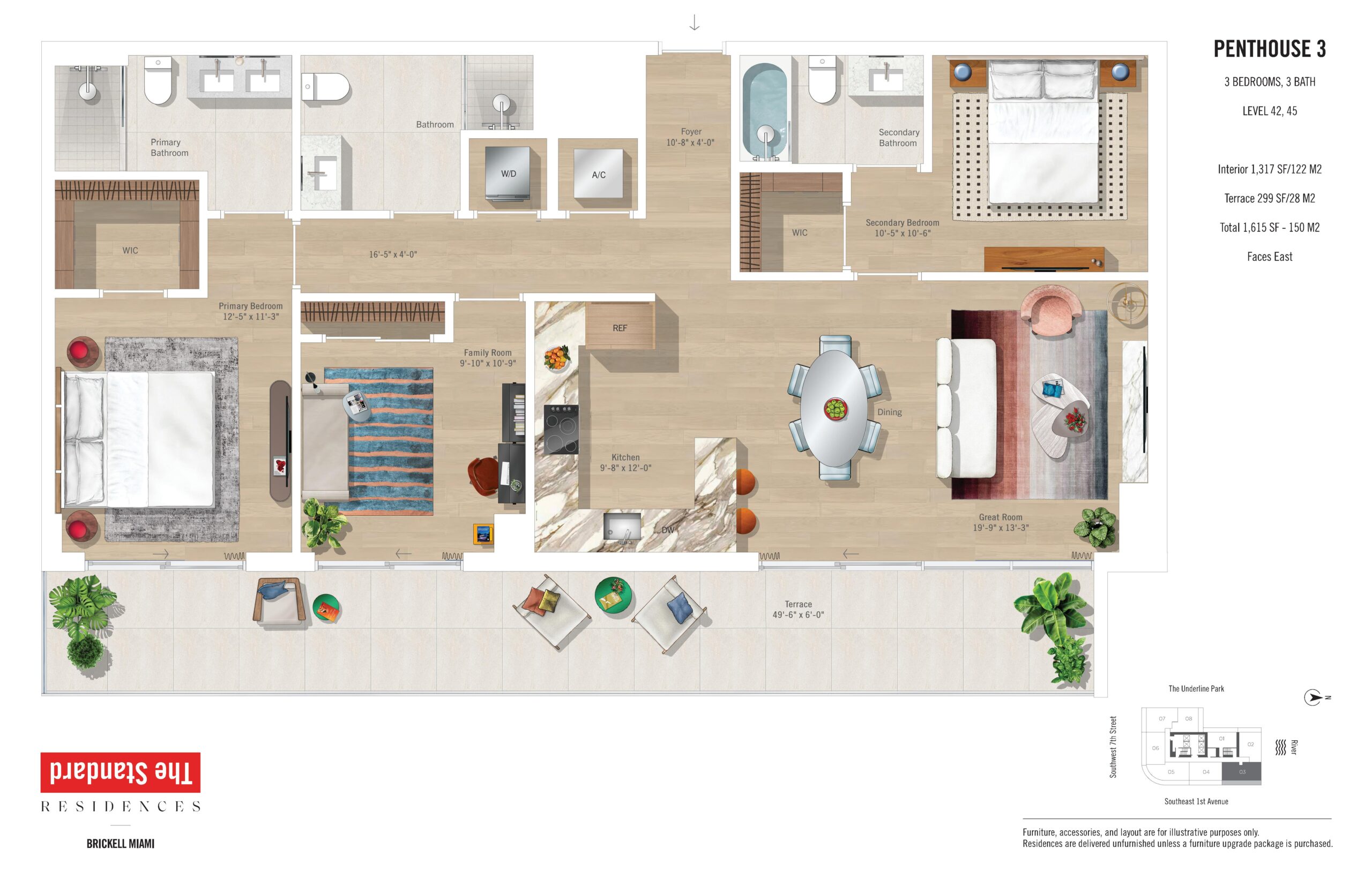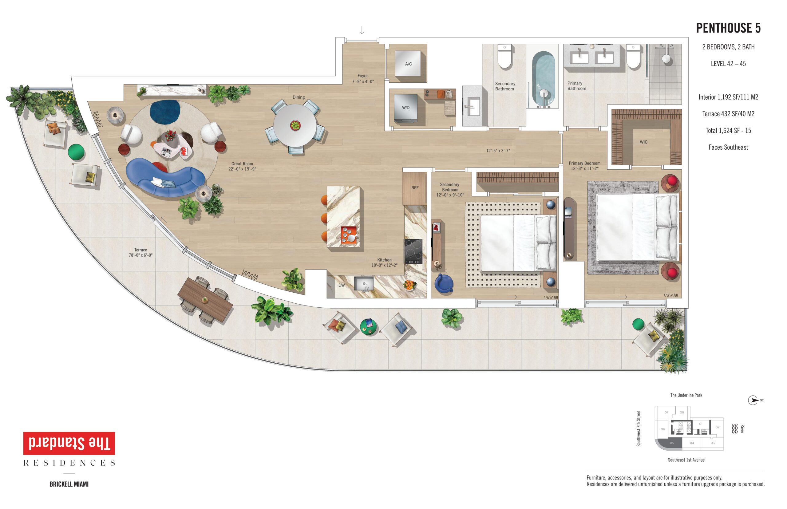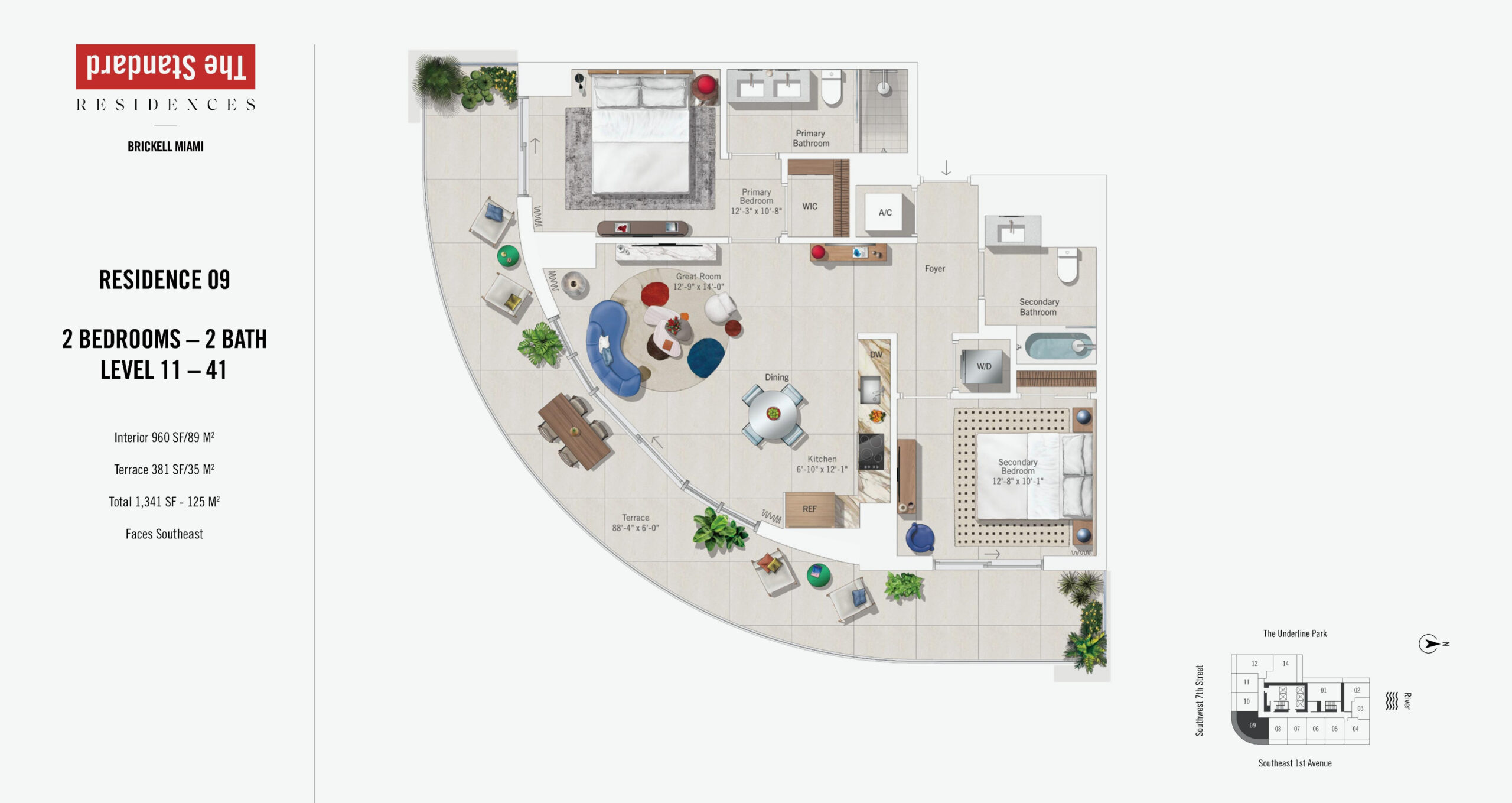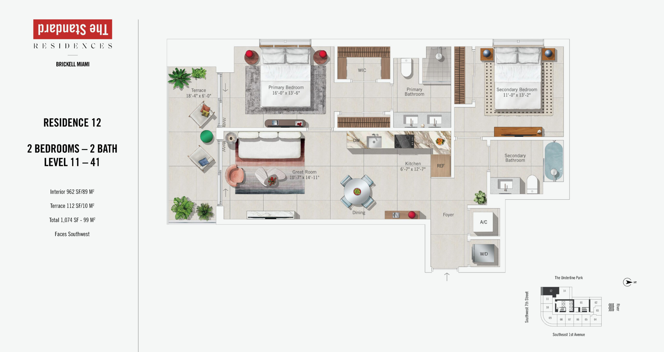 The Standard Residences, Brickell Miami rises 46 stories at 690 SW 1st Avenue, introducing a bold residential tower infused with the globally recognized Standard brand. Currently under construction and scheduled for completion in 2027, the building will offer 422 residences designed for modern urban living in the center of Brickell. Floor plans range from studios starting at approximately 491 square feet to expansive one and two bedroom residences, with penthouse offerings extending to three bedroom layouts of up to roughly 1,317 square feet. Positioned steps from Brickell City Centre, South Miami Avenue, and major transit connections, the property places residents at the intersection of Miami’s financial, cultural, and social energy.Residences are designed with a refined yet relaxed aesthetic that reflects The Standard’s signature approach to lifestyle driven design. Interiors feature nine foot ceilings, imported porcelain flooring, and keyless entry systems for everyday ease. Kitchens are outfitted with Italian crafted Italkraft cabinetry, integrated paneled refrigerators, ceramic glass stovetops, built in speed ovens, quiet dishwashers, and premium Miele appliance packages. Oversized stainless steel zero radius sinks add a functional modern edge, while en suite bathrooms continue the elevated look with Italian cabinetry and sleek finishes. Primary bedrooms include generous walk in closets, and select penthouse residences offer ceiling heights up to ten feet, enhancing volume and views of the Miami River, Biscayne Bay, and the Brickell skyline.