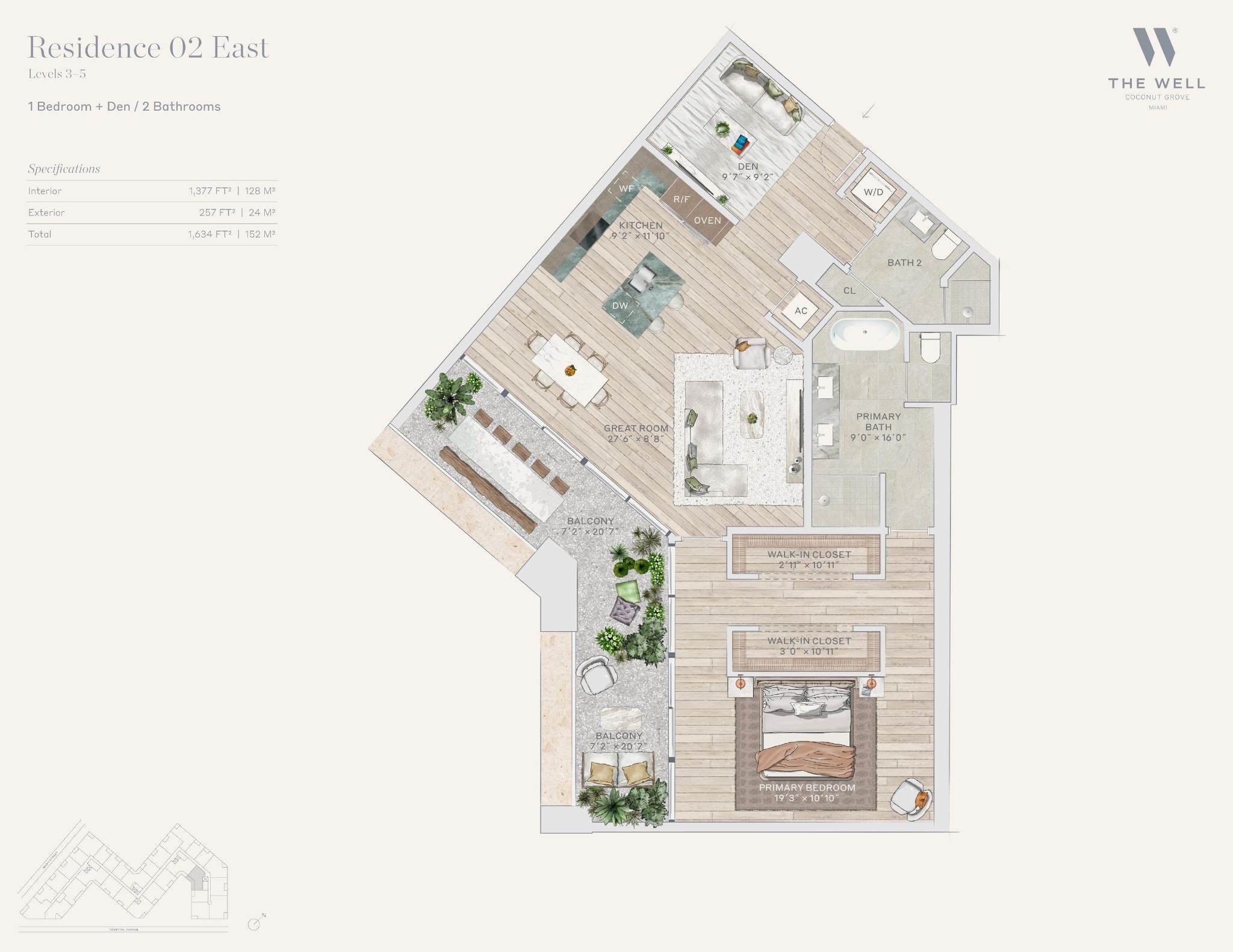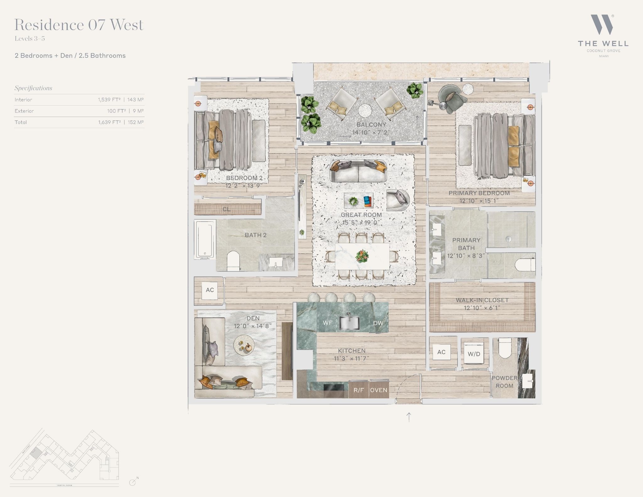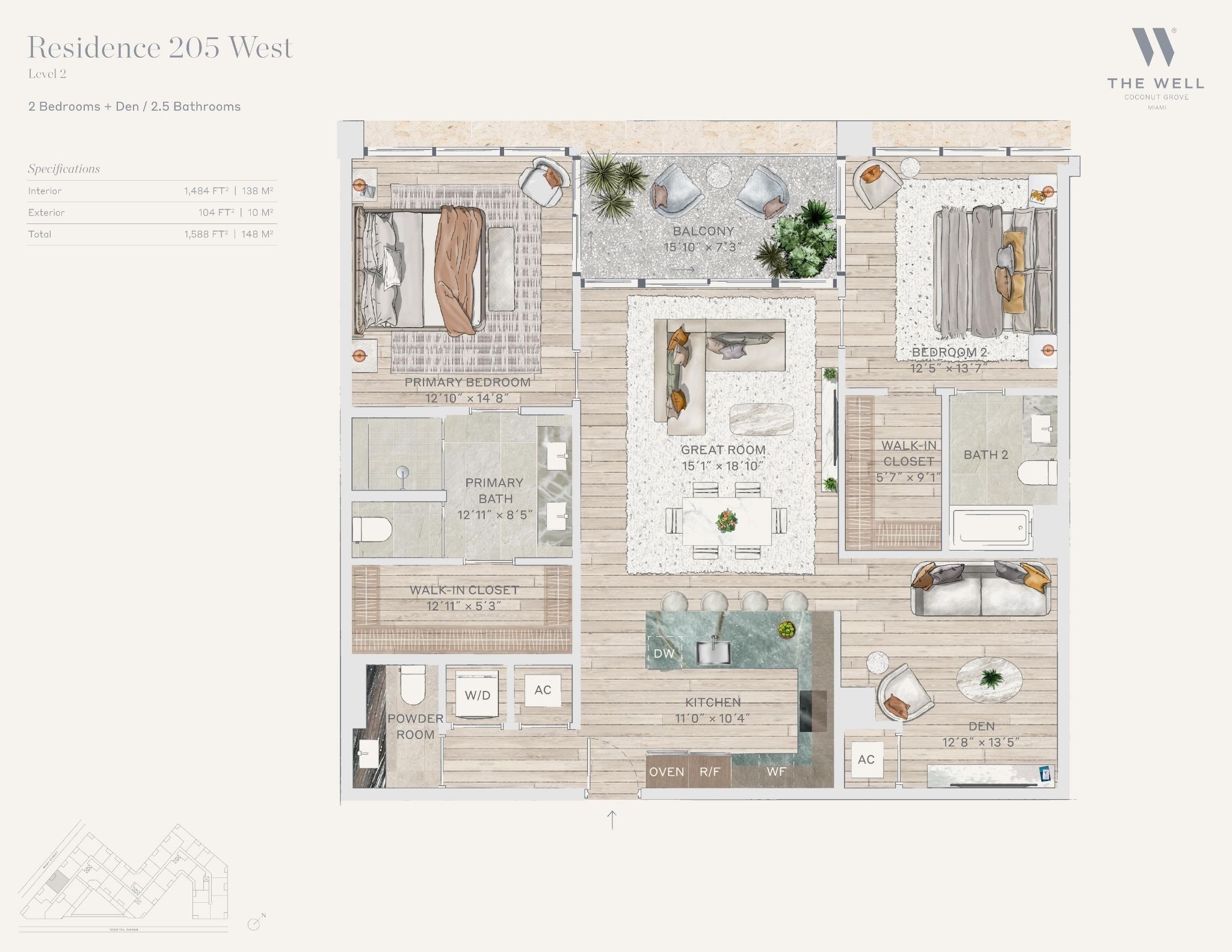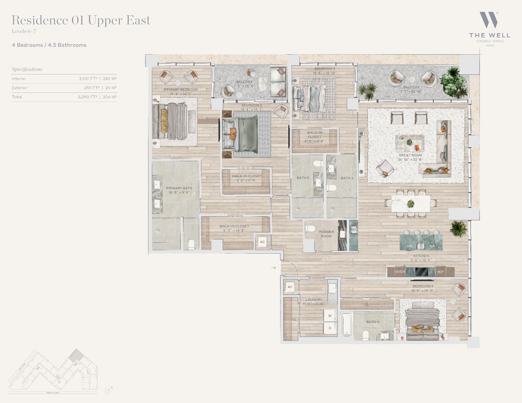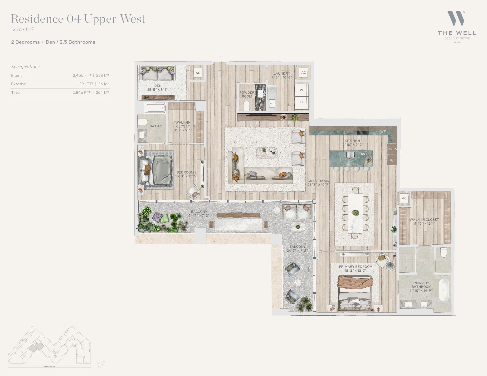 The WELL Coconut Grove introduces a new residential vision where wellness is woven into everyday living, set within one of Miami’s most established and naturally rich neighborhoods. Rising at 2835 Tigertail Avenue, the building comprises 194 residences across eight floors, including select townhomes and ground floor lofts, all designed with an intentional focus on light, air, and balance. Floor plans are generous and thoughtfully arranged, offering expansive glass, open layouts, and private balconies or terraces in every residence. From the outset, the architecture reflects a calm, grounded presence, with a coral stone façade that nods to Coconut Grove’s historic character while embracing a modern indoor outdoor lifestyle rooted in nature.Inside the residences, design and wellness are inseparable. Neutral engineered wood floors, expansive windows, and open living spaces create a soothing foundation, while kitchens are outfitted with quartzite countertops, custom Italkraft Italian cabinetry, and a premium suite of Sub Zero, Wolf, and ASKO appliances. Thoughtful details include Kraus Kore kitchen sinks with integrated accessories, Grohe faucets offering filtered and chilled still and sparkling water, built in wine refrigerators, and specialty wellness focused kitchen tools. Primary bedrooms feature finished walk in closets with integrated red light therapy, while select residences include flex spaces designed for meditation, fitness, or in home wellness treatments. Bathrooms elevate daily routines with natural stone surfaces, Dornbracht rain showers, illuminated mirrors, freestanding tubs in select homes, and steam showers in larger residences, reinforcing a restorative experience throughout the home.