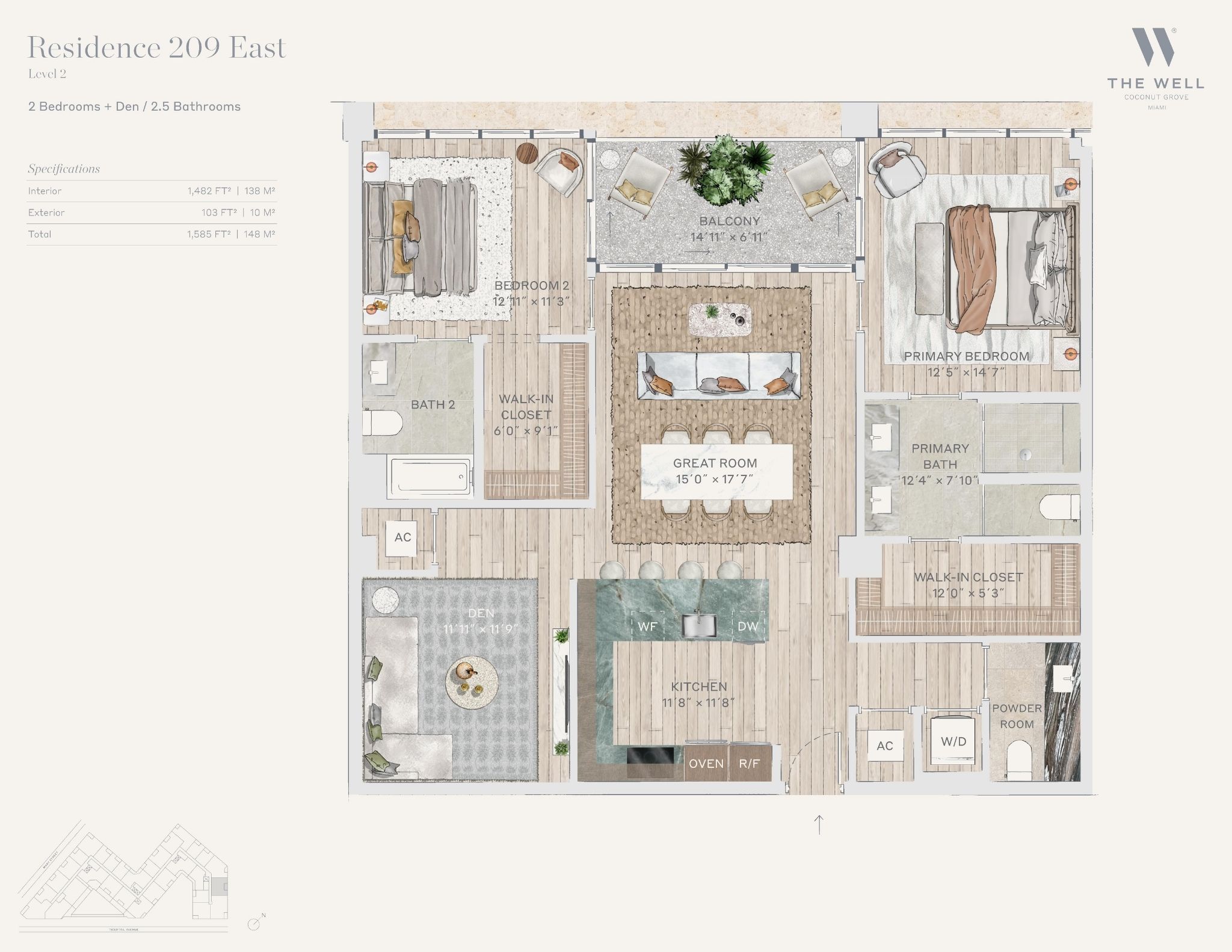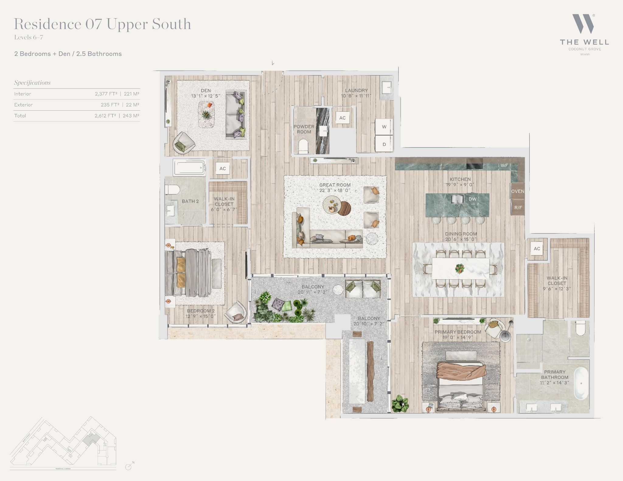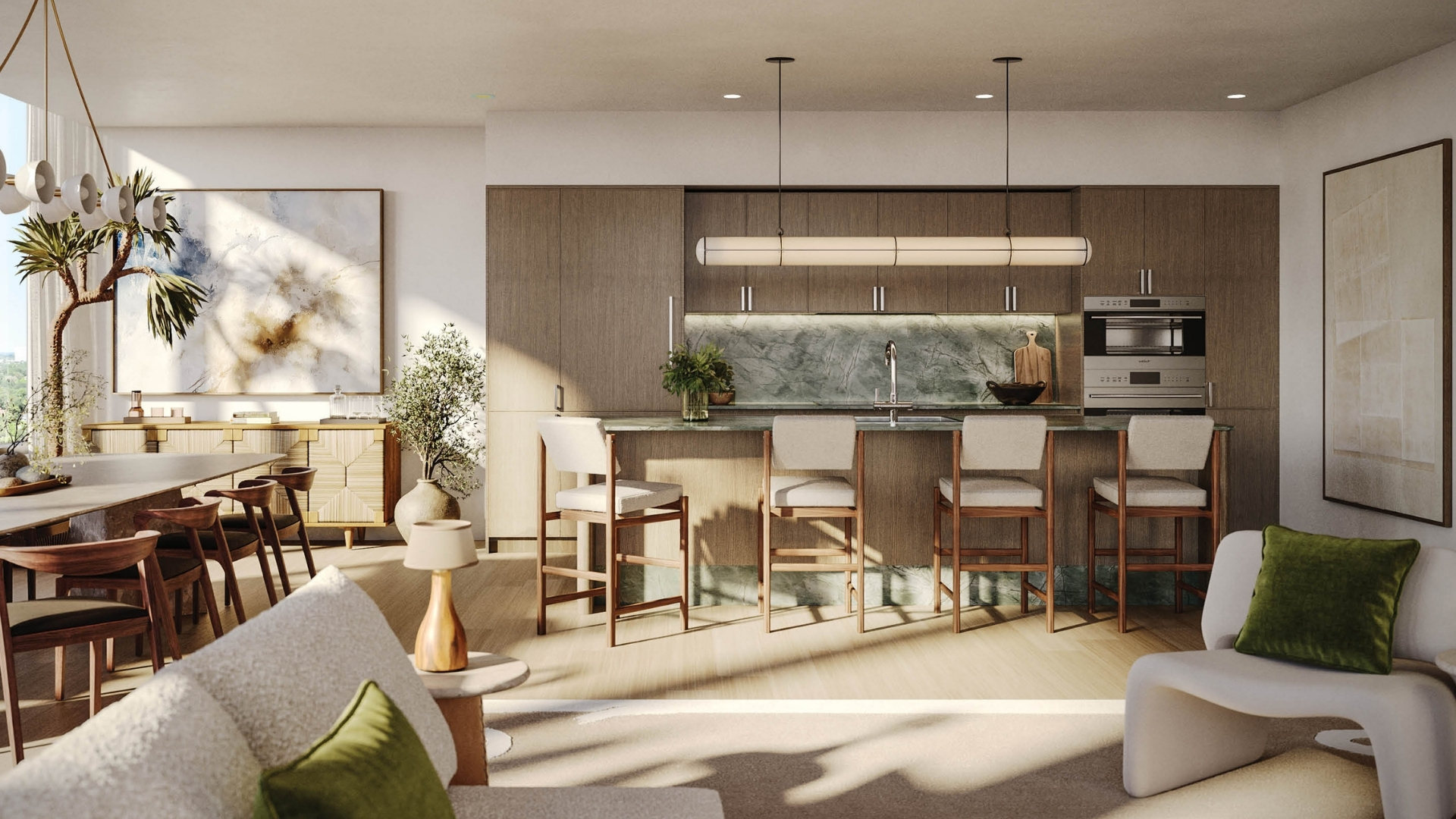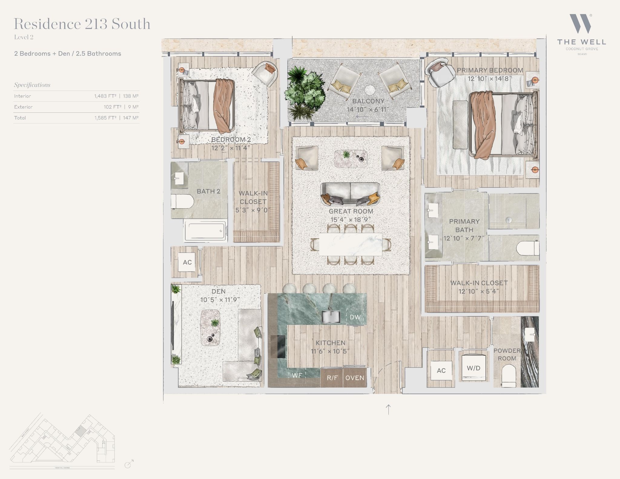 The WELL Coconut Grove introduces a new residential vision where wellness is woven into everyday living, set within one of Miami’s most established and naturally rich neighborhoods. Rising at 2835 Tigertail Avenue, the building comprises 194 residences across eight floors, including select townhomes and ground floor lofts, all designed with an intentional focus on light, air, and balance. Floor plans are generous and thoughtfully arranged, offering expansive glass, open layouts, and private balconies or terraces in every residence. From the outset, the architecture reflects a calm, grounded presence, with a coral stone façade that nods to Coconut Grove’s historic character while embracing a modern indoor outdoor lifestyle rooted in nature.Inside the residences, design and wellness are inseparable. Neutral engineered wood floors, expansive windows, and open living spaces create a soothing foundation, while kitchens are outfitted with quartzite countertops, custom Italkraft Italian cabinetry, and a premium suite of Sub Zero, Wolf, and ASKO appliances. Thoughtful details include Kraus Kore kitchen sinks with integrated accessories, Grohe faucets offering filtered and chilled still and sparkling water, built in wine refrigerators, and specialty wellness focused kitchen tools. Primary bedrooms feature finished walk in closets with integrated red light therapy, while select residences include flex spaces designed for meditation, fitness, or in home wellness treatments. Bathrooms elevate daily routines with natural stone surfaces, Dornbracht rain showers, illuminated mirrors, freestanding tubs in select homes, and steam showers in larger residences, reinforcing a restorative experience throughout the home.