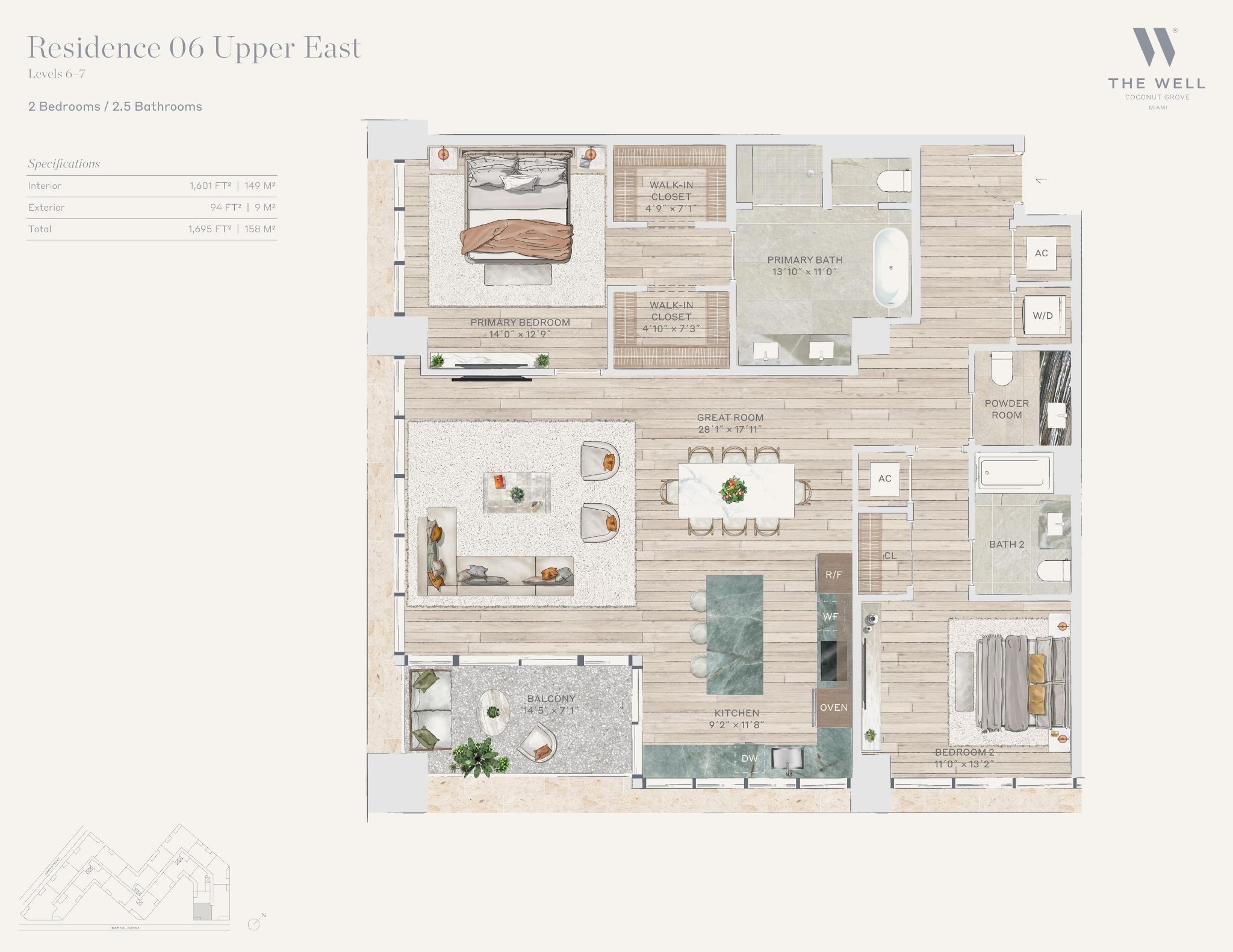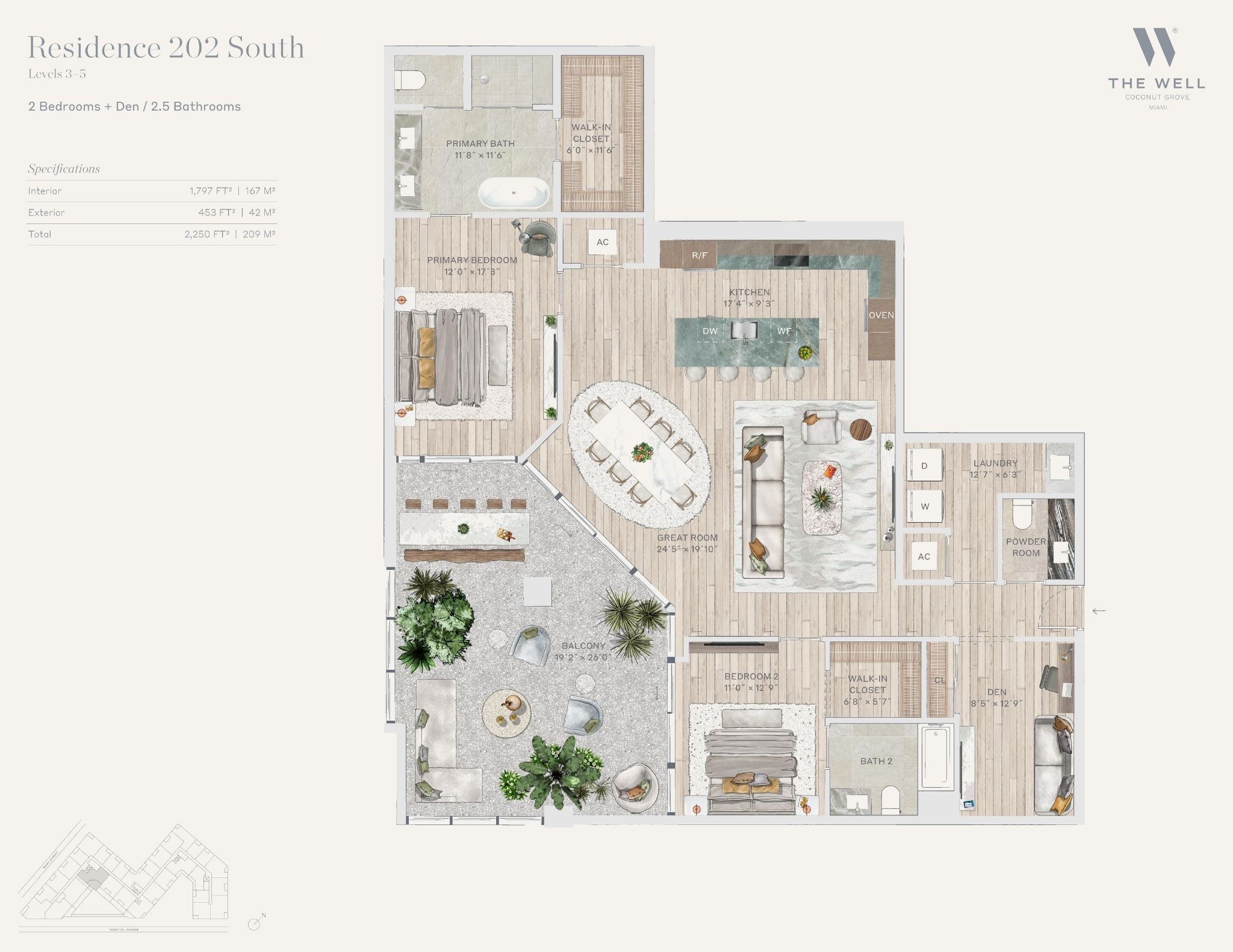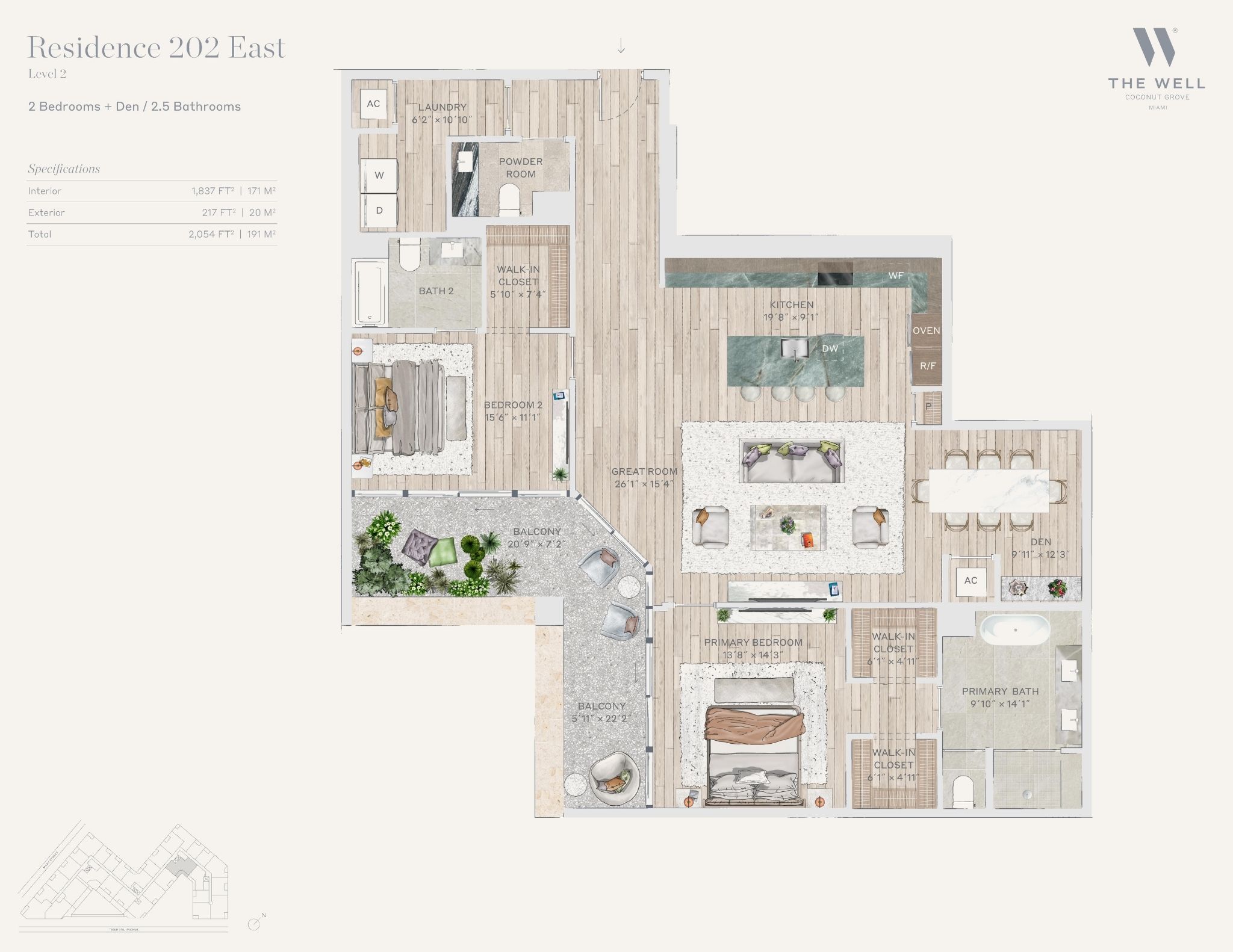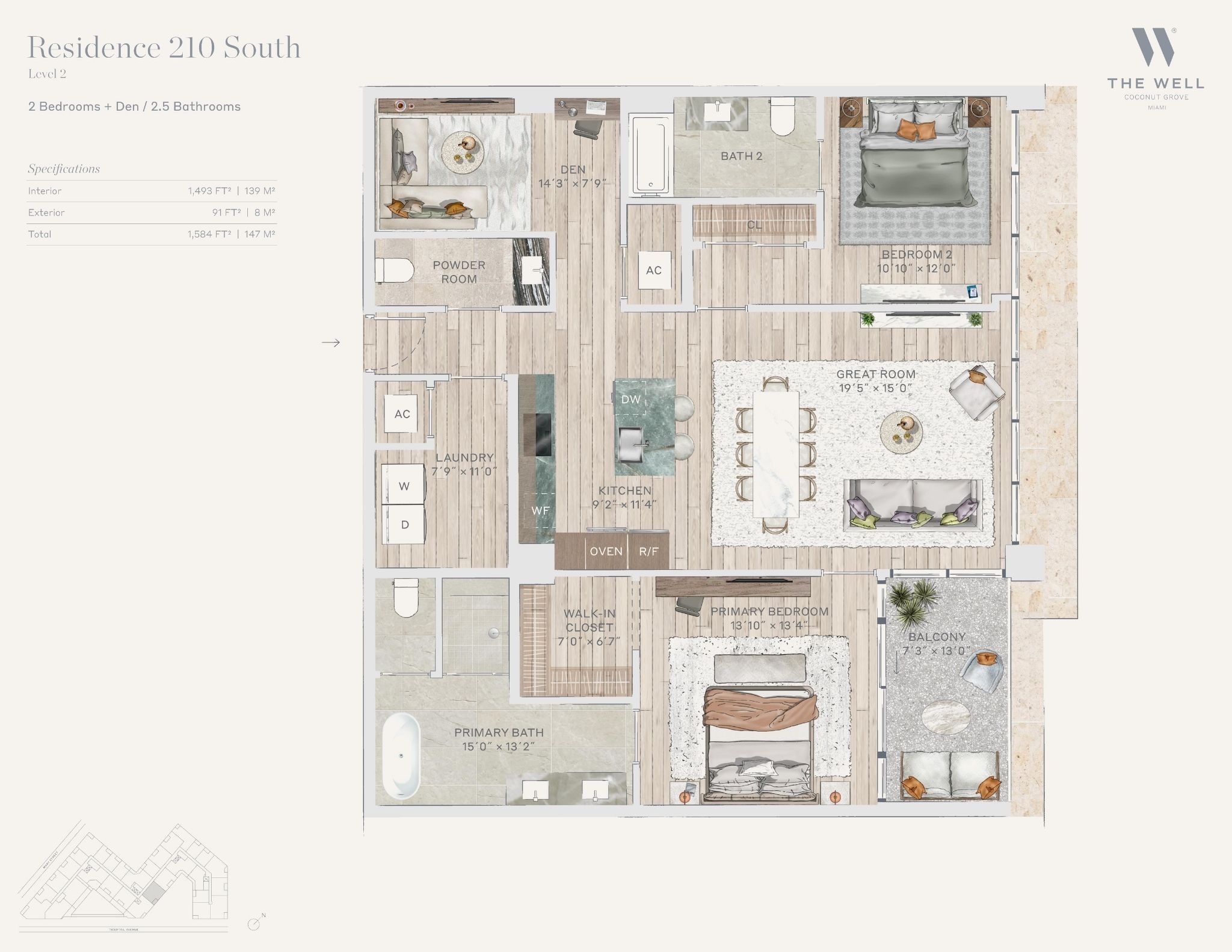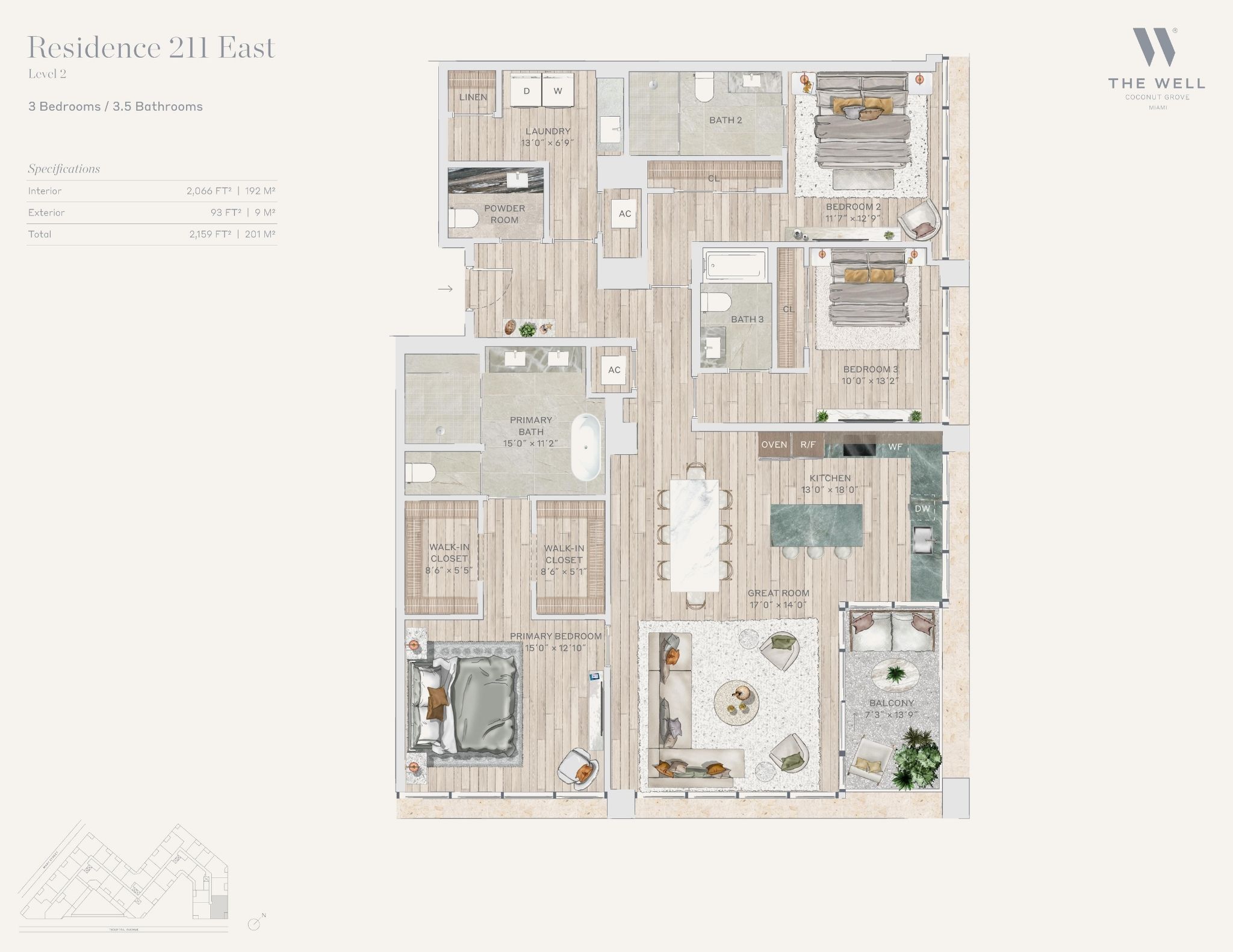 The WELL Coconut Grove introduces a new residential vision where wellness is woven into everyday living, set within one of Miami’s most established and naturally rich neighborhoods. Rising at 2835 Tigertail Avenue, the building comprises 194 residences across eight floors, including select townhomes and ground floor lofts, all designed with an intentional focus on light, air, and balance. Floor plans are generous and thoughtfully arranged, offering expansive glass, open layouts, and private balconies or terraces in every residence. From the outset, the architecture reflects a calm, grounded presence, with a coral stone façade that nods to Coconut Grove’s historic character while embracing a modern indoor outdoor lifestyle rooted in nature.Inside the residences, design and wellness are inseparable. Neutral engineered wood floors, expansive windows, and open living spaces create a soothing foundation, while kitchens are outfitted with quartzite countertops, custom Italkraft Italian cabinetry, and a premium suite of Sub Zero, Wolf, and ASKO appliances. Thoughtful details include Kraus Kore kitchen sinks with integrated accessories, Grohe faucets offering filtered and chilled still and sparkling water, built in wine refrigerators, and specialty wellness focused kitchen tools. Primary bedrooms feature finished walk in closets with integrated red light therapy, while select residences include flex spaces designed for meditation, fitness, or in home wellness treatments. Bathrooms elevate daily routines with natural stone surfaces, Dornbracht rain showers, illuminated mirrors, freestanding tubs in select homes, and steam showers in larger residences, reinforcing a restorative experience throughout the home.