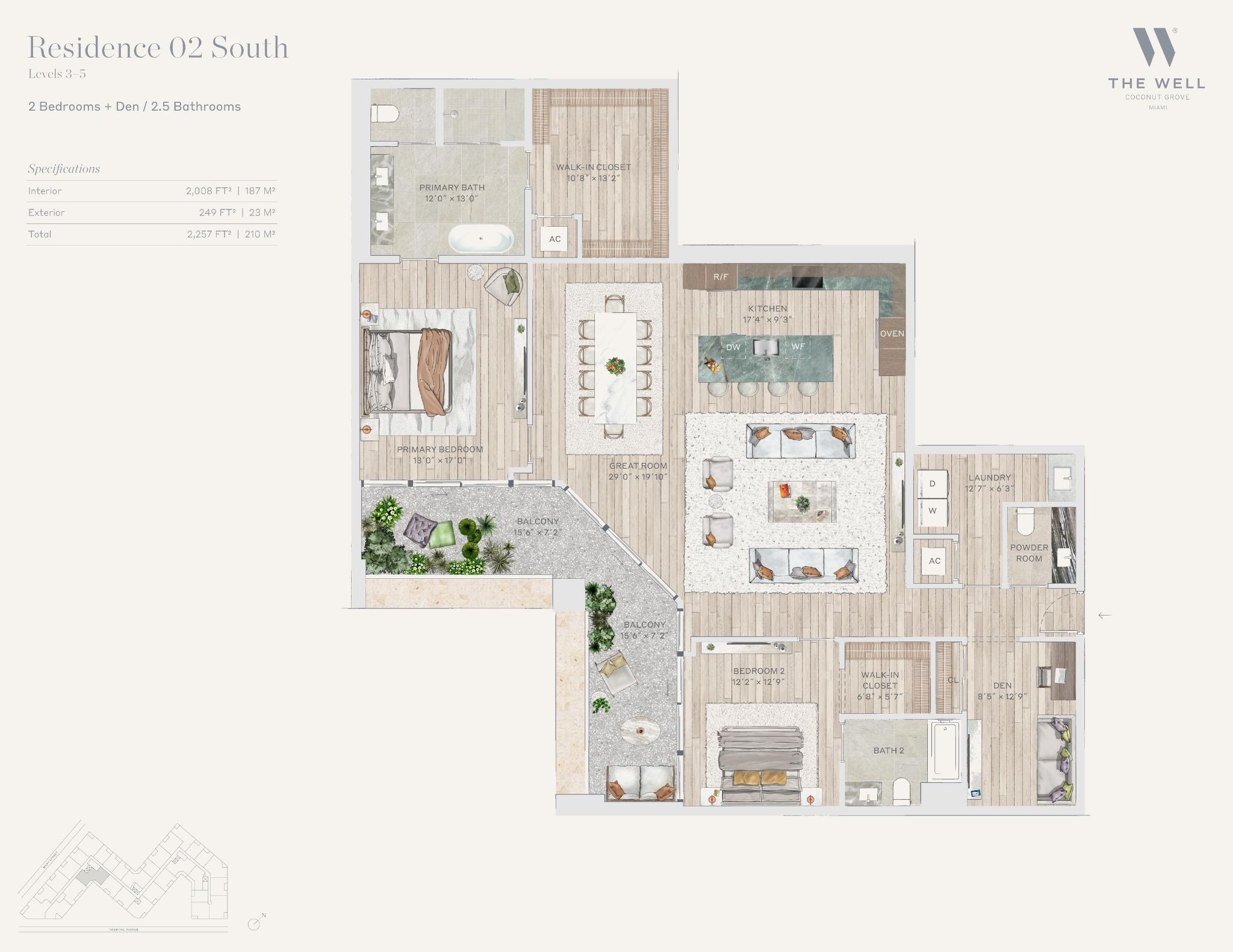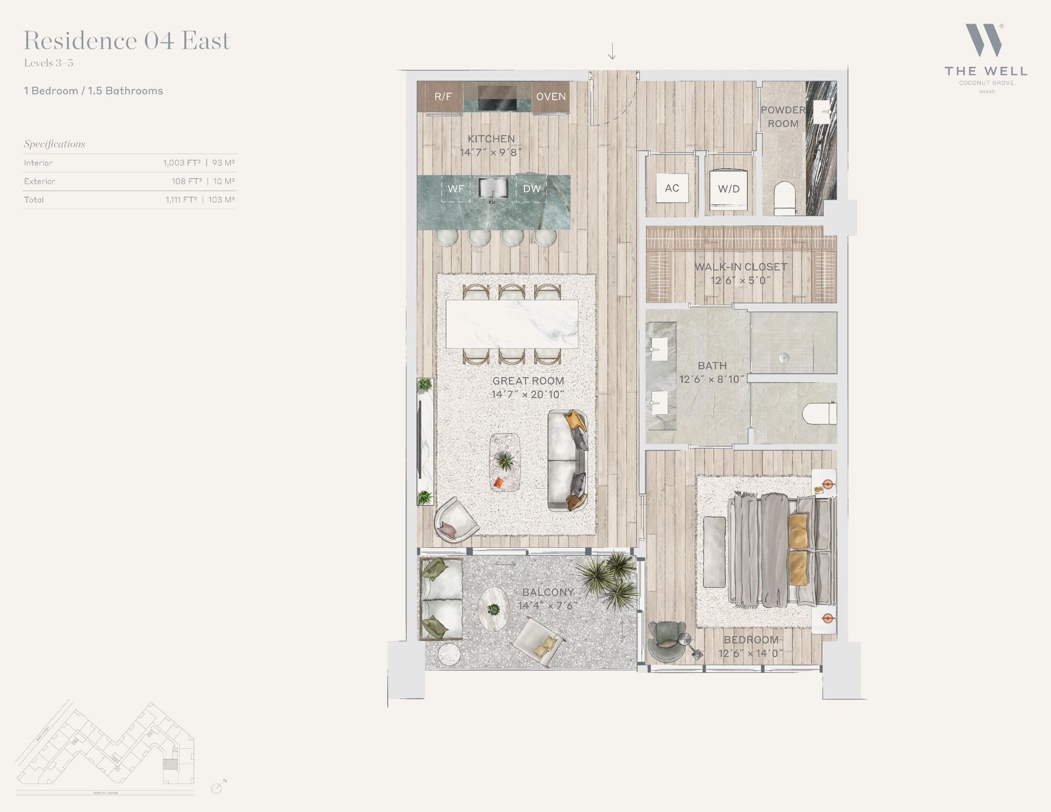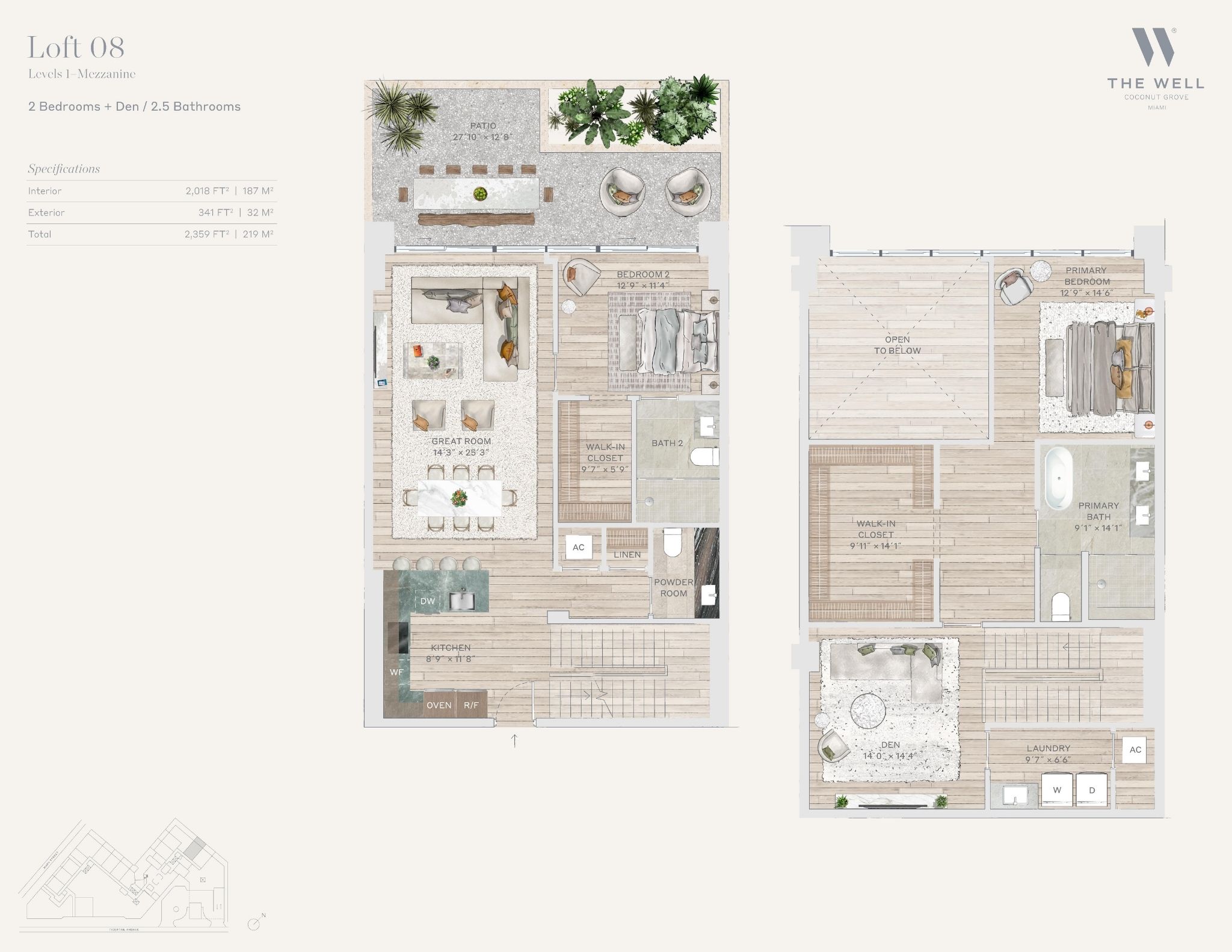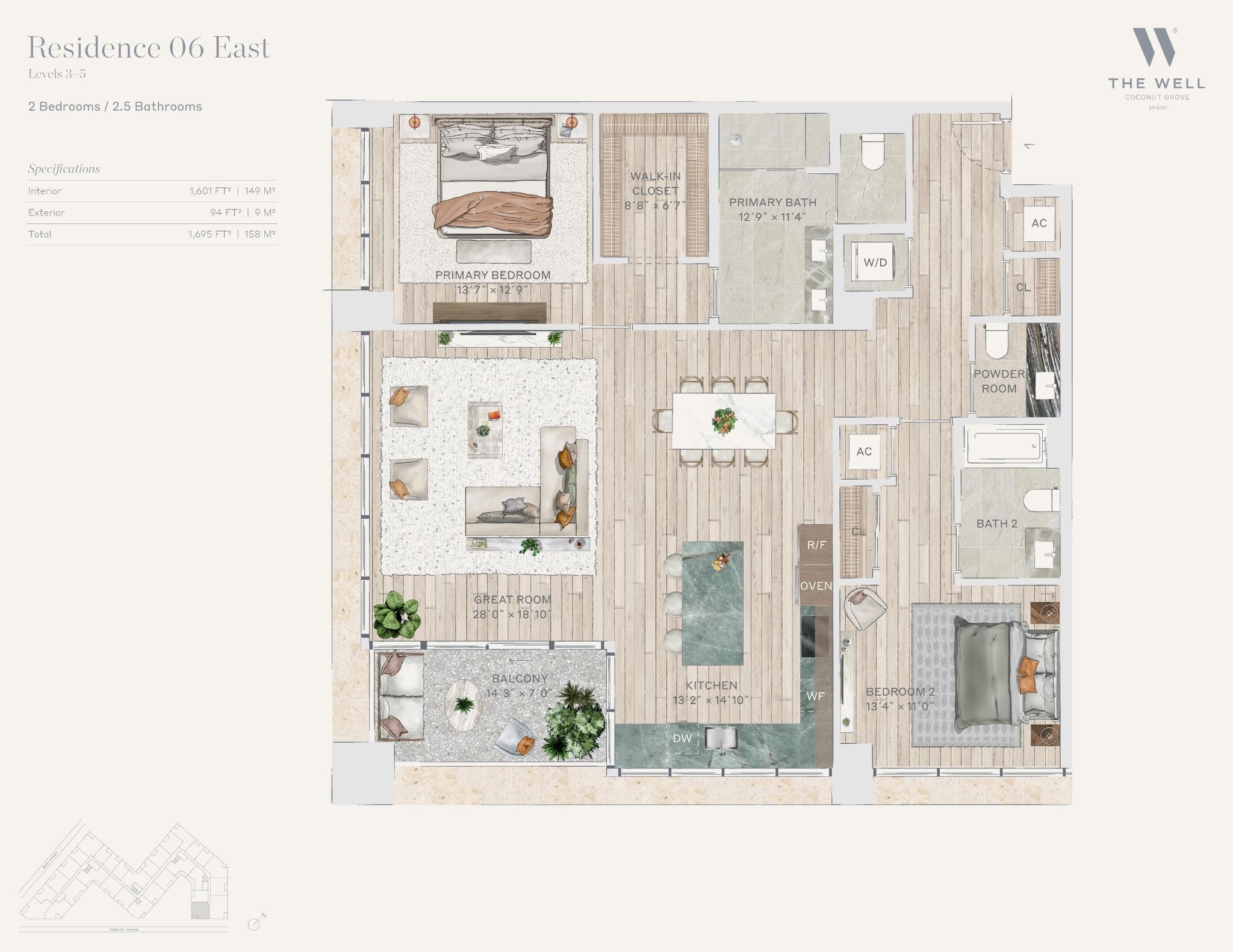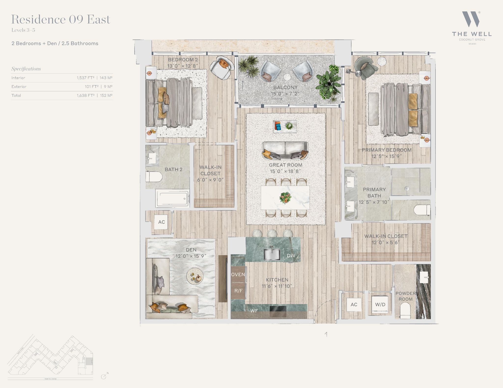 The WELL Coconut Grove introduces a new residential vision where wellness is woven into everyday living, set within one of Miami’s most established and naturally rich neighborhoods. Rising at 2835 Tigertail Avenue, the building comprises 194 residences across eight floors, including select townhomes and ground floor lofts, all designed with an intentional focus on light, air, and balance. Floor plans are generous and thoughtfully arranged, offering expansive glass, open layouts, and private balconies or terraces in every residence. From the outset, the architecture reflects a calm, grounded presence, with a coral stone façade that nods to Coconut Grove’s historic character while embracing a modern indoor outdoor lifestyle rooted in nature.Inside the residences, design and wellness are inseparable. Neutral engineered wood floors, expansive windows, and open living spaces create a soothing foundation, while kitchens are outfitted with quartzite countertops, custom Italkraft Italian cabinetry, and a premium suite of Sub Zero, Wolf, and ASKO appliances. Thoughtful details include Kraus Kore kitchen sinks with integrated accessories, Grohe faucets offering filtered and chilled still and sparkling water, built in wine refrigerators, and specialty wellness focused kitchen tools. Primary bedrooms feature finished walk in closets with integrated red light therapy, while select residences include flex spaces designed for meditation, fitness, or in home wellness treatments. Bathrooms elevate daily routines with natural stone surfaces, Dornbracht rain showers, illuminated mirrors, freestanding tubs in select homes, and steam showers in larger residences, reinforcing a restorative experience throughout the home.
