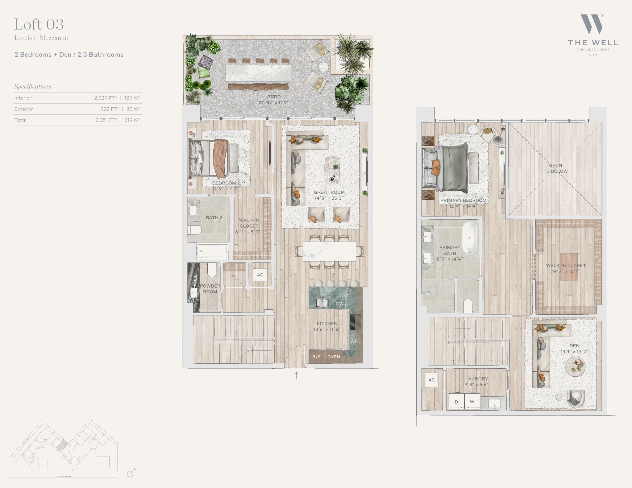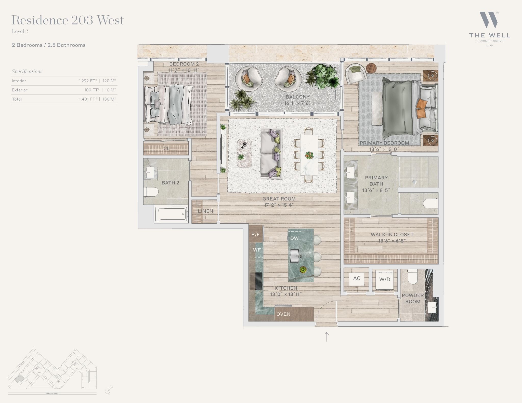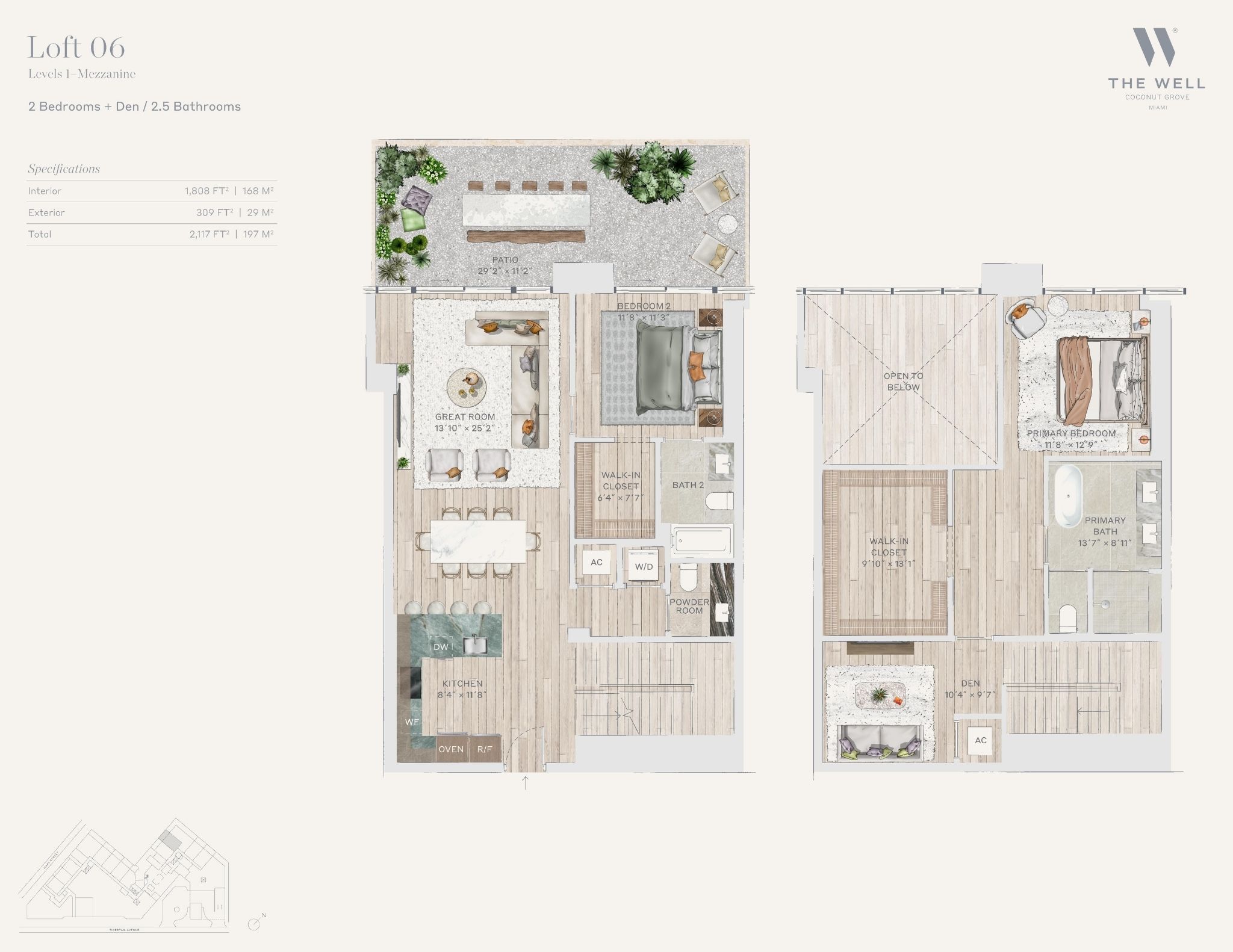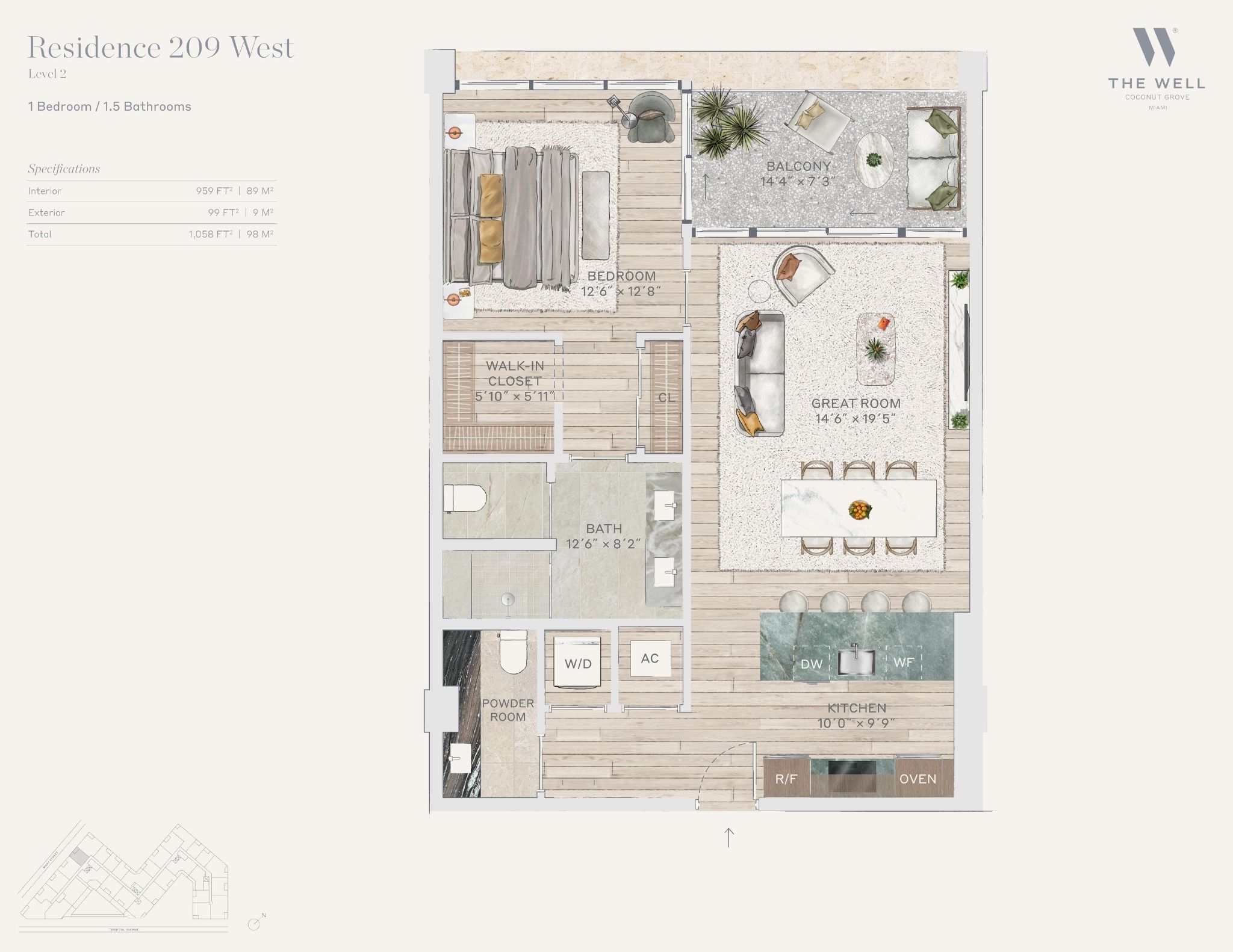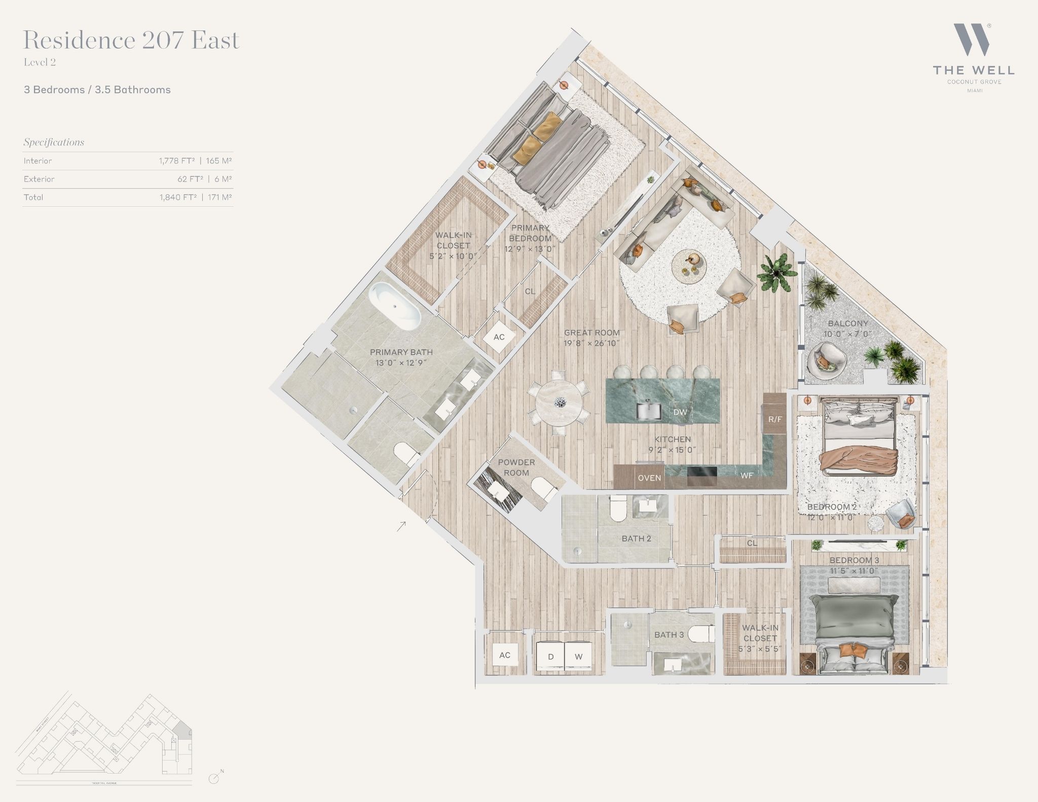 The WELL Coconut Grove introduces a new residential vision where wellness is woven into everyday living, set within one of Miami’s most established and naturally rich neighborhoods. Rising at 2835 Tigertail Avenue, the building comprises 194 residences across eight floors, including select townhomes and ground floor lofts, all designed with an intentional focus on light, air, and balance. Floor plans are generous and thoughtfully arranged, offering expansive glass, open layouts, and private balconies or terraces in every residence. From the outset, the architecture reflects a calm, grounded presence, with a coral stone façade that nods to Coconut Grove’s historic character while embracing a modern indoor outdoor lifestyle rooted in nature.Inside the residences, design and wellness are inseparable. Neutral engineered wood floors, expansive windows, and open living spaces create a soothing foundation, while kitchens are outfitted with quartzite countertops, custom Italkraft Italian cabinetry, and a premium suite of Sub Zero, Wolf, and ASKO appliances. Thoughtful details include Kraus Kore kitchen sinks with integrated accessories, Grohe faucets offering filtered and chilled still and sparkling water, built in wine refrigerators, and specialty wellness focused kitchen tools. Primary bedrooms feature finished walk in closets with integrated red light therapy, while select residences include flex spaces designed for meditation, fitness, or in home wellness treatments. Bathrooms elevate daily routines with natural stone surfaces, Dornbracht rain showers, illuminated mirrors, freestanding tubs in select homes, and steam showers in larger residences, reinforcing a restorative experience throughout the home.