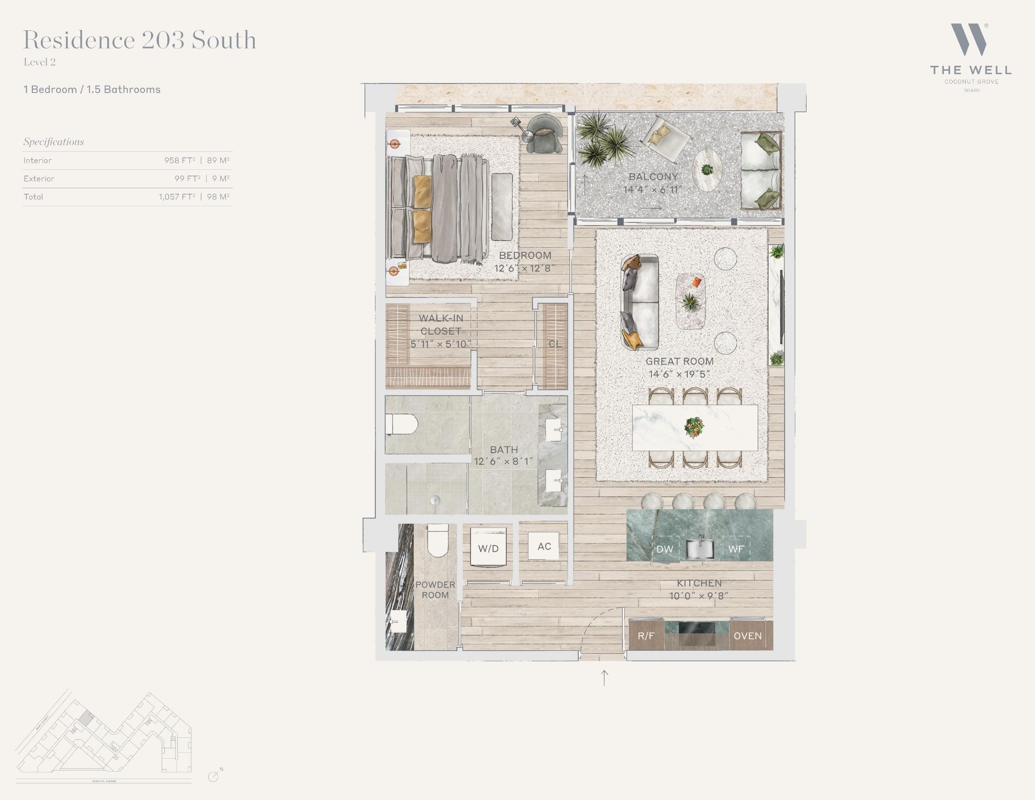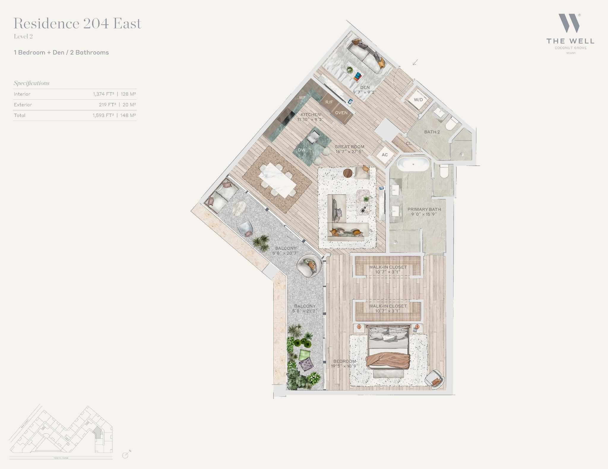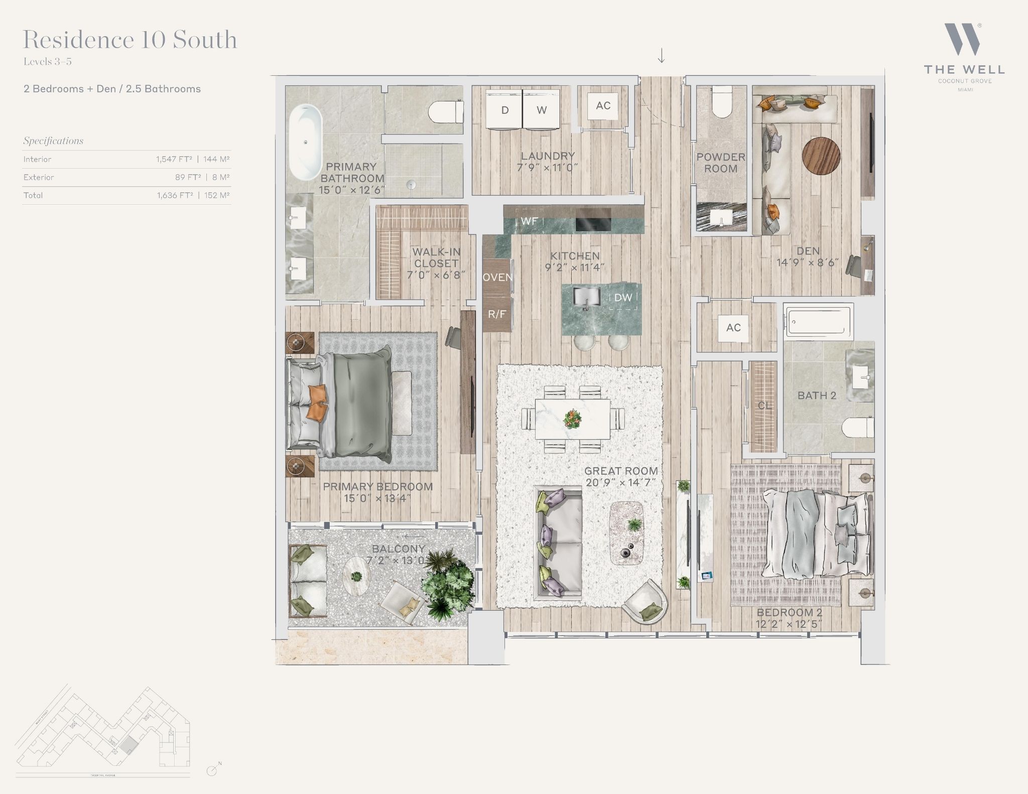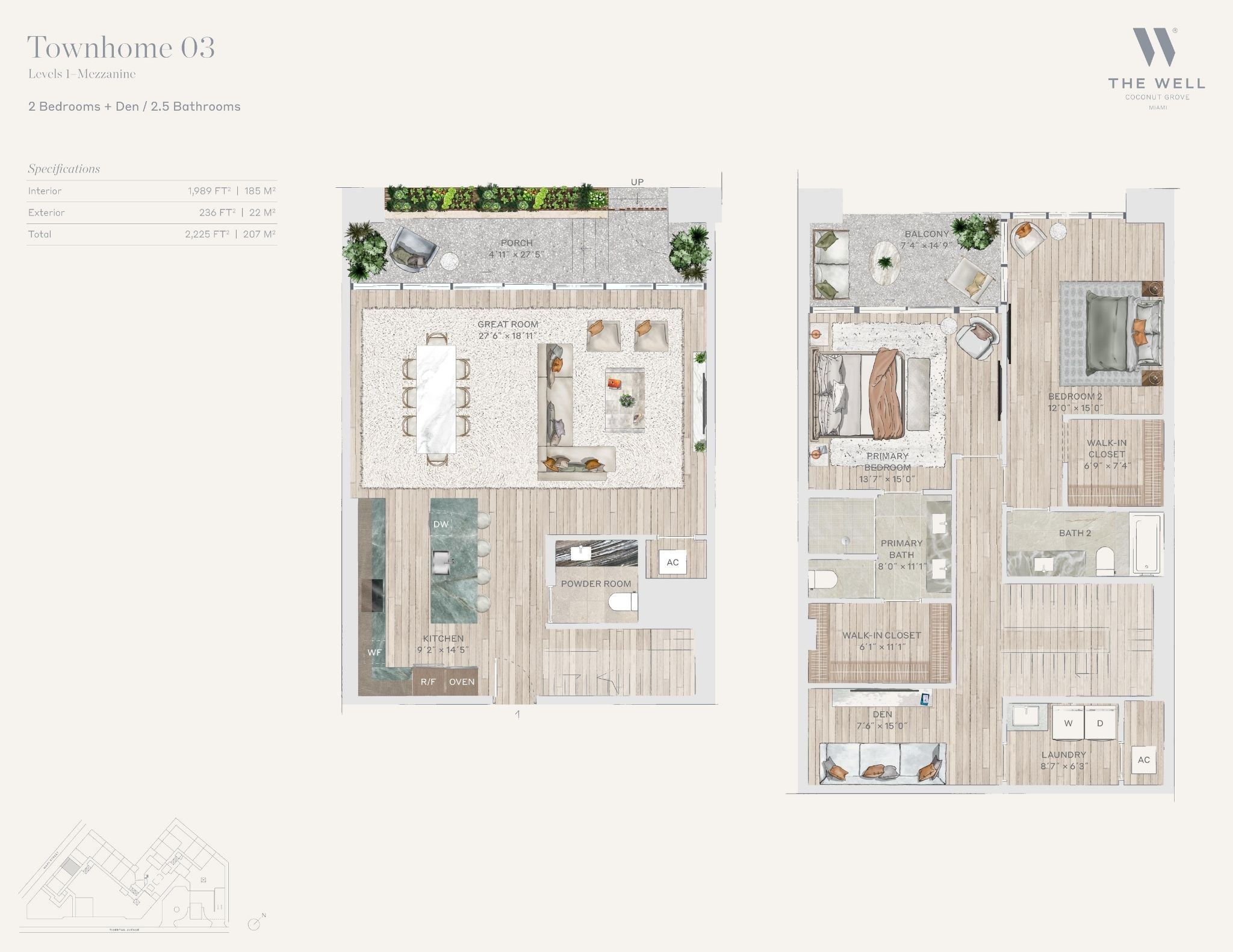 The WELL Coconut Grove introduces a new residential vision where wellness is woven into everyday living, set within one of Miami’s most established and naturally rich neighborhoods. Rising at 2835 Tigertail Avenue, the building comprises 194 residences across eight floors, including select townhomes and ground floor lofts, all designed with an intentional focus on light, air, and balance. Floor plans are generous and thoughtfully arranged, offering expansive glass, open layouts, and private balconies or terraces in every residence. From the outset, the architecture reflects a calm, grounded presence, with a coral stone façade that nods to Coconut Grove’s historic character while embracing a modern indoor outdoor lifestyle rooted in nature.Inside the residences, design and wellness are inseparable. Neutral engineered wood floors, expansive windows, and open living spaces create a soothing foundation, while kitchens are outfitted with quartzite countertops, custom Italkraft Italian cabinetry, and a premium suite of Sub Zero, Wolf, and ASKO appliances. Thoughtful details include Kraus Kore kitchen sinks with integrated accessories, Grohe faucets offering filtered and chilled still and sparkling water, built in wine refrigerators, and specialty wellness focused kitchen tools. Primary bedrooms feature finished walk in closets with integrated red light therapy, while select residences include flex spaces designed for meditation, fitness, or in home wellness treatments. Bathrooms elevate daily routines with natural stone surfaces, Dornbracht rain showers, illuminated mirrors, freestanding tubs in select homes, and steam showers in larger residences, reinforcing a restorative experience throughout the home.