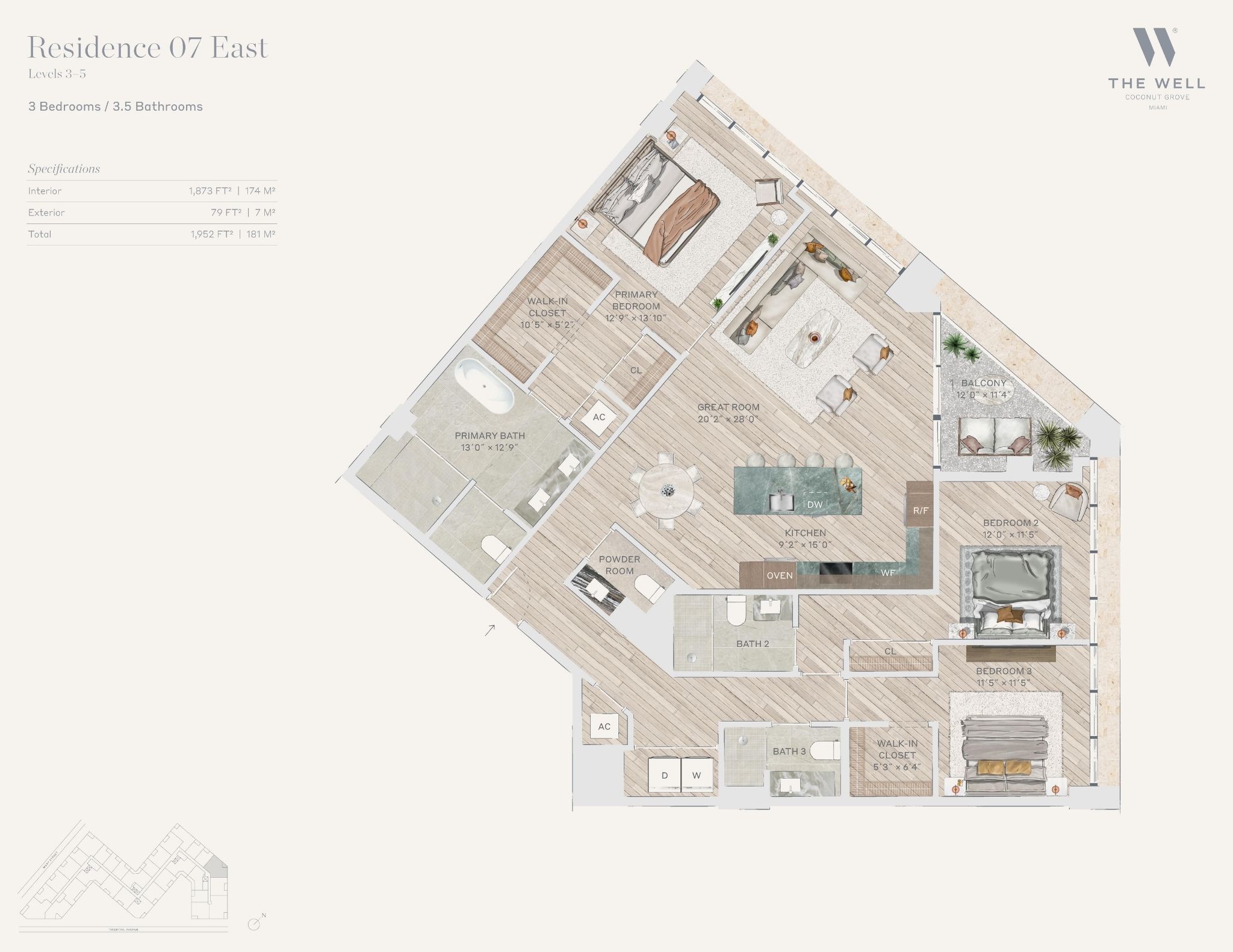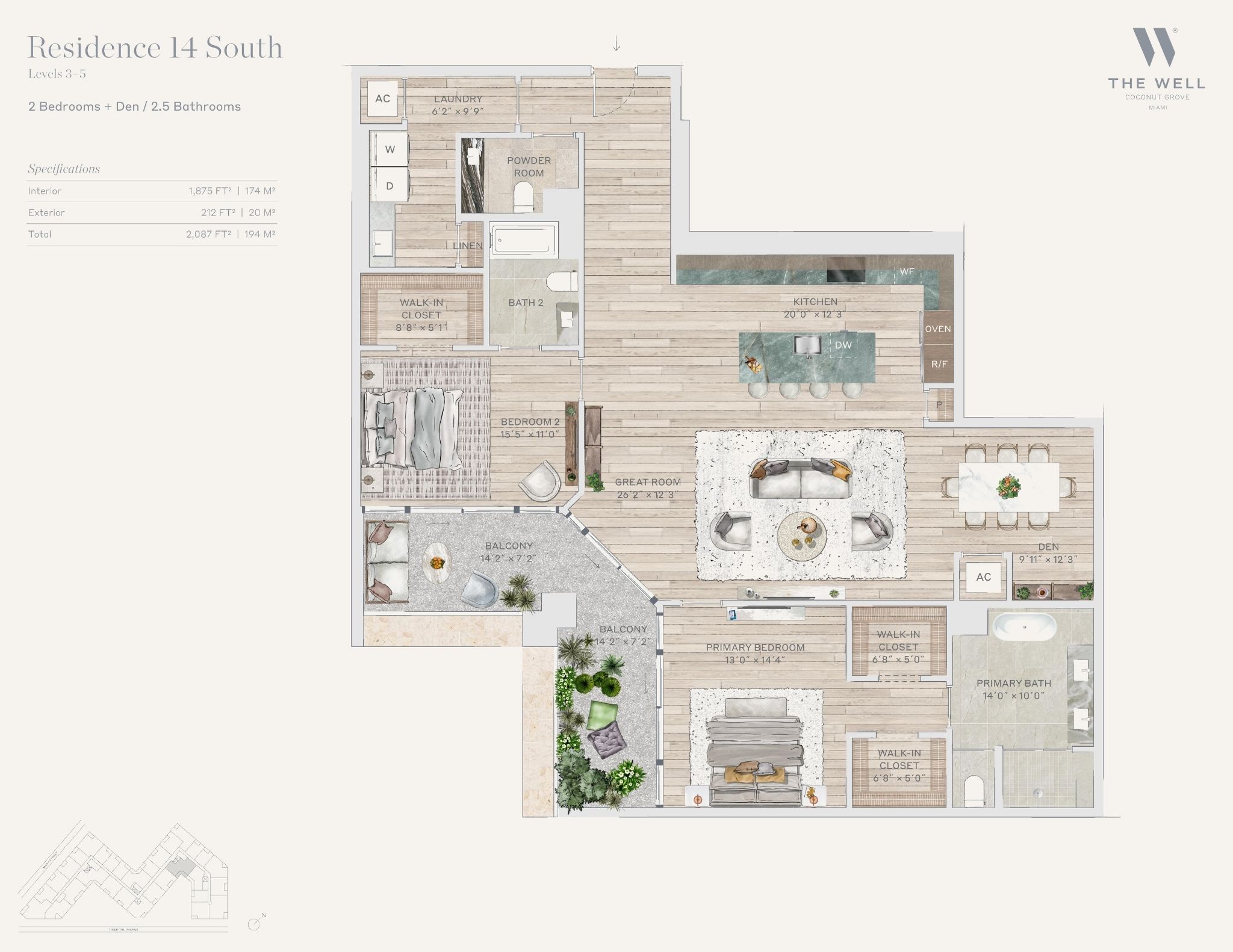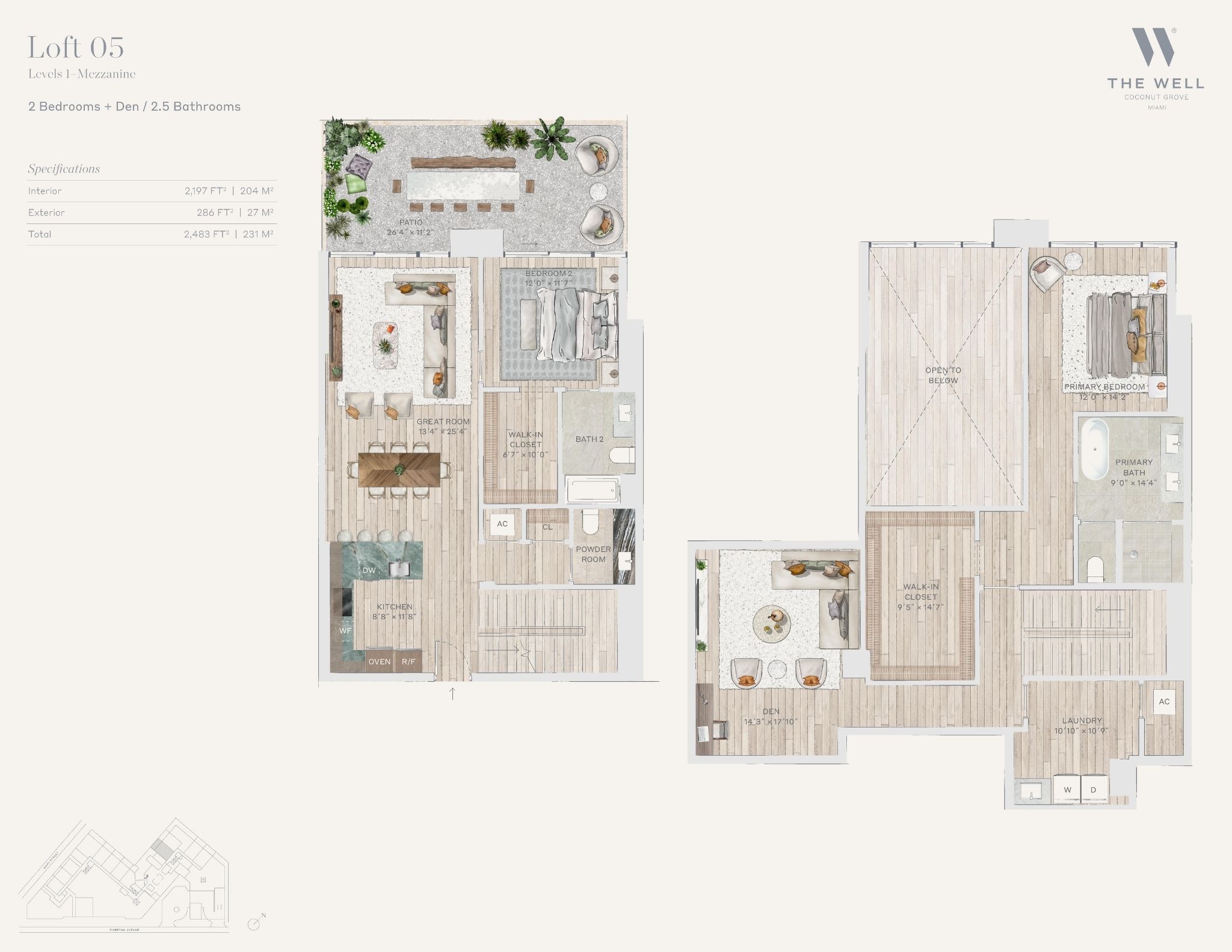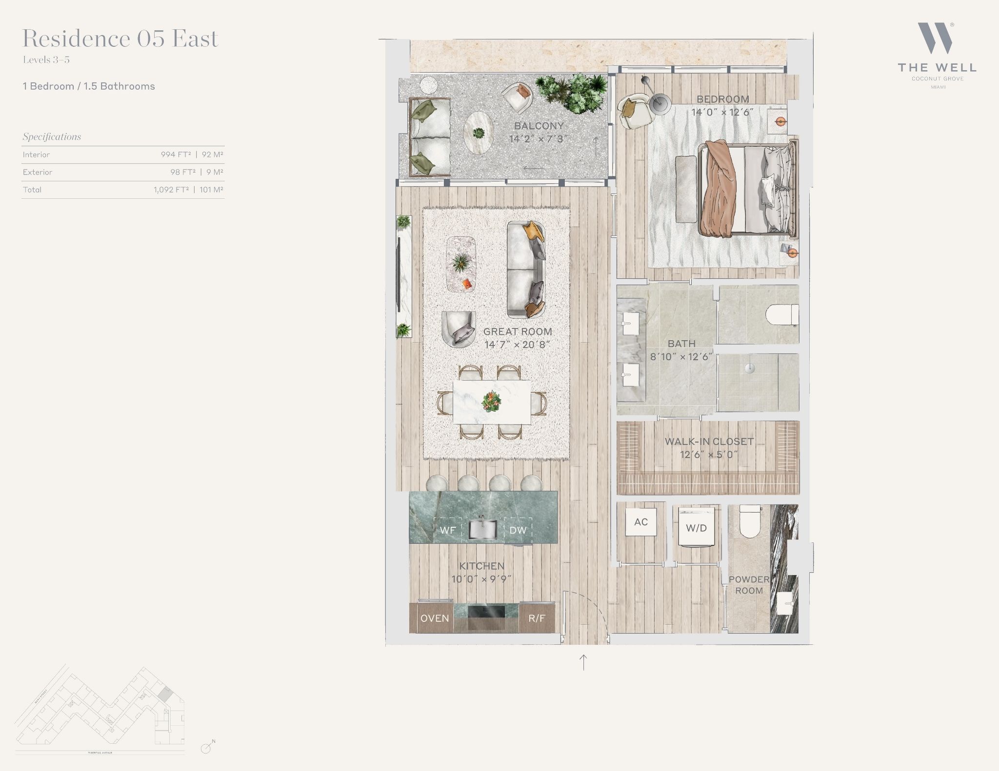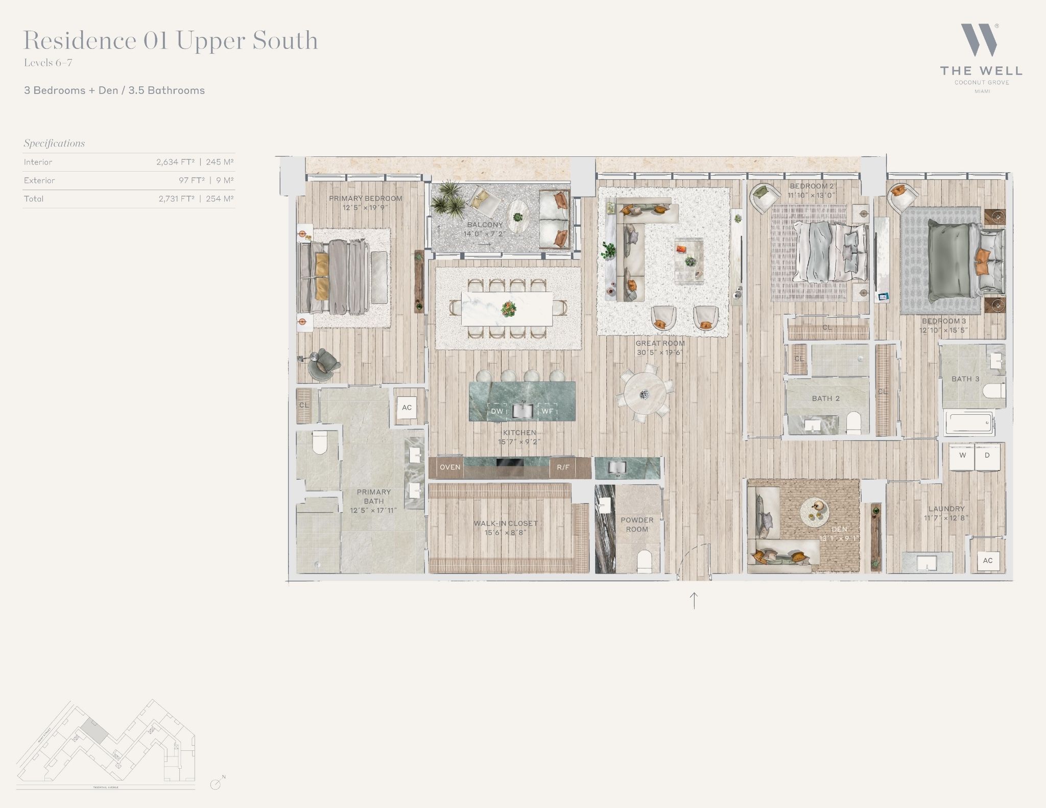 The WELL Coconut Grove introduces a new residential vision where wellness is woven into everyday living, set within one of Miami’s most established and naturally rich neighborhoods. Rising at 2835 Tigertail Avenue, the building comprises 194 residences across eight floors, including select townhomes and ground floor lofts, all designed with an intentional focus on light, air, and balance. Floor plans are generous and thoughtfully arranged, offering expansive glass, open layouts, and private balconies or terraces in every residence. From the outset, the architecture reflects a calm, grounded presence, with a coral stone façade that nods to Coconut Grove’s historic character while embracing a modern indoor outdoor lifestyle rooted in nature.Inside the residences, design and wellness are inseparable. Neutral engineered wood floors, expansive windows, and open living spaces create a soothing foundation, while kitchens are outfitted with quartzite countertops, custom Italkraft Italian cabinetry, and a premium suite of Sub Zero, Wolf, and ASKO appliances. Thoughtful details include Kraus Kore kitchen sinks with integrated accessories, Grohe faucets offering filtered and chilled still and sparkling water, built in wine refrigerators, and specialty wellness focused kitchen tools. Primary bedrooms feature finished walk in closets with integrated red light therapy, while select residences include flex spaces designed for meditation, fitness, or in home wellness treatments. Bathrooms elevate daily routines with natural stone surfaces, Dornbracht rain showers, illuminated mirrors, freestanding tubs in select homes, and steam showers in larger residences, reinforcing a restorative experience throughout the home.